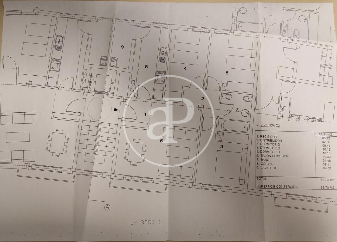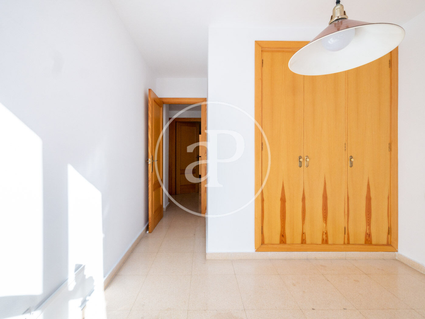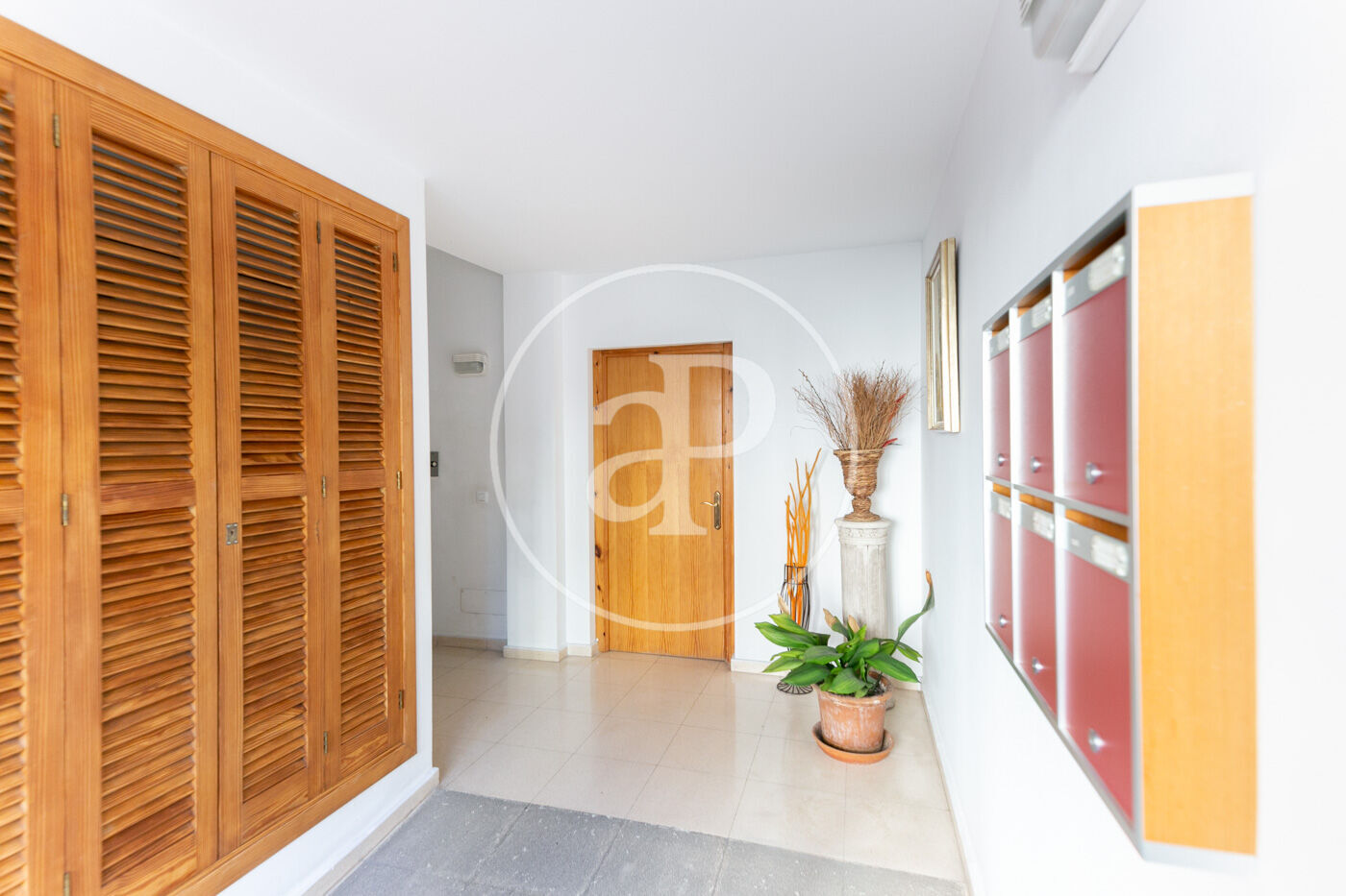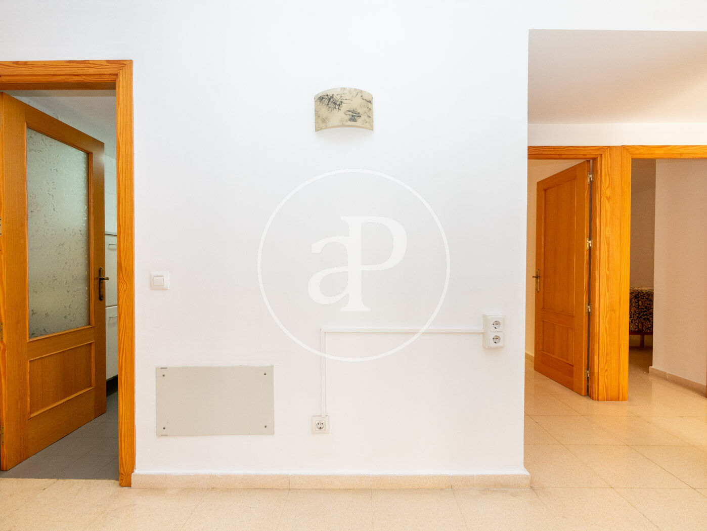 El pis disposa de tres habitacions totalment exteriors, totes amb armaris encastats i un bany complet amb dutxa. L'equipament inclou porta de seguretat, fusteria interior i exterior de fusta -l'exterior amb doble vidre-, terres de rajola hidràulica, aire condicionat, gas natural i aparcament opcional 30.000€ al qual pot accedir des de la mateixa finca.
