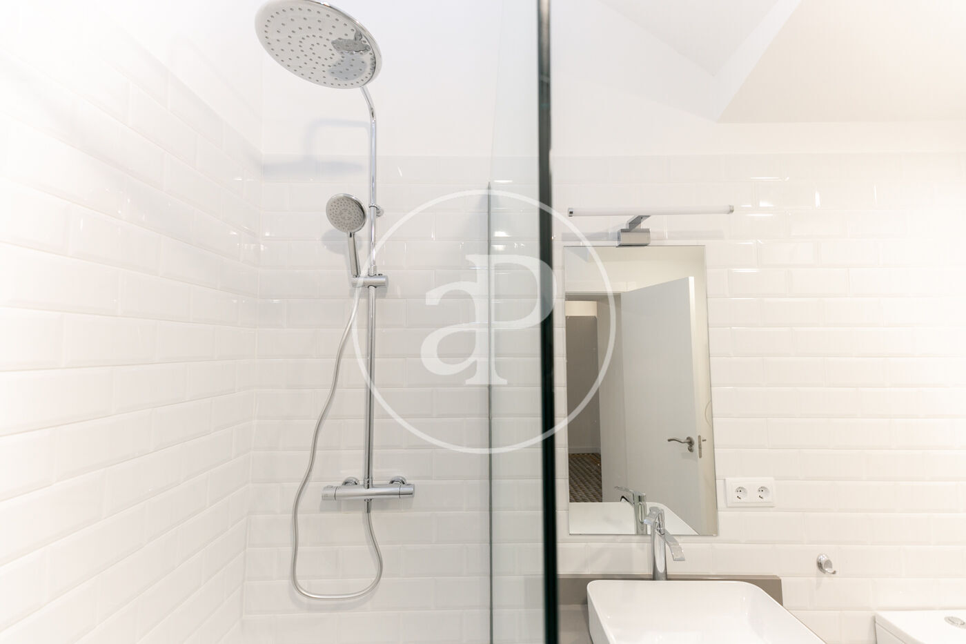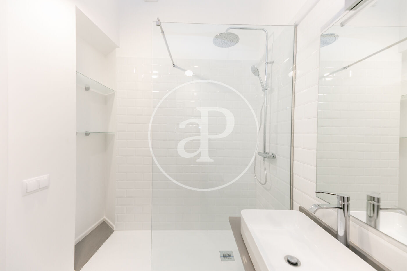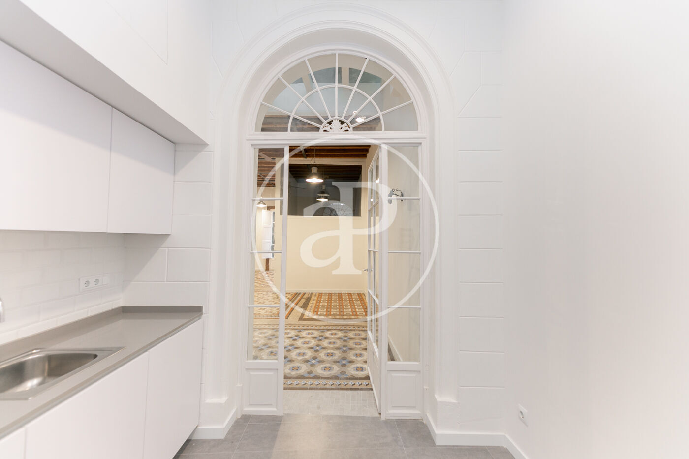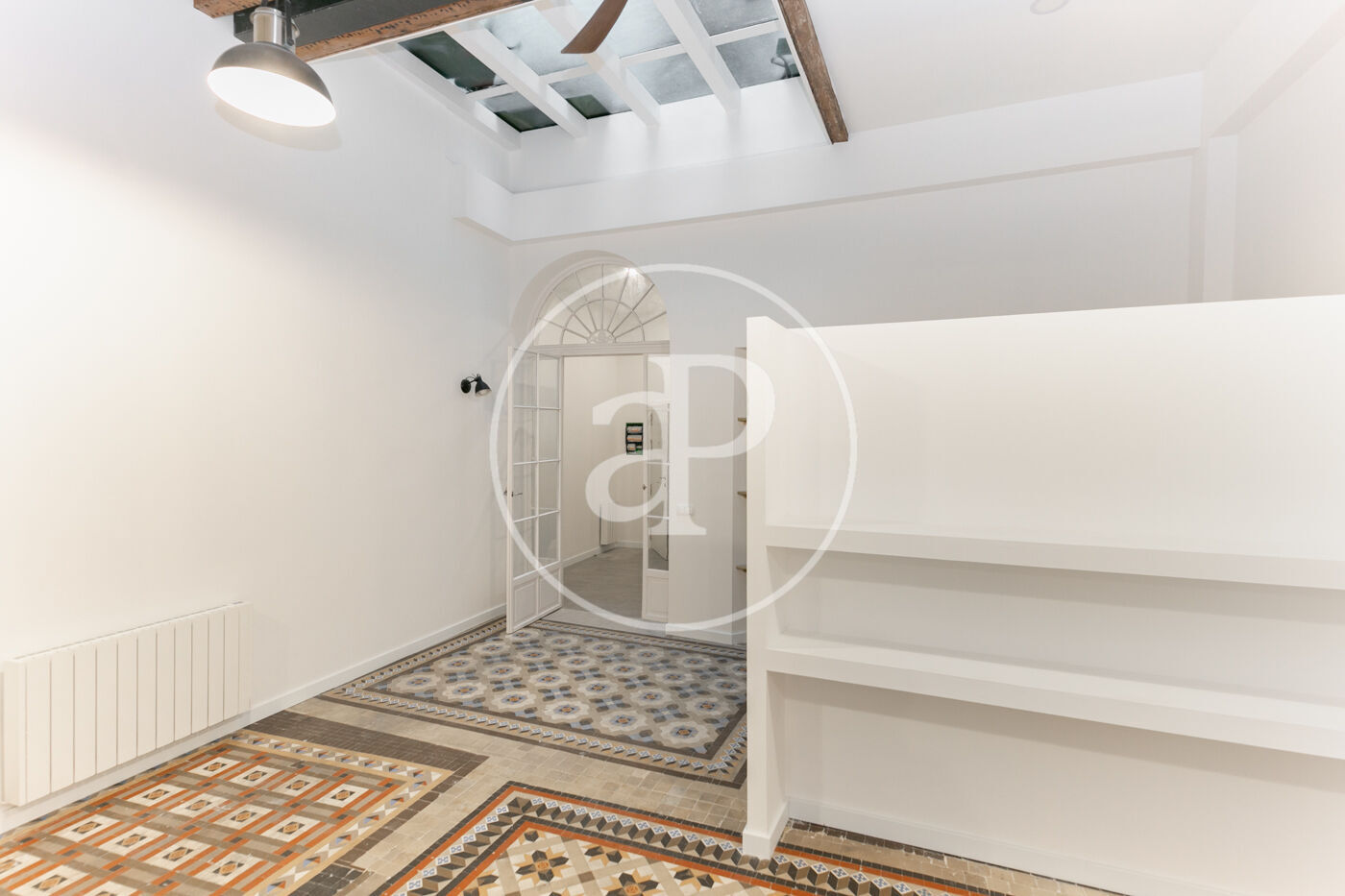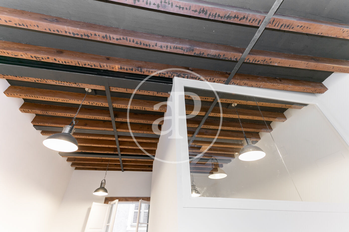 Tot el pis presenta una combinació de diferents tipus de sòl: de fusta, gres i hidràulics originals recuperats, parets blanques i sostres tradicionals amb bigues de fusta, portes d’època restaurades, radiadors elèctrics a totes les zones i ventiladors de sostre.