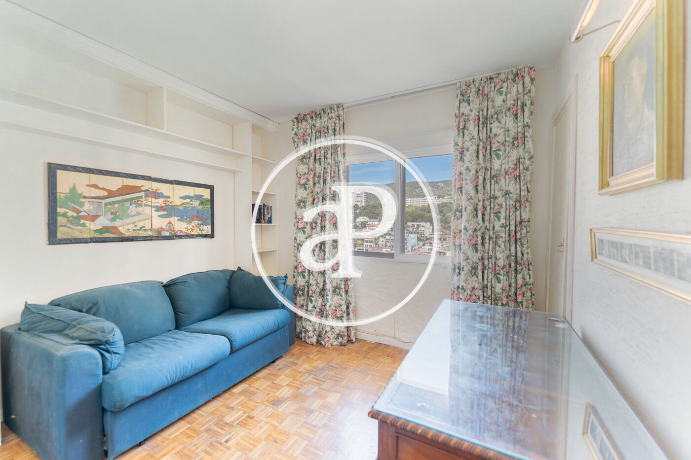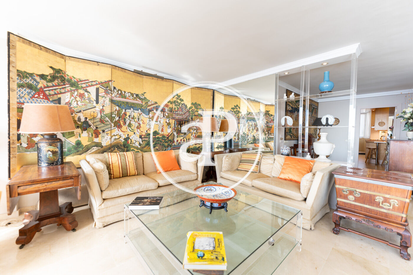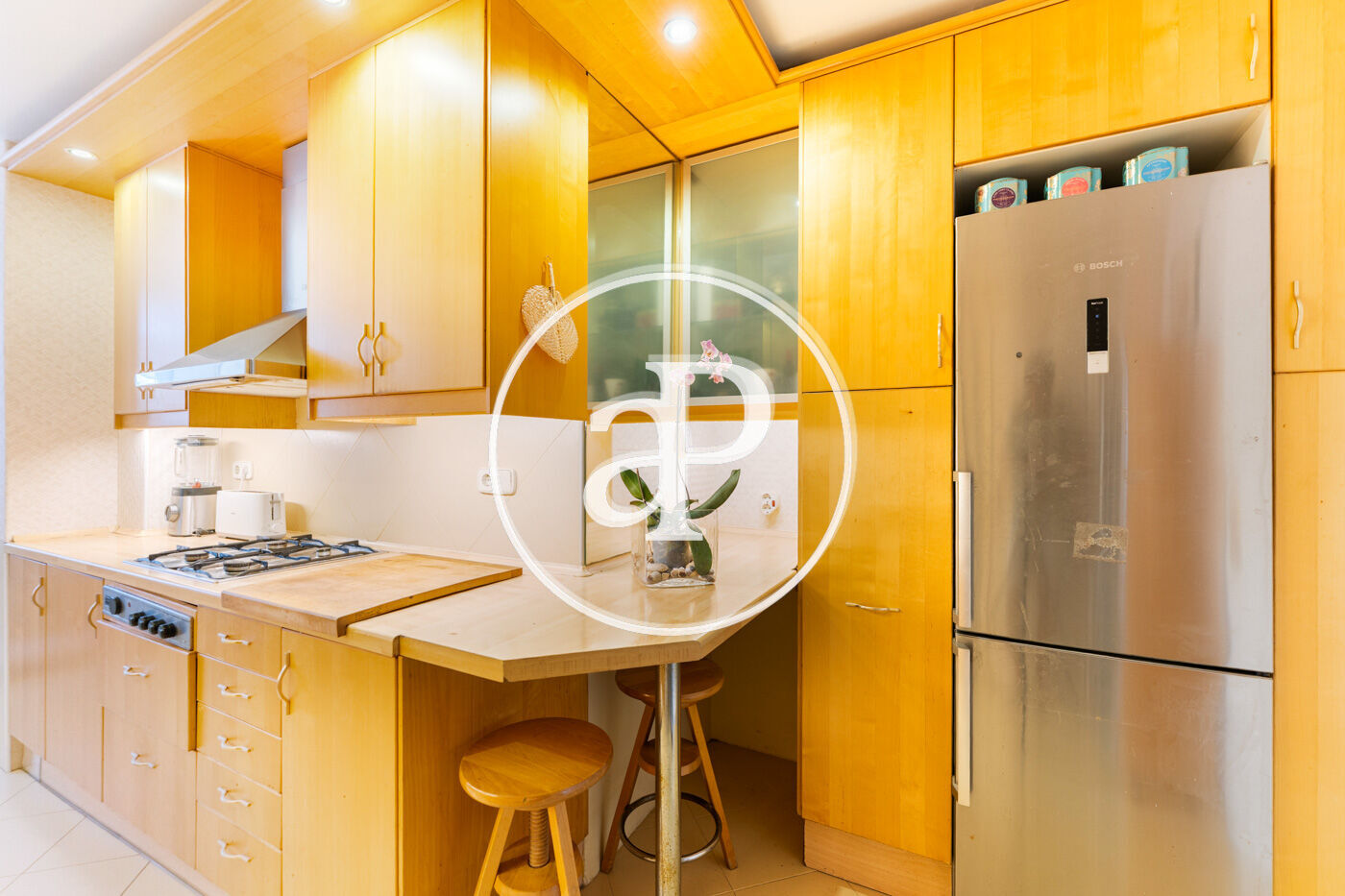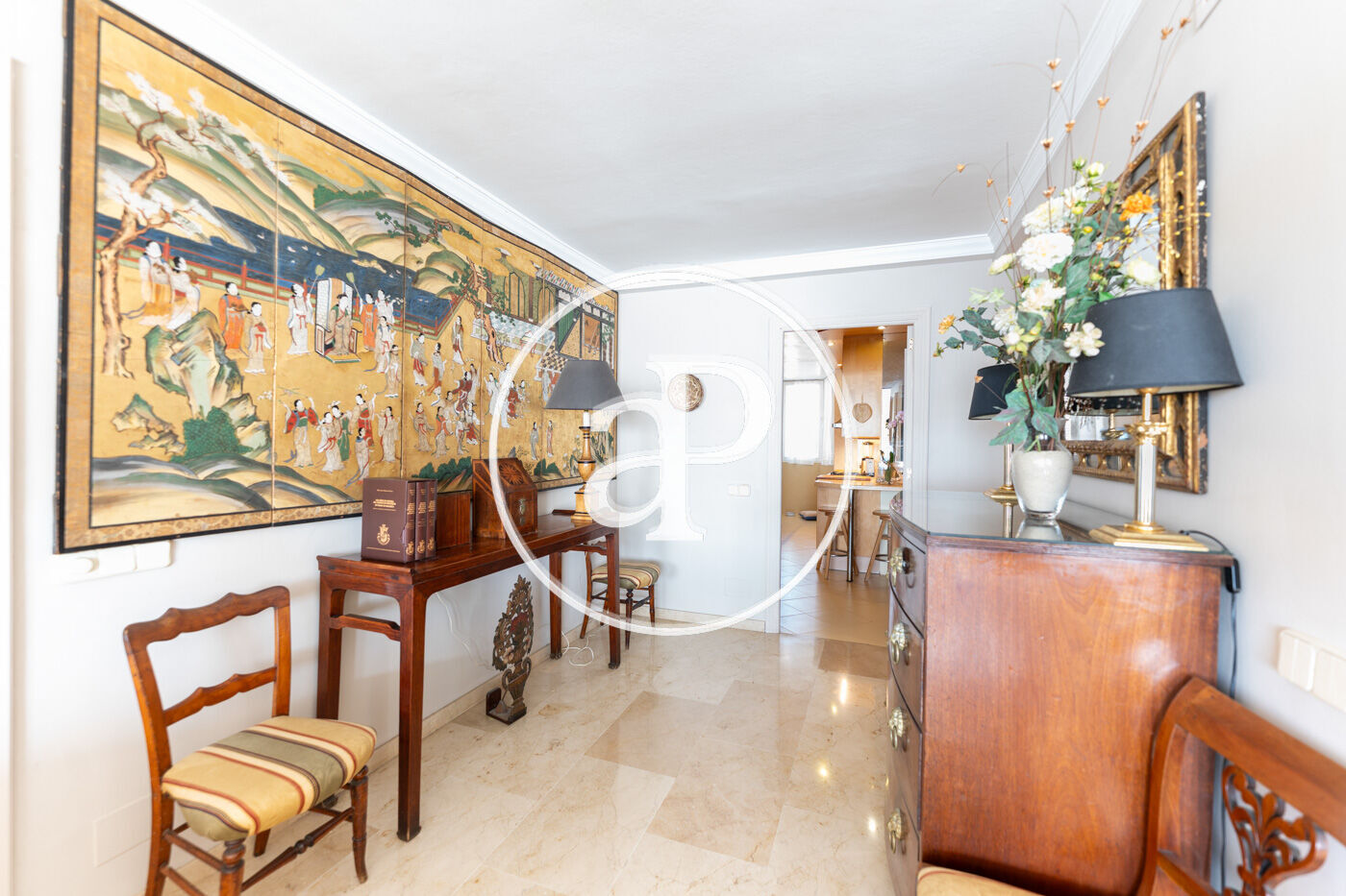 Situada a la sisena planta d’un edifici de vuit altures, accedim a la propietat per una de les dues portes, la principal o la de servei. Iniciem la visita a través del rebedor, que comunica amb un ampli saló-menjador, la cuina i el passadís que condueix a la part privada de la casa.