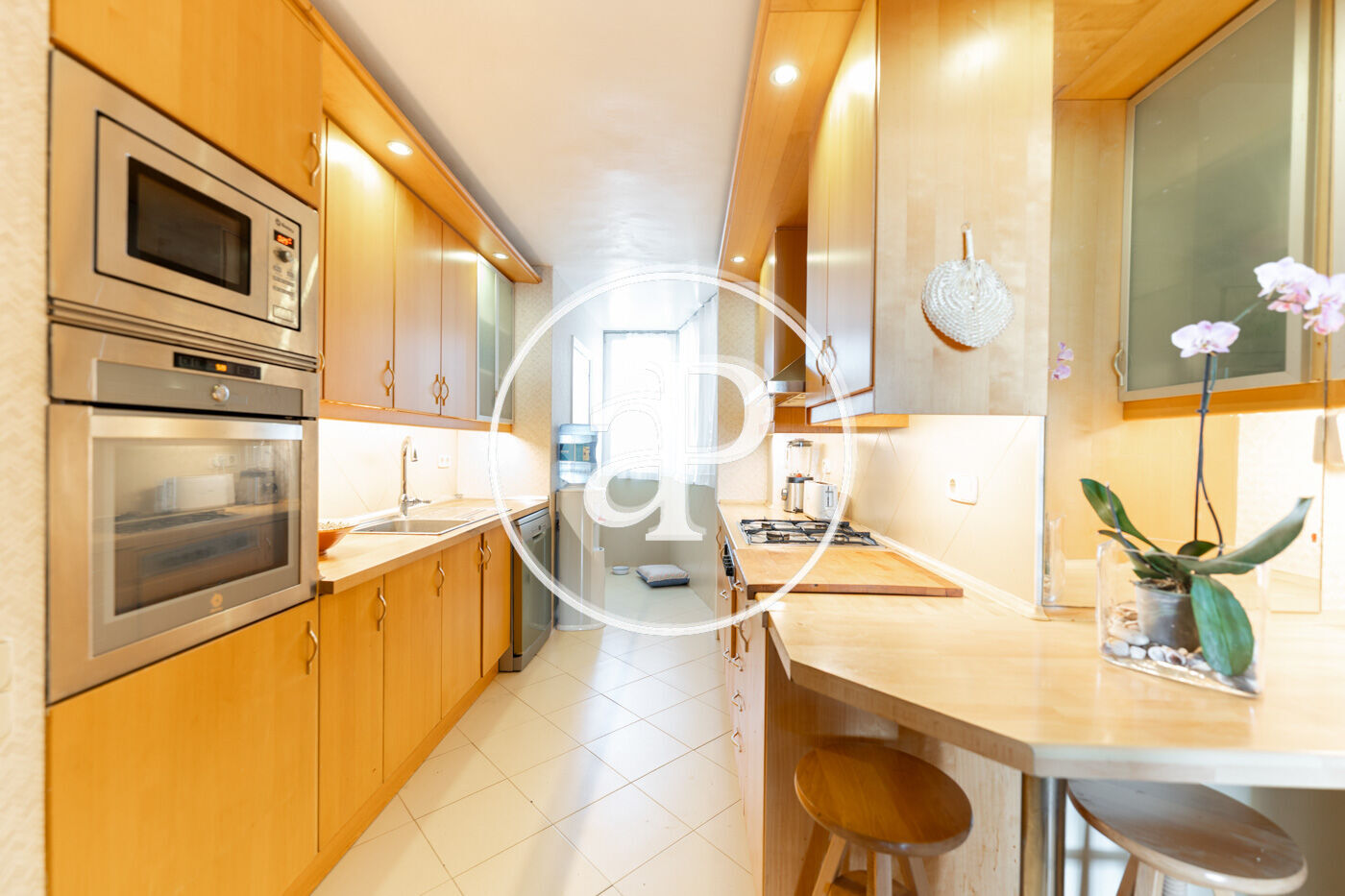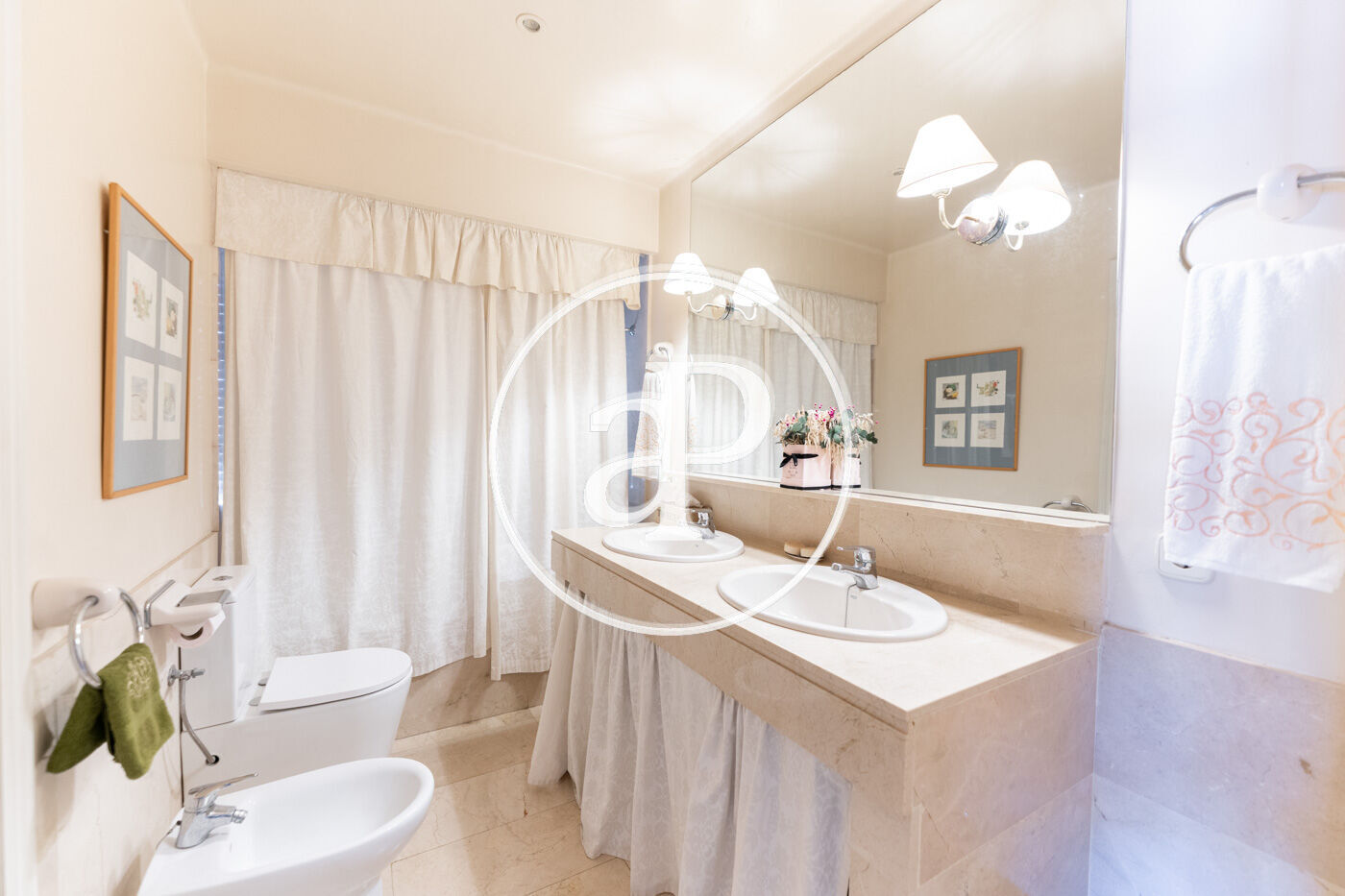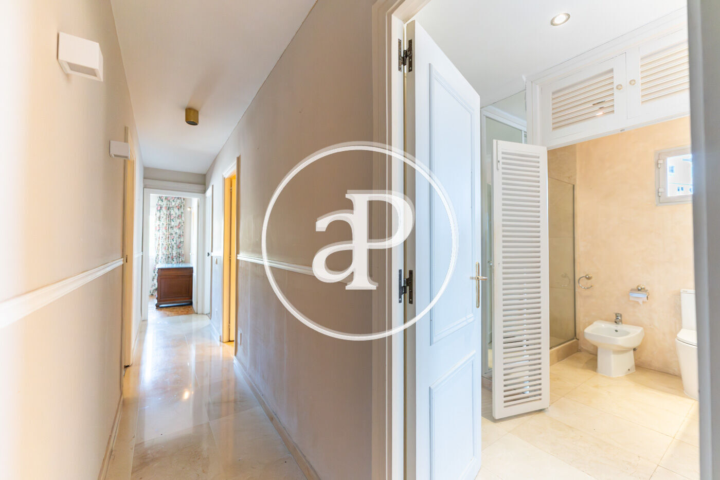 Situada a la sisena planta d’un edifici de vuit altures, accedim a la propietat per una de les dues portes, la principal o la de servei. Iniciem la visita a través del rebedor, que comunica amb un ampli saló-menjador, la cuina i el passadís que condueix a la part privada de la casa.