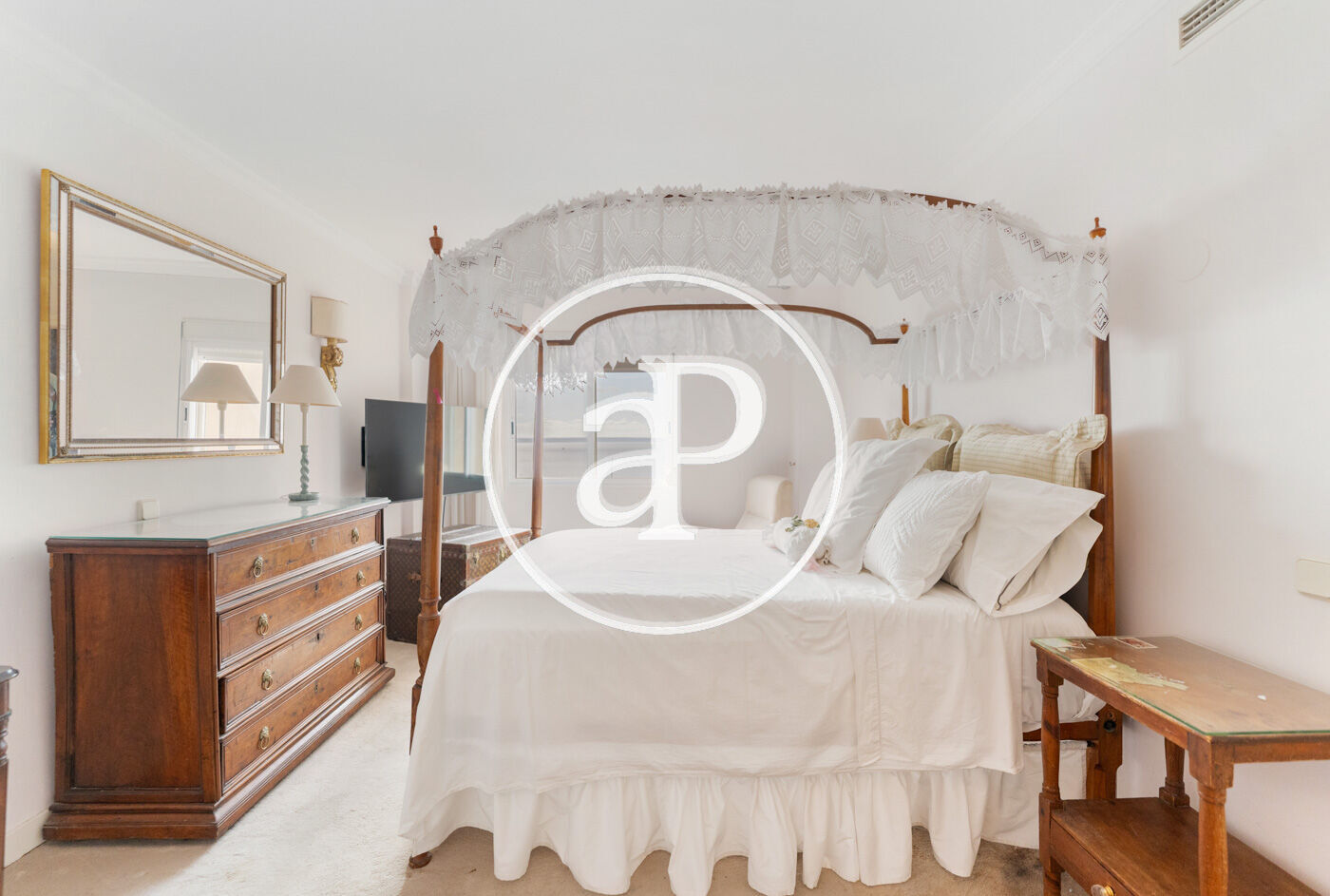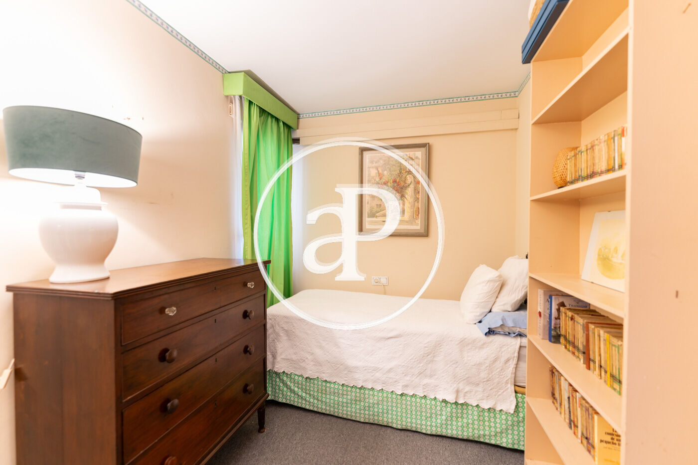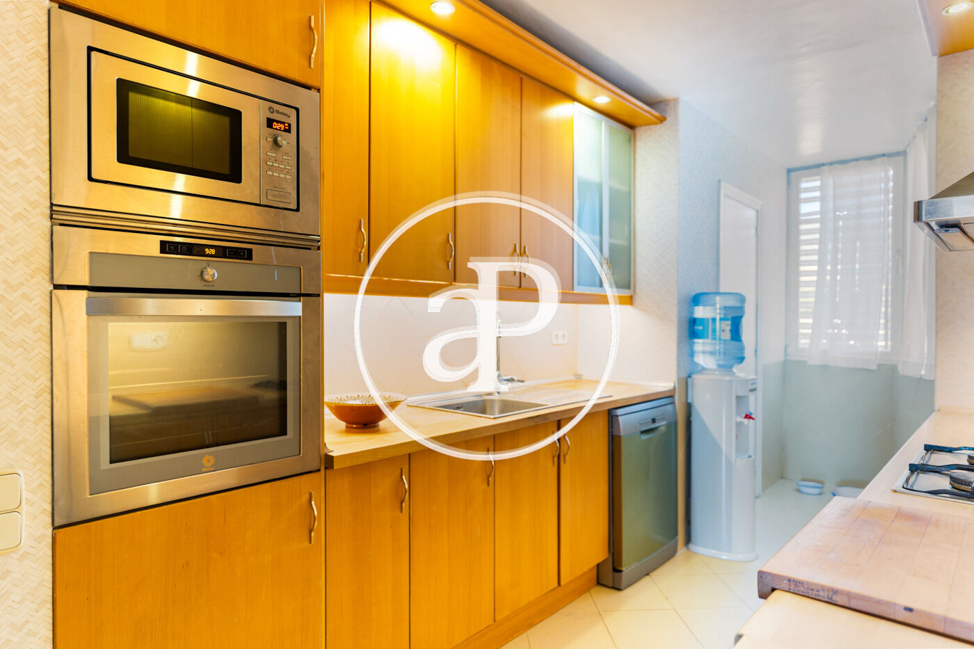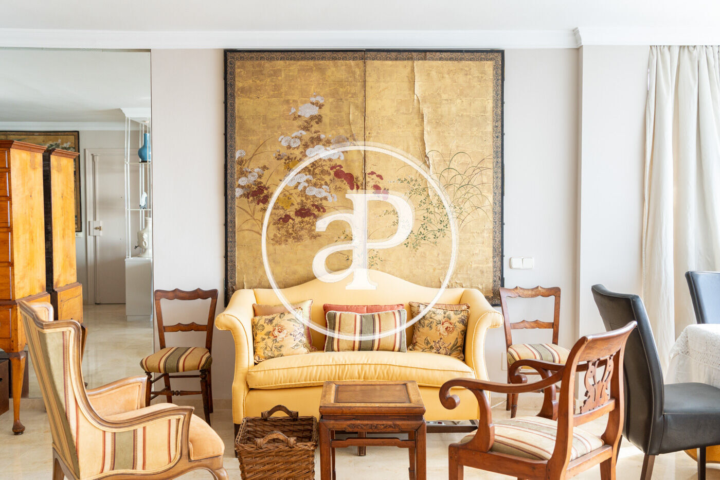 Situada a la sisena planta d’un edifici de vuit altures, accedim a la propietat per una de les dues portes, la principal o la de servei. Iniciem la visita a través del rebedor, que comunica amb un ampli saló-menjador, la cuina i el passadís que condueix a la part privada de la casa.