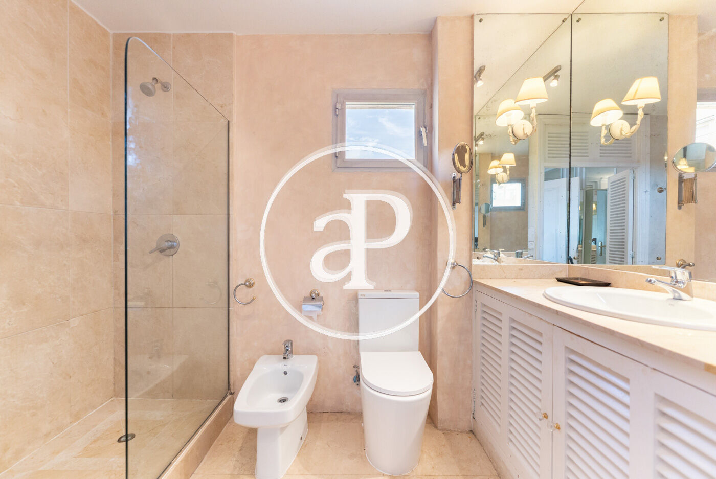 Aquesta exclusiva casa està ubicada a la zona residencial de Gènova, en una situació privilegiada a pocs minuts del centre de Palma, a prop dels millors col·legis tant nacionals com internacionals, amb molt fàcil accés a l'autovia, la costa i les platges de Cala Major i Illetes. Amb una superfície de 180 m² distribuïts en tres plantes, aquesta propietat combina comoditat, amplitud i unes vistes úniques al mar i a la ciutat des de la terrassa. La planta principal està composta per una àmplia cuina totalment equipada, zona d'esmorzar que comunica amb un saló lluminós amb xemeneia i accés directe al porxo, al jardí i a la piscina privada de 12 m². La primera planta acull tres dormitoris i dos banys (un d'ells en suite), tots exteriors. Dues de les habitacions gaudeixen d'espectaculars vistes al mar, i des del dormitori del darrere s'accedeix a una terrassa ideal per relaxar-se. A la segona i última planta es troba el magnífic terrat, un espai perfecte on podrà gaudir d’impressionants vistes panoràmiques al mar i a la ciutat, amb presa d’aigua i electricitat per instal·lar una cuina o barbacoa. El soterrani ofereix garatge, bugaderia i un bany addicional, amb espai disponible per crear un celler o zona d’emmagatzematge segons les necessitats del propietari. Terres de gres, calefacció de gas per radiadors, xemeneia, aire condicionat per Split a totes les estances, electrodomèstics, armaris encastats, finestres amb doble vidre. Característiques addicionals: terrassa, jardí, terrat, piscina privada, garatge, bugaderia i celler.