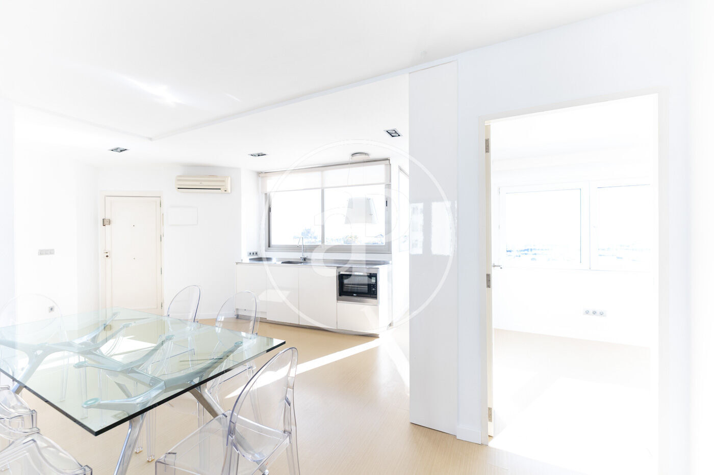 L’habitatge es distribueix en una àmplia i lluminosa zona de dia, amb un saló menjador decorat amb gust en tons clars i grans finestrals que inunden l’espai de llum natural. La cuina americana, totalment equipada, compta amb armaris d’acer inoxidable i també gaudeix d’excel·lents vistes al mar. A més, disposa d’una coladuria independent.