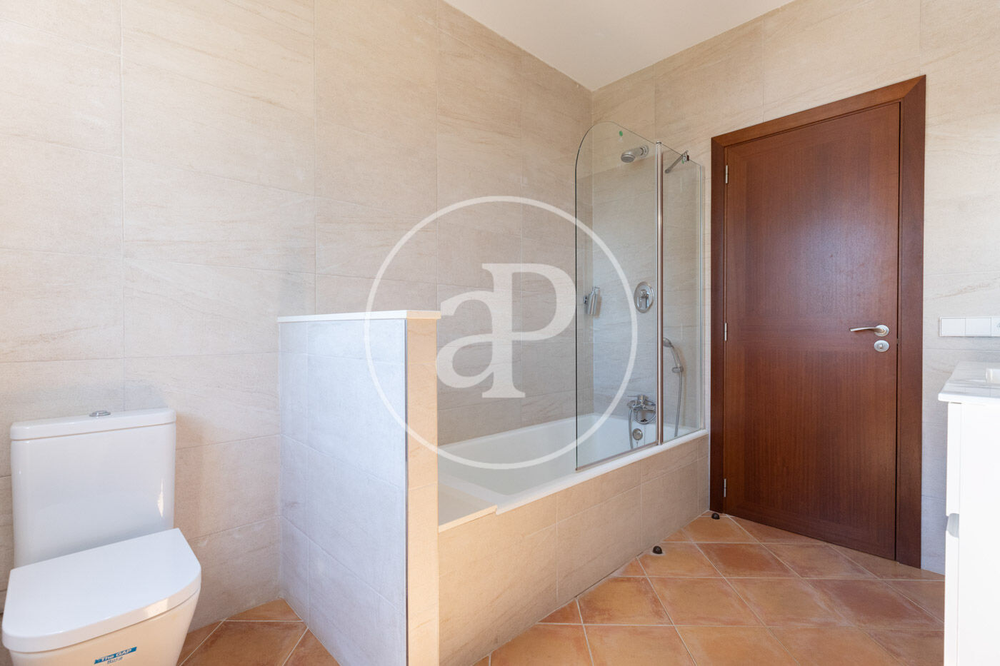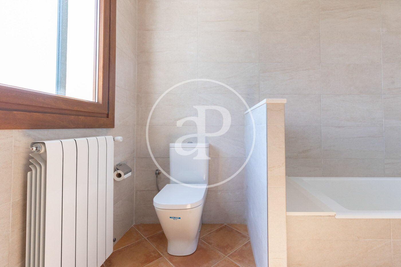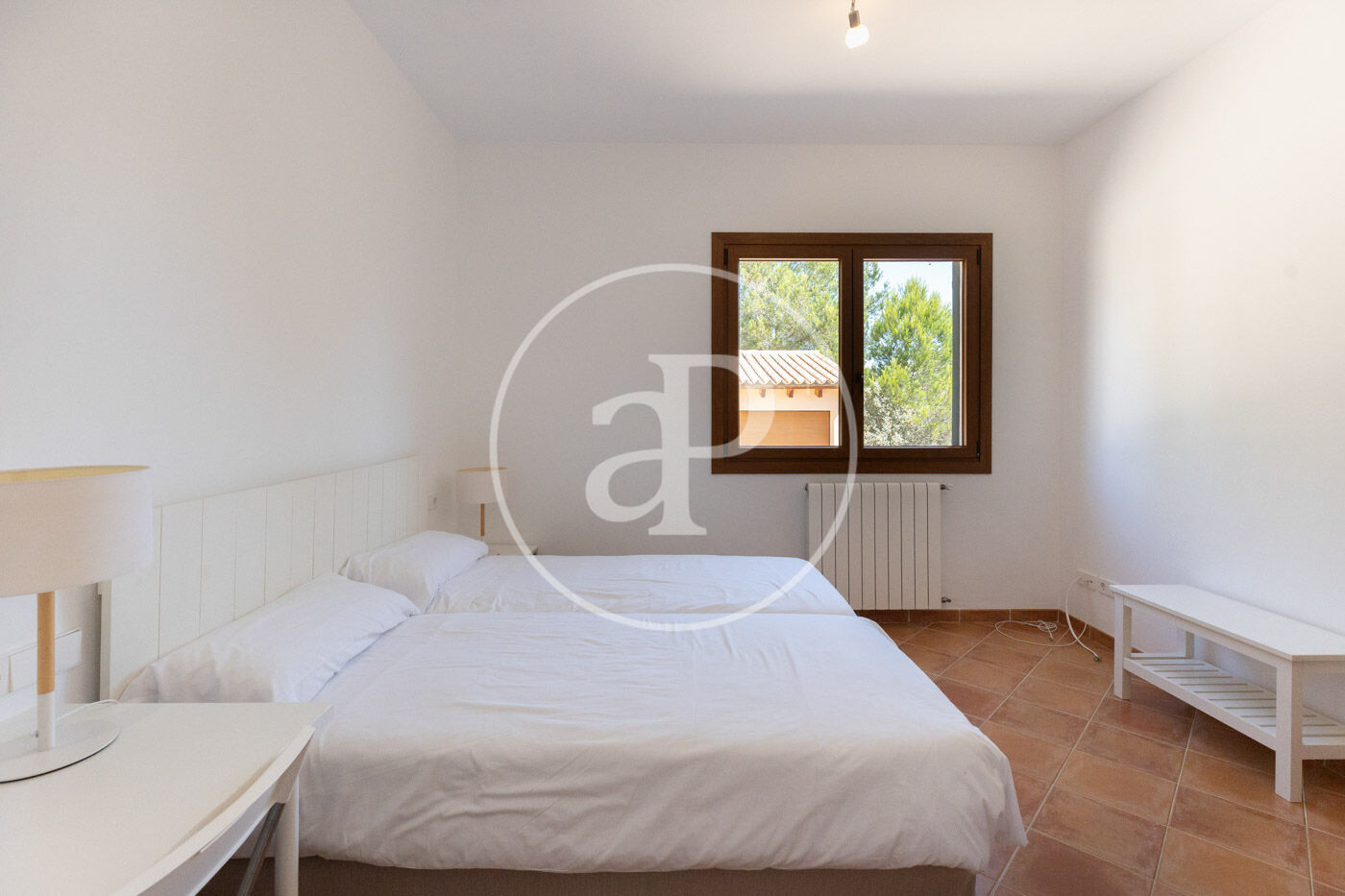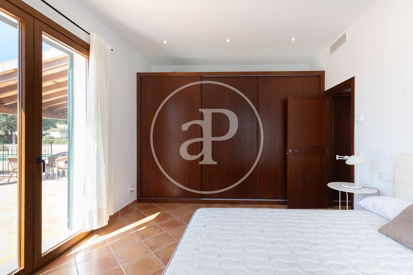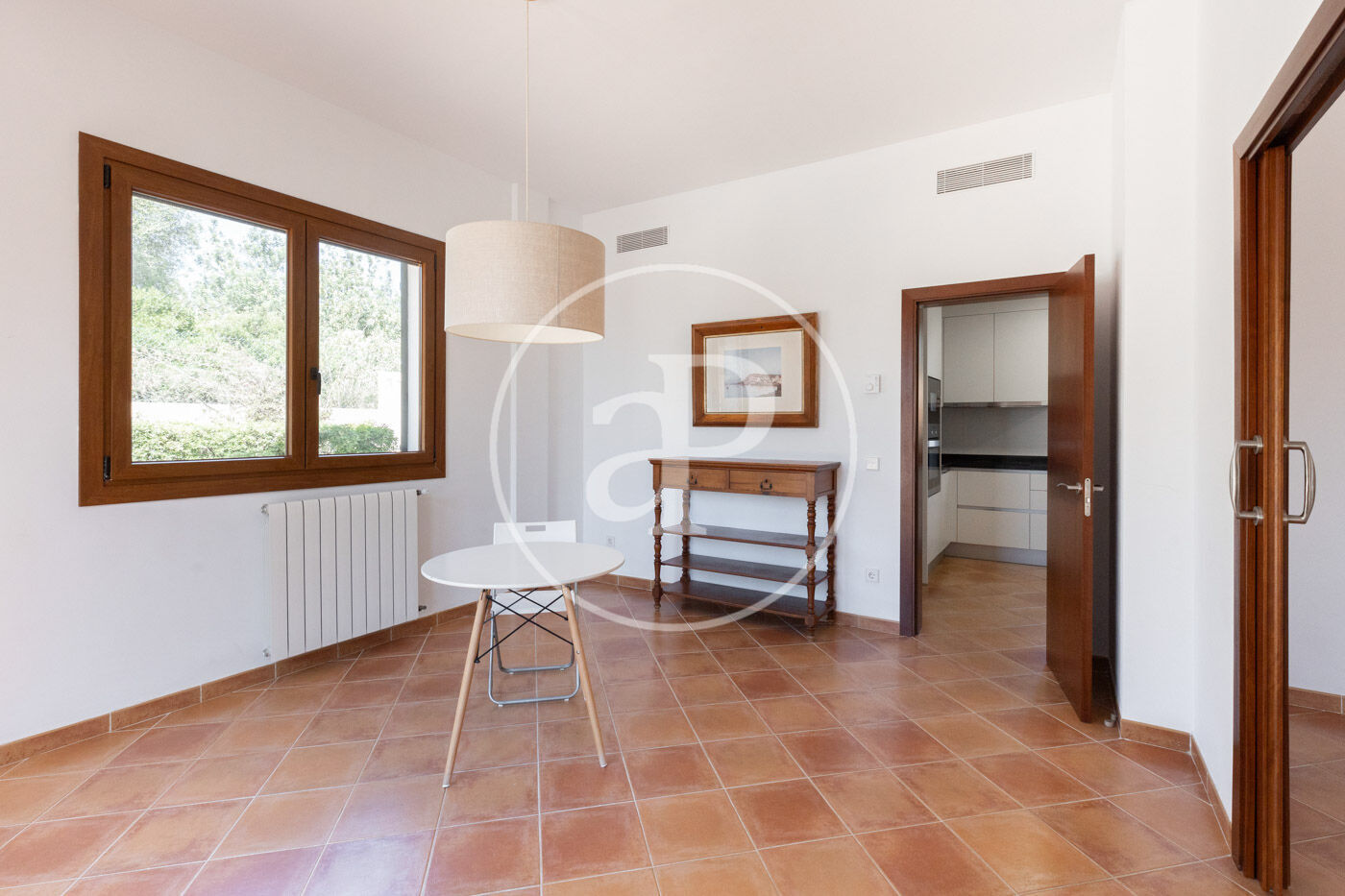 Accedim a la vivenda a través d'un rebedor on trobem un lluminós saló i un menjador independent, tots dos amb sortida a una àmplia terrassa coberta amb vistes al jardí i la zona de la piscina. La cuina, d'estil modern, està completament moblada, té una zona de bugaderia i rebost per a emmagatzematge. A la mateixa planta i zona de nit, hi trobem tres habitacions dobles amb armaris i dos banys. L'habitació principal amb bany en suitte amb banyera i un vestidor per a més comoditat d'emmagatzematge.