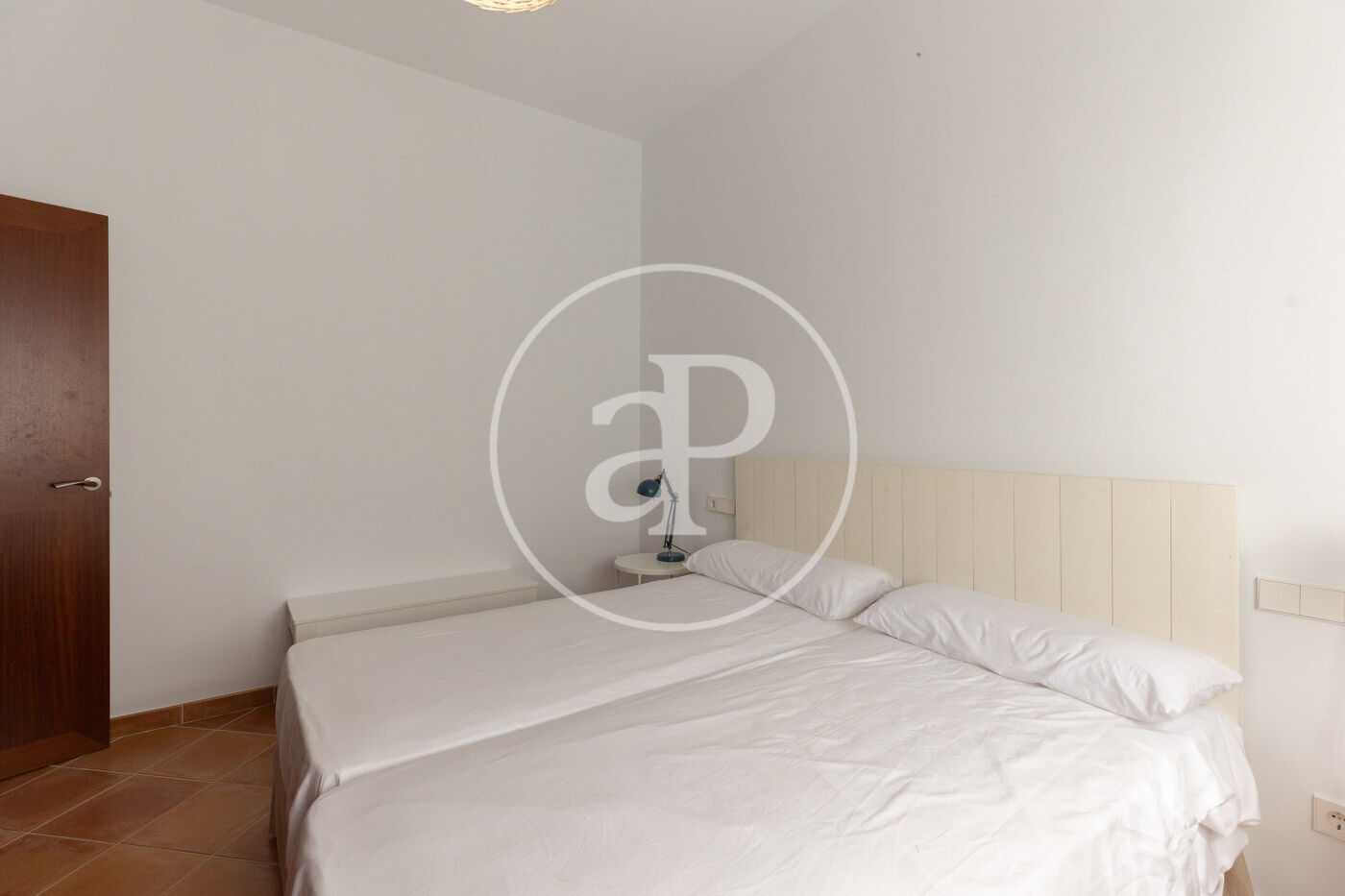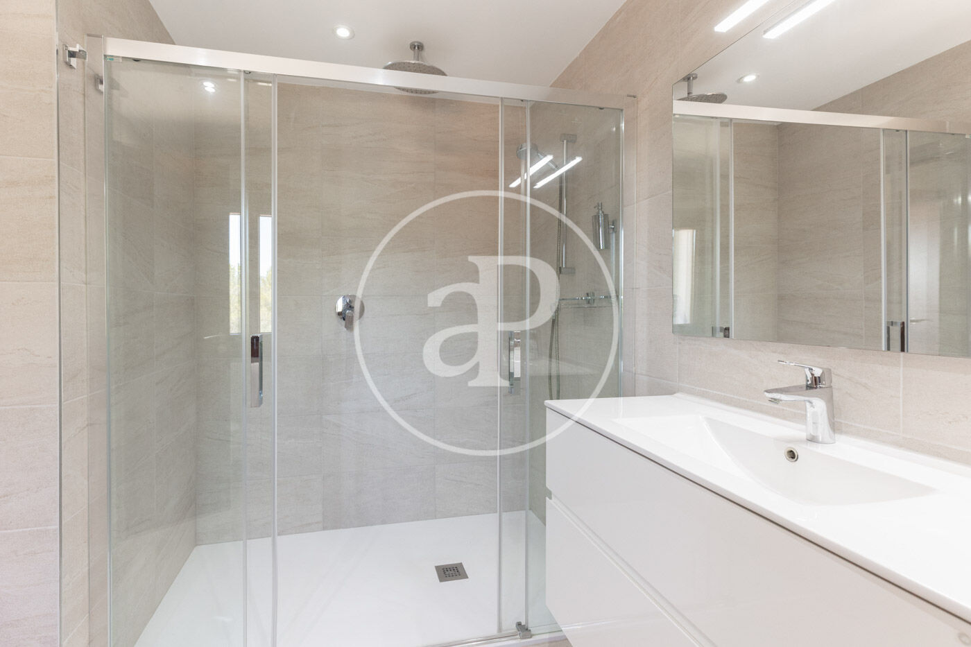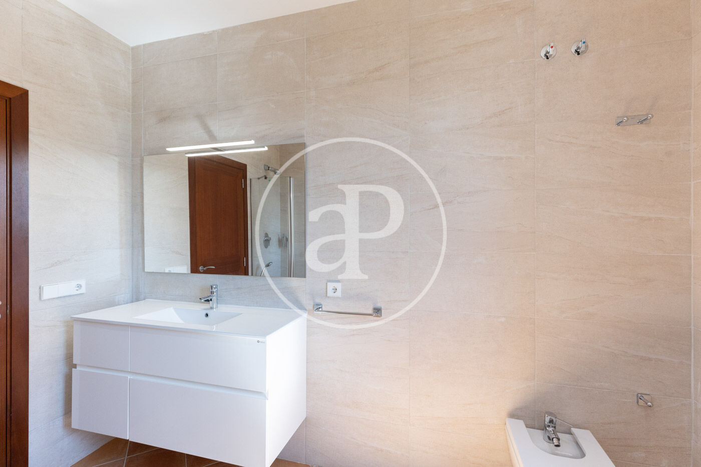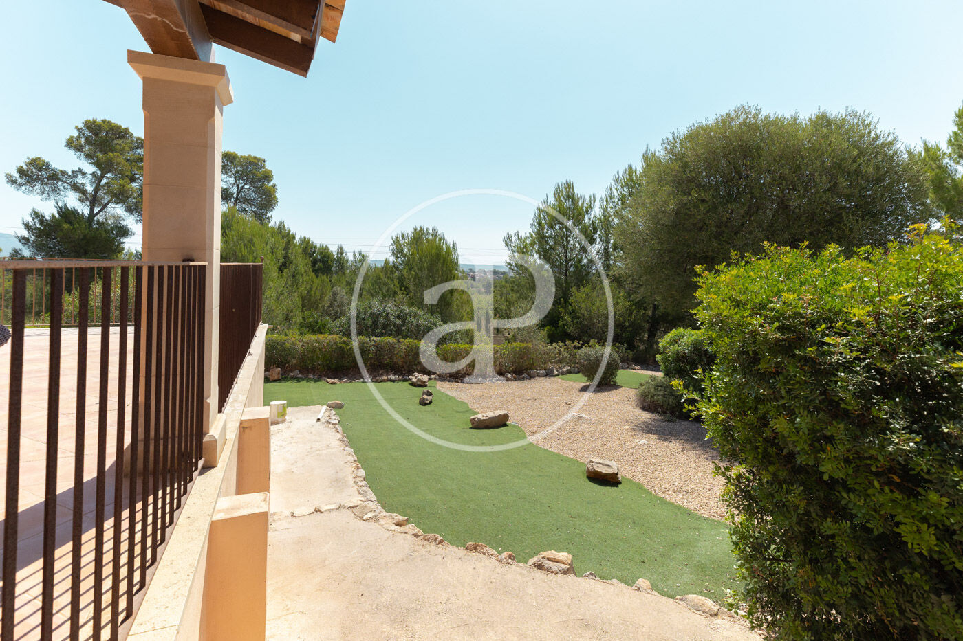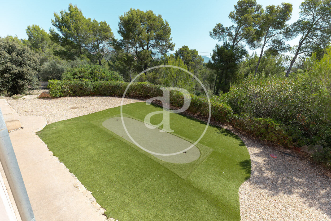 Accedim a la vivenda a través d'un rebedor on trobem un lluminós saló i un menjador independent, tots dos amb sortida a una àmplia terrassa coberta amb vistes al jardí i la zona de la piscina. La cuina, d'estil modern, està completament moblada, té una zona de bugaderia i rebost per a emmagatzematge. A la mateixa planta i zona de nit, hi trobem tres habitacions dobles amb armaris i dos banys. L'habitació principal amb bany en suitte amb banyera i un vestidor per a més comoditat d'emmagatzematge.