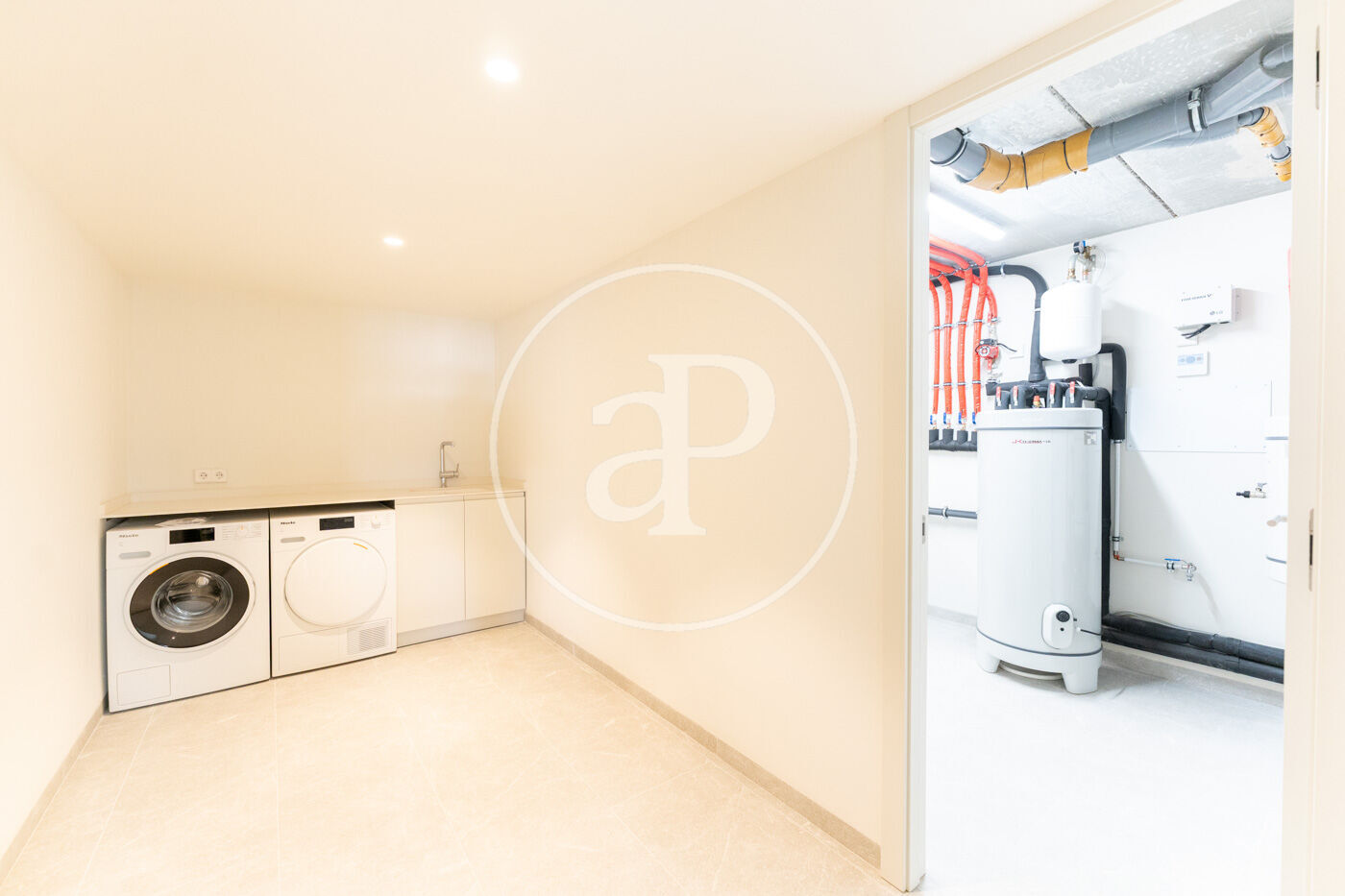 A la planta soterrani hi ha un espai polivalent que inclou una elegant bodega, una coladuría equipada amb rentadora i assecadora Miele, i una àrea versàtil ideal per a sala de cinema, gimnàs o zona d’oci. A més, la vivenda compta amb garatge amb capacitat per a diversos vehicles.
