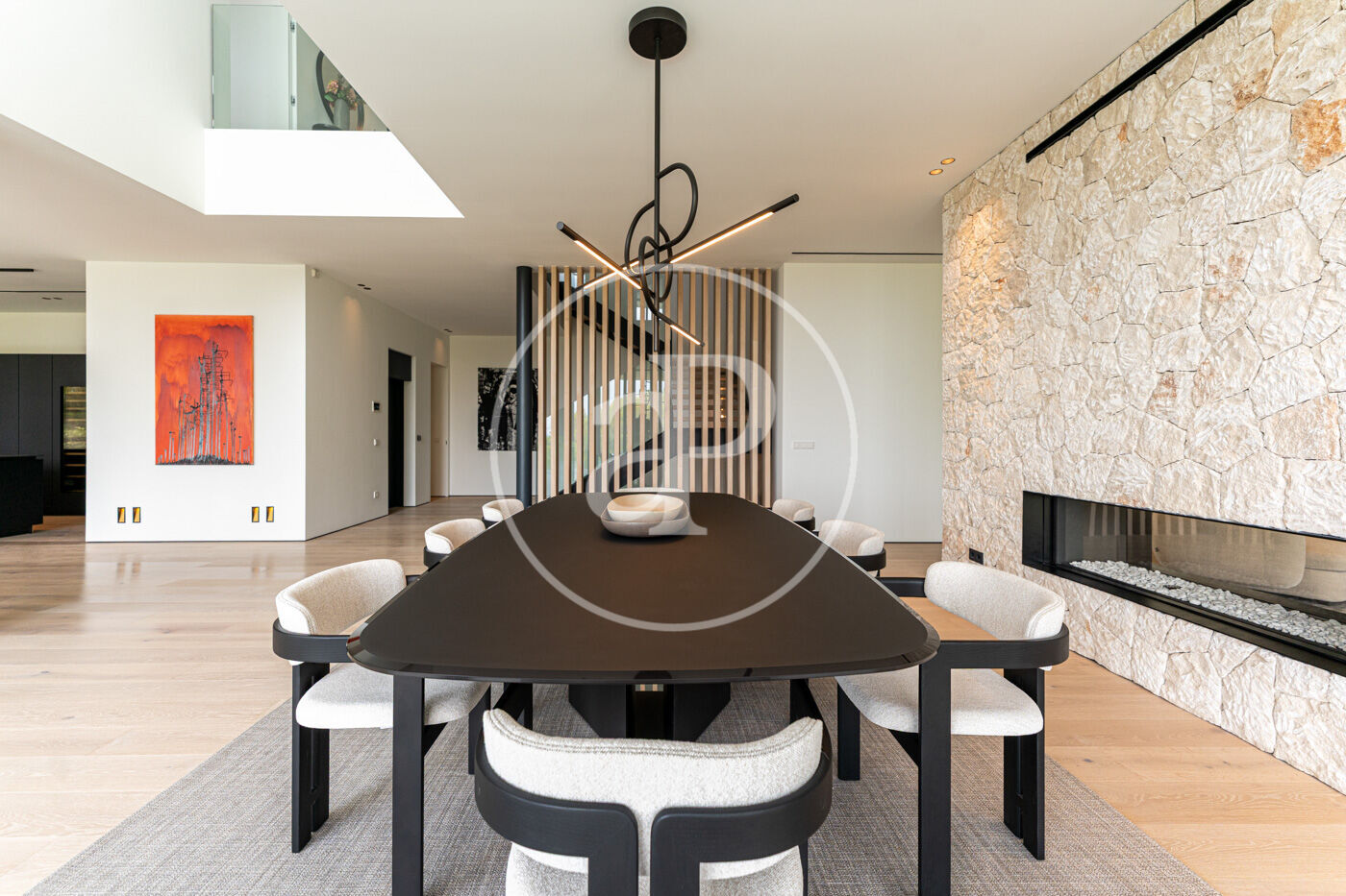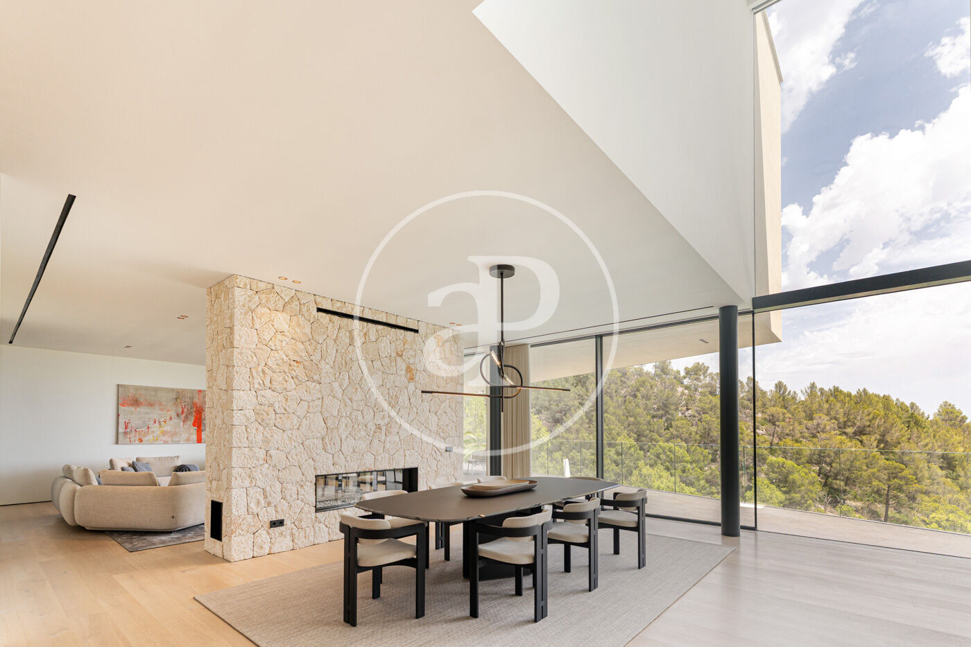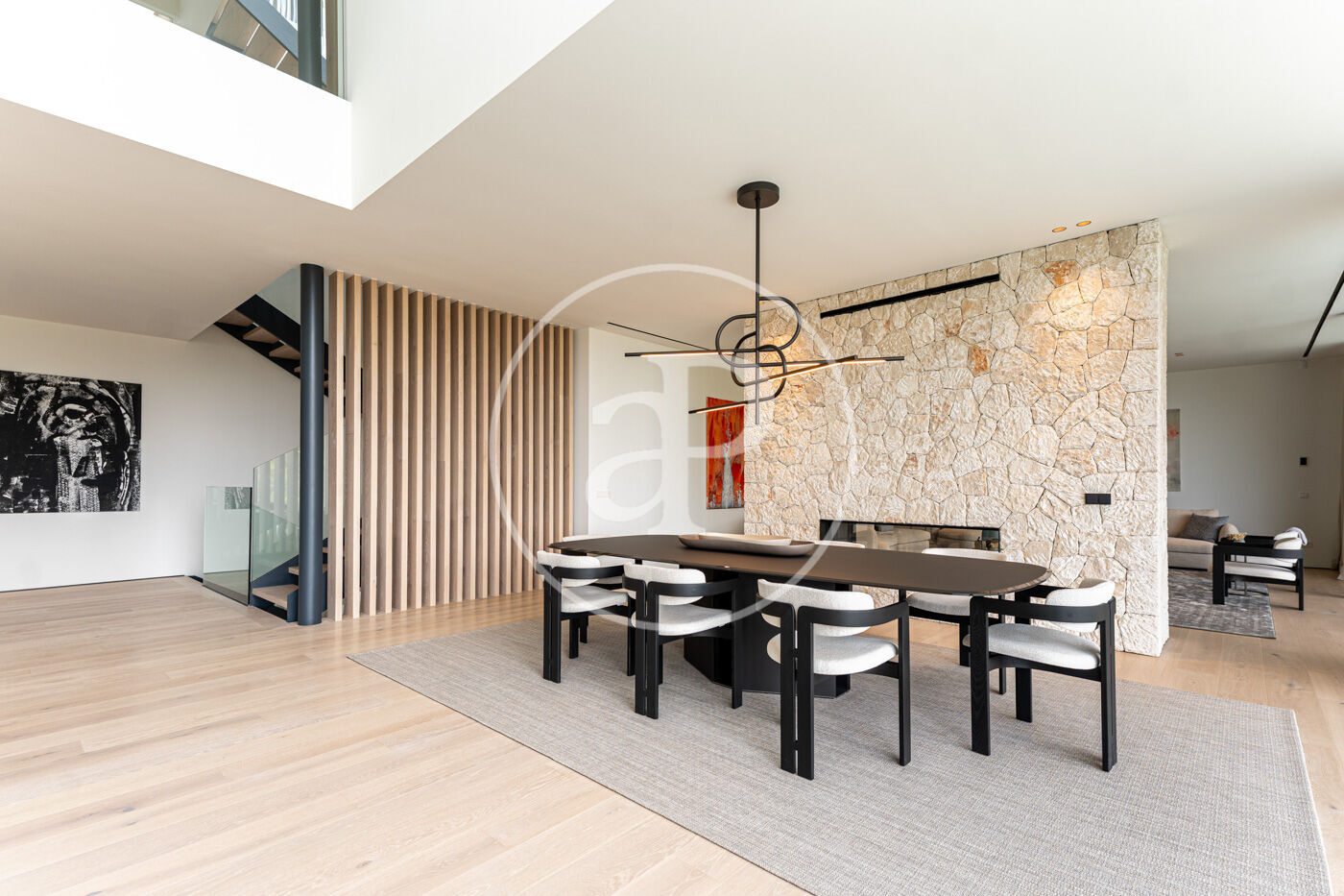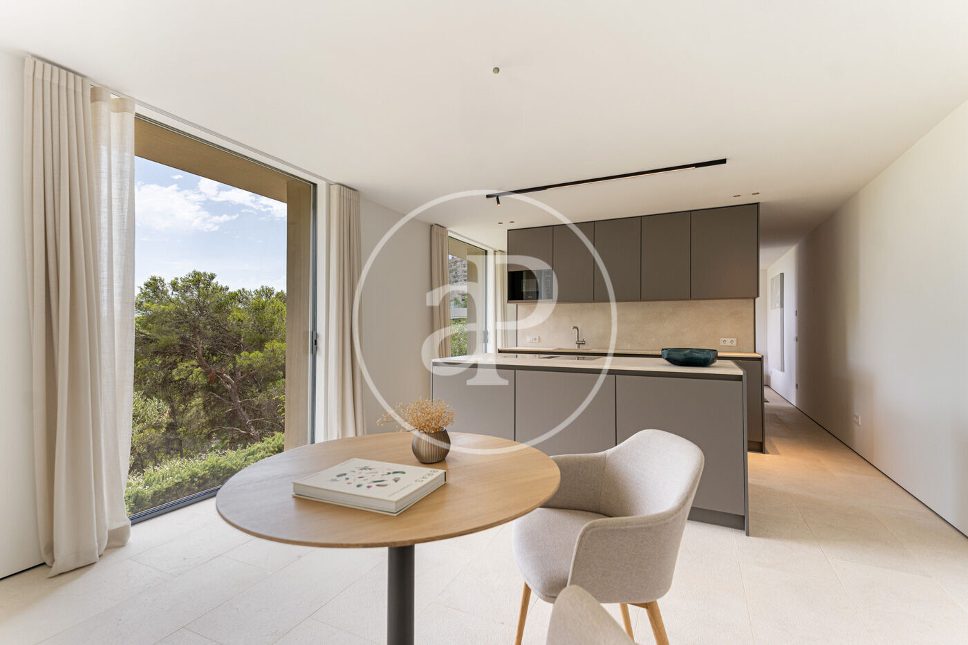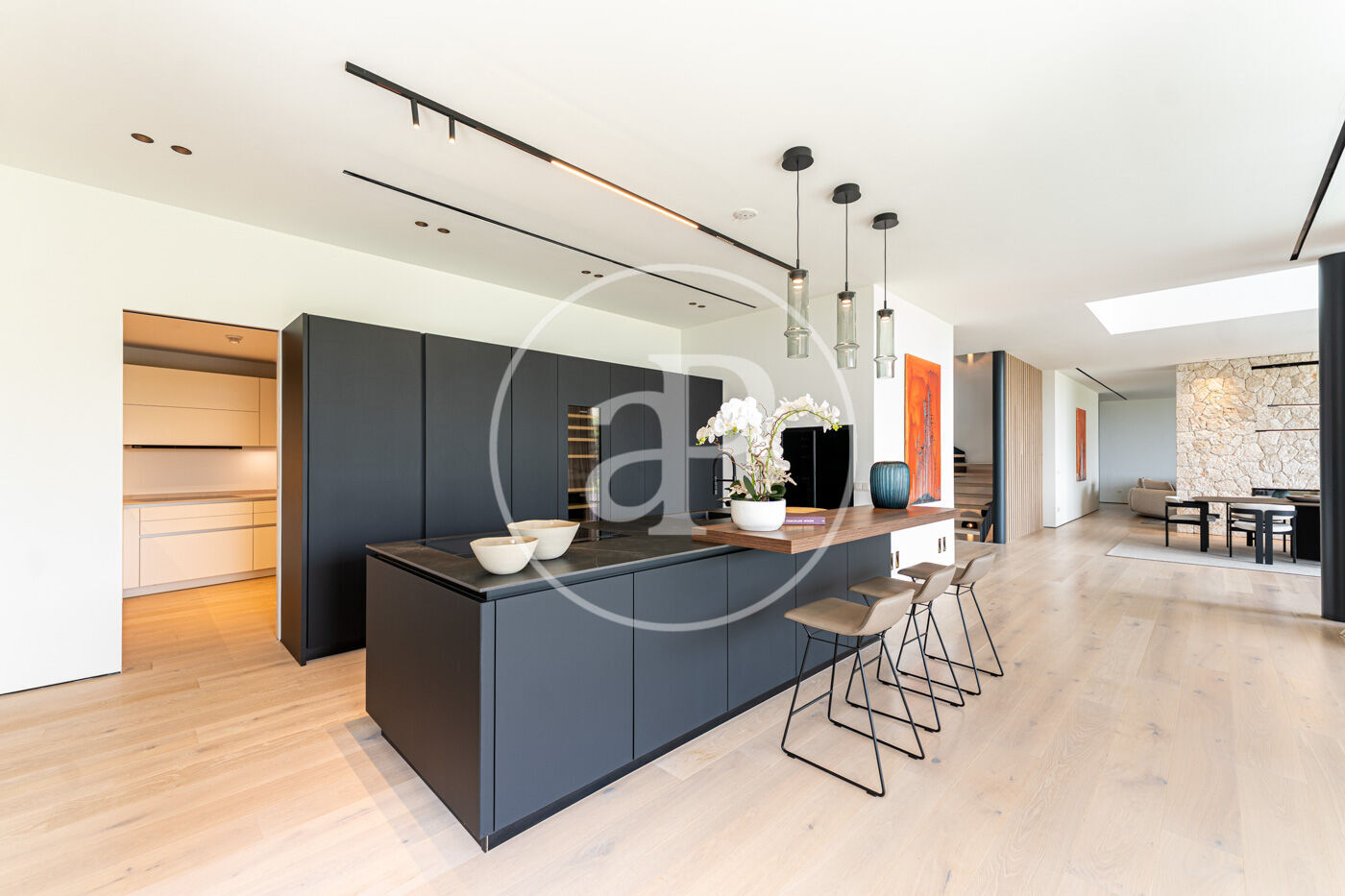 La planta principal acull un elegant saló-menjador amb xemeneia de gas i una cuina oberta d’estil modern, complementada per una segona cuina de servei. Grans finestrals connecten aquest espai amb una àmplia terrassa que recorre tota la façana, creant una transició fluida entre l’interior i l’exterior.