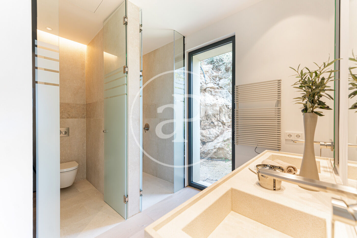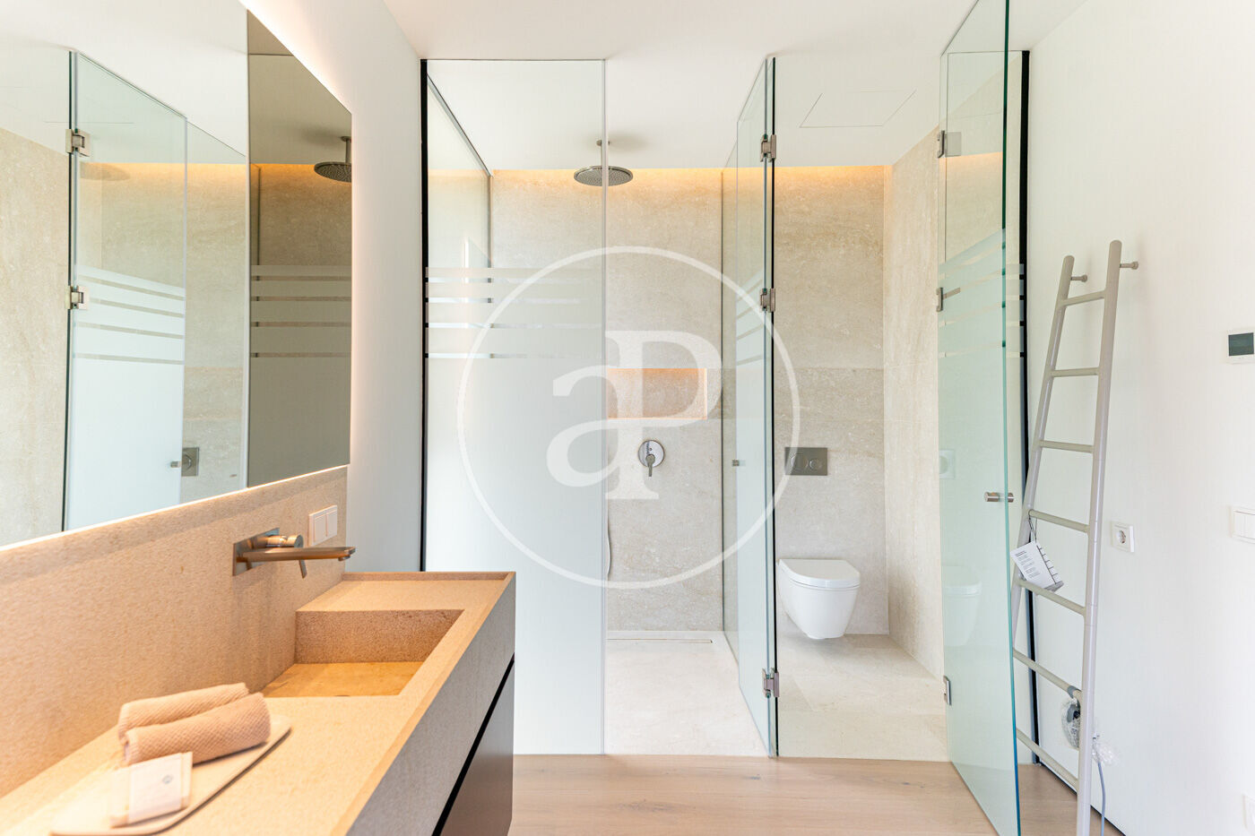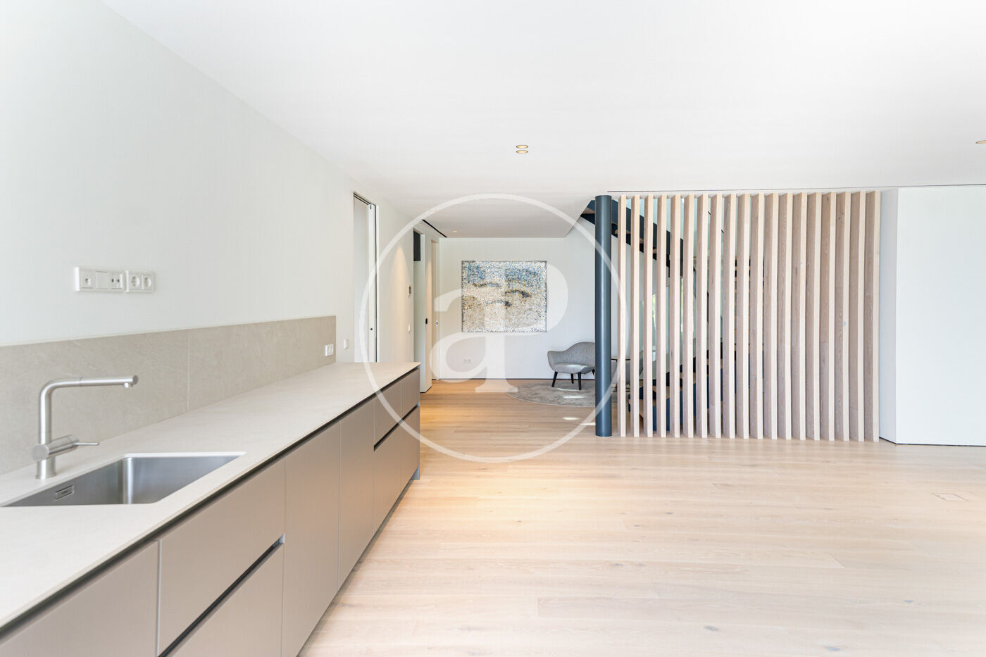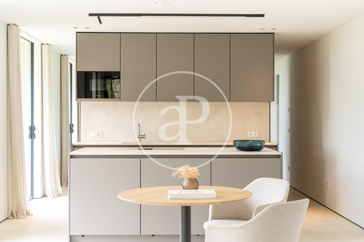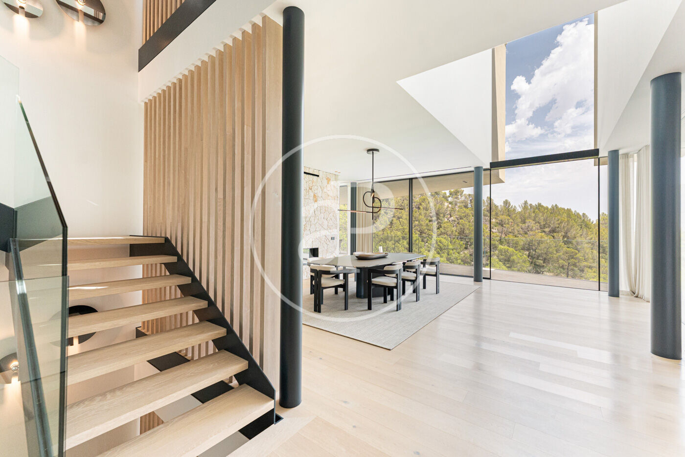 La planta principal acull un elegant saló-menjador amb xemeneia de gas i una cuina oberta d’estil modern, complementada per una segona cuina de servei. Grans finestrals connecten aquest espai amb una àmplia terrassa que recorre tota la façana, creant una transició fluida entre l’interior i l’exterior.