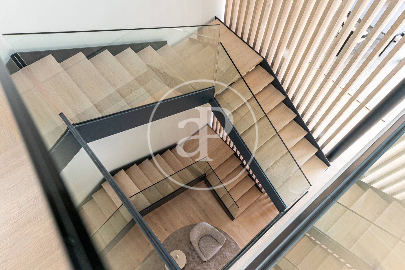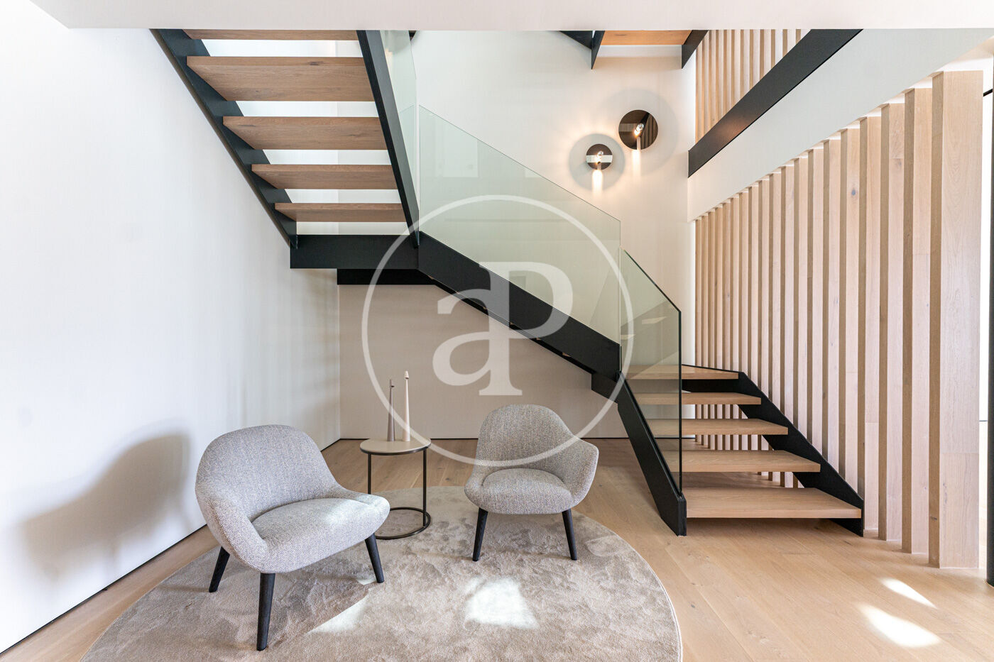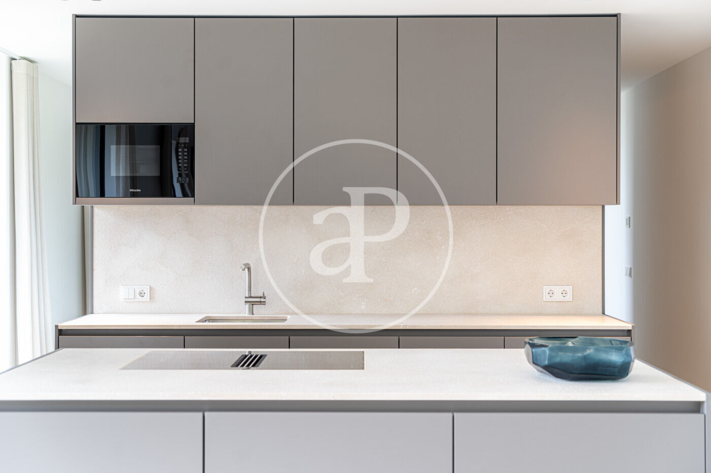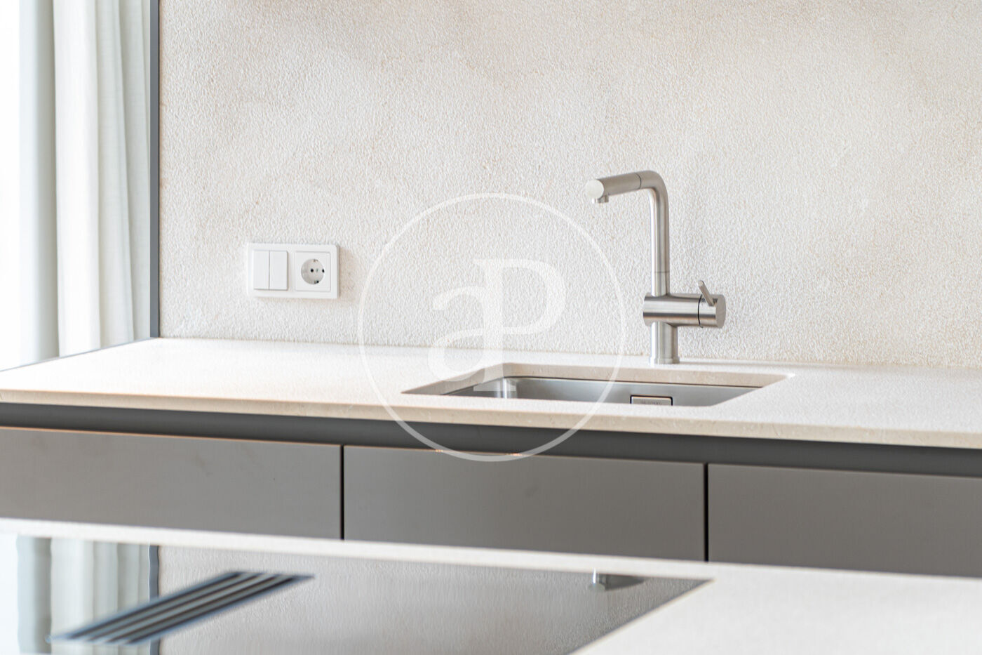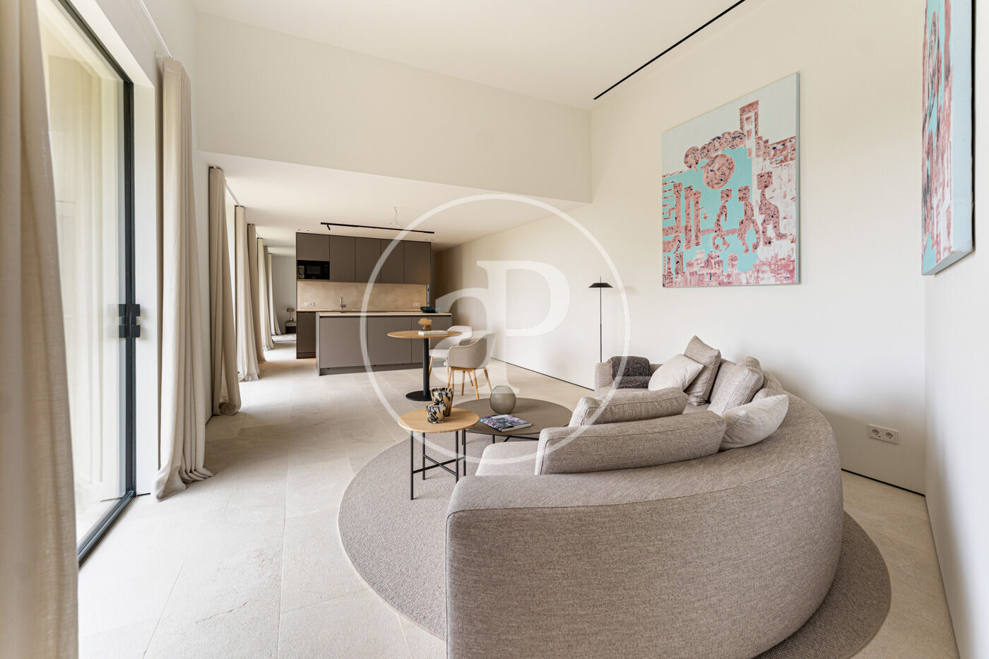 La planta principal acull un elegant saló-menjador amb xemeneia de gas i una cuina oberta d’estil modern, complementada per una segona cuina de servei. Grans finestrals connecten aquest espai amb una àmplia terrassa que recorre tota la façana, creant una transició fluida entre l’interior i l’exterior.
