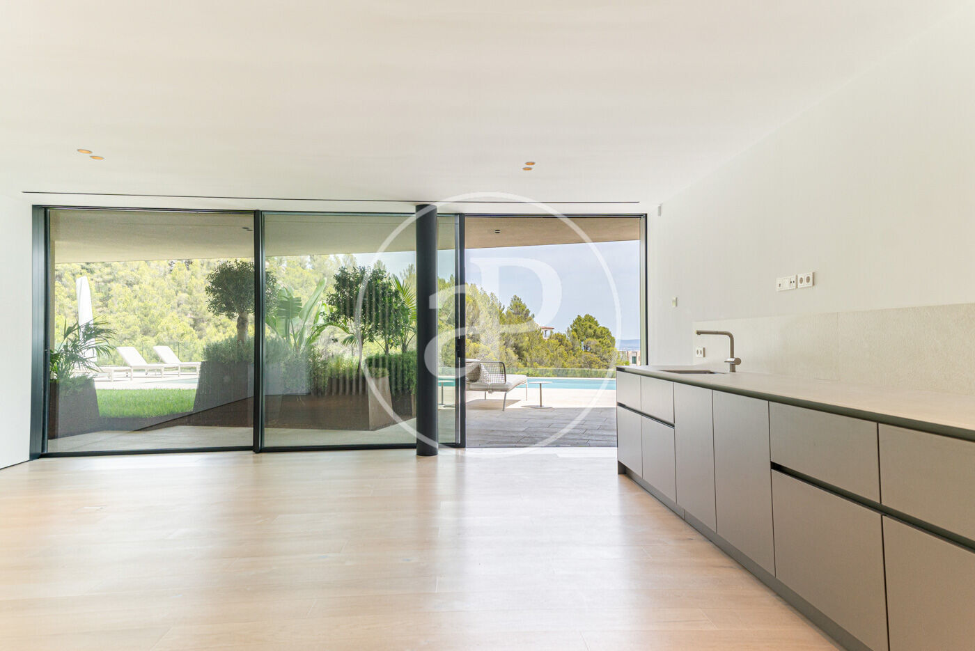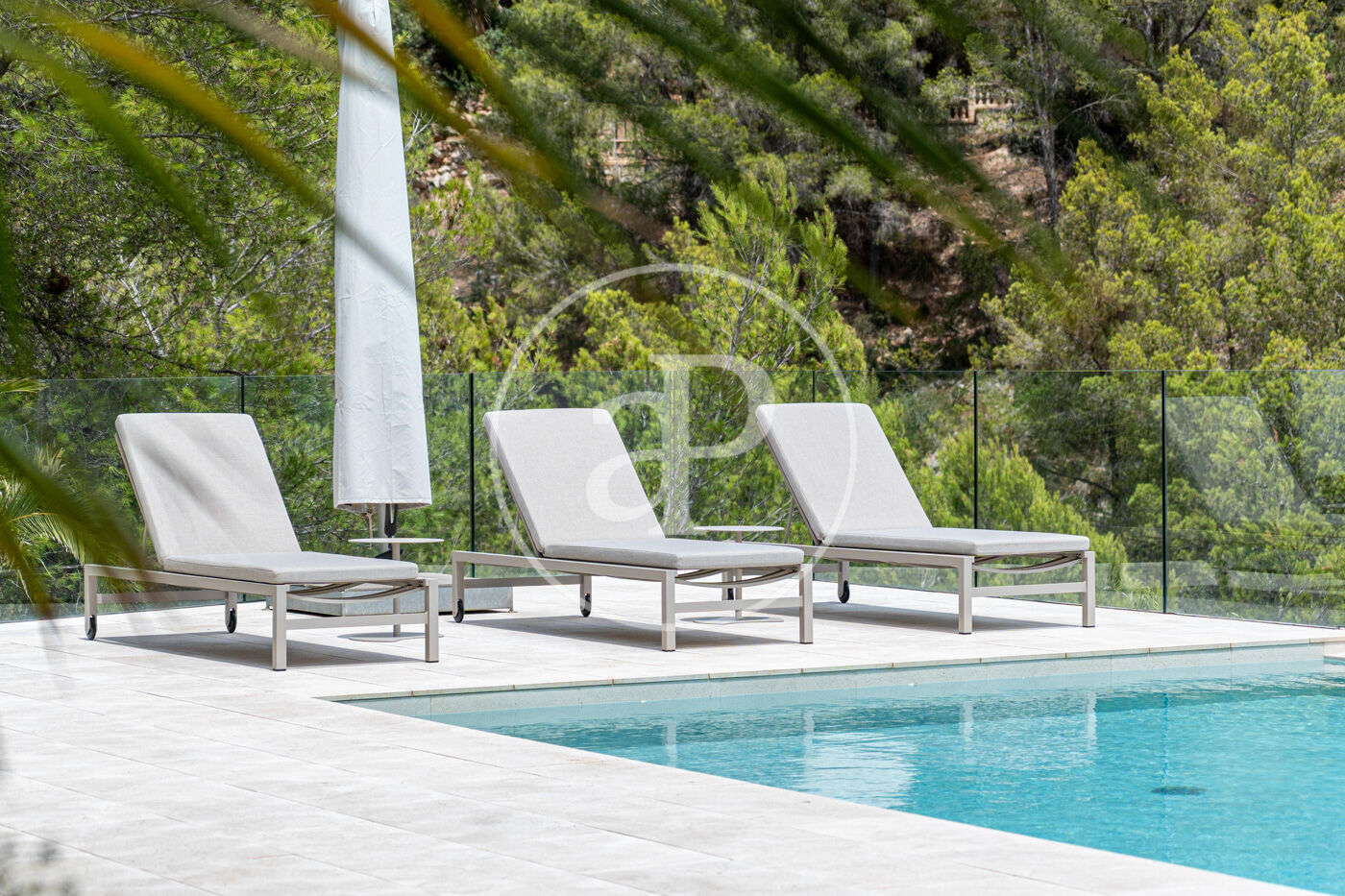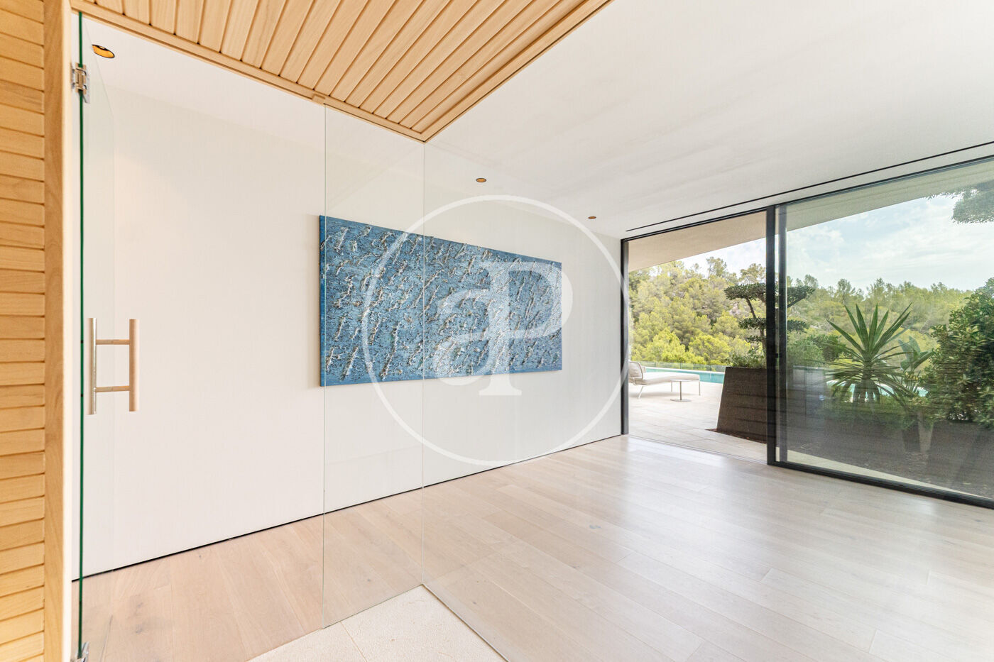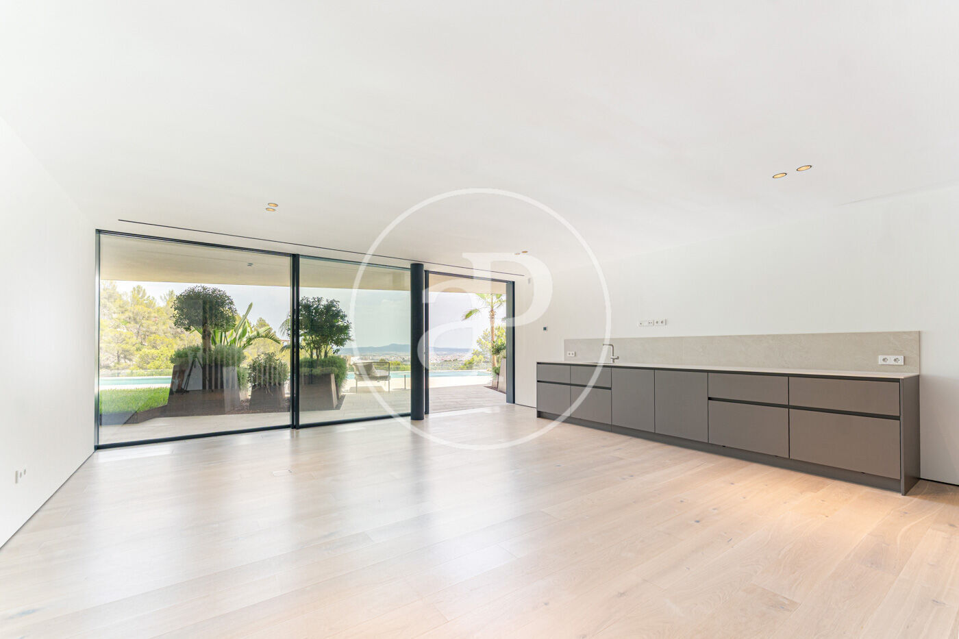 A la planta inferior, la zona de benestar inclou gimnàs, sauna i accés directe a una espectacular piscina de 20 metres, envoltada de zones de solàrium amb vistes al mar.