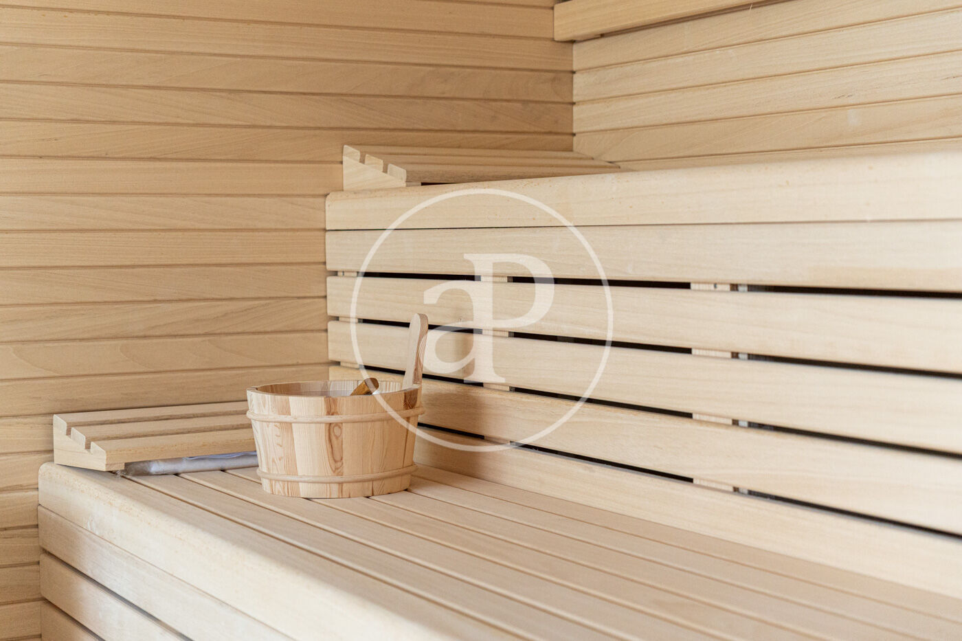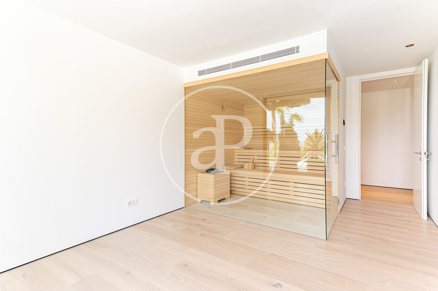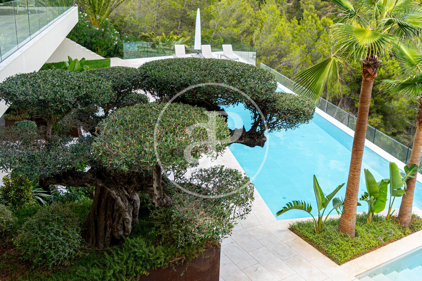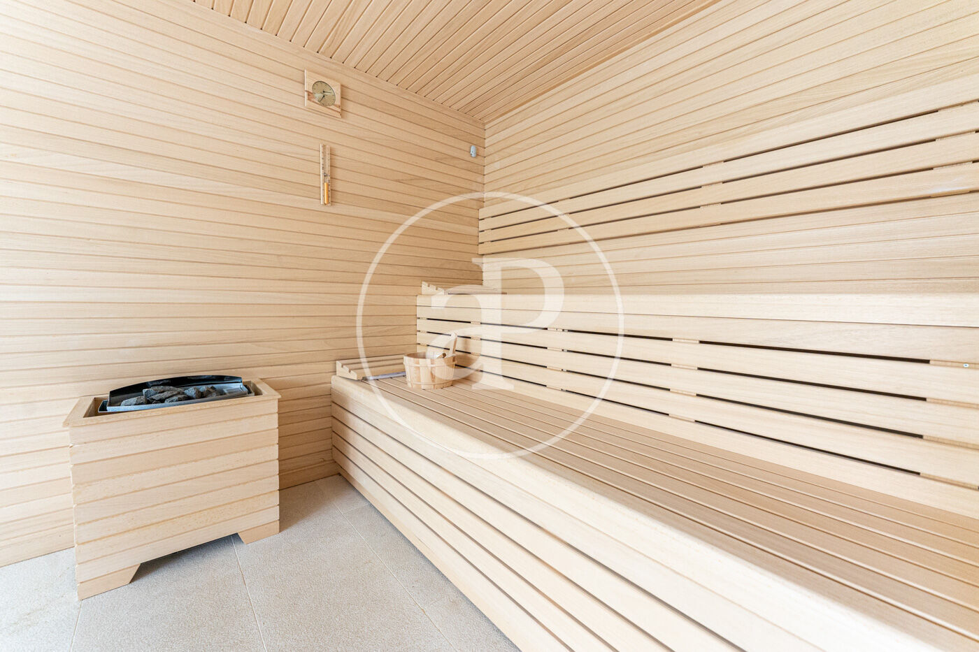 A la planta inferior, la zona de benestar inclou gimnàs, sauna i accés directe a una espectacular piscina de 20 metres, envoltada de zones de solàrium amb vistes al mar.