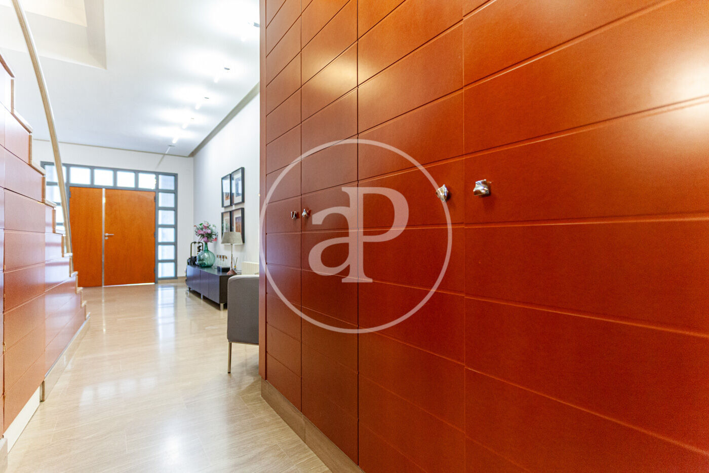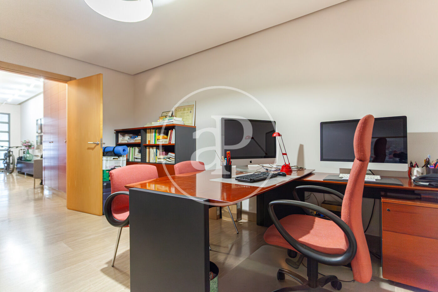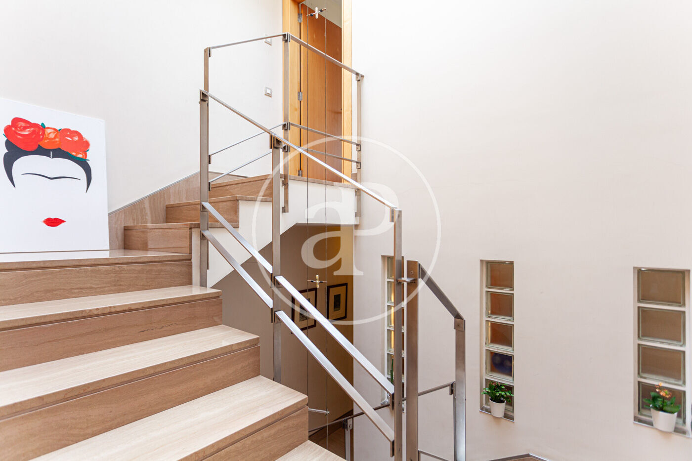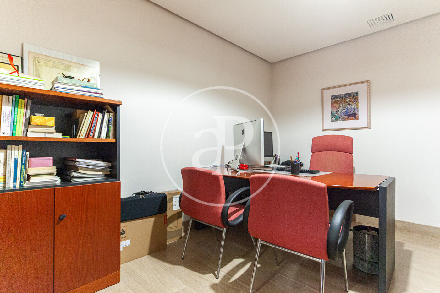 En un dels carrers amb millor accés a les zones comercials, a prop de Sant Miquel i de la Plaça d’Espanya, ens trobem amb un edifici racionalista de planta baixa i dues altures. A la planta baixa hi ha un local que actualment s’utilitza com a galeria d’art i que té moltes possibilitats de futur, ja que compta amb arcs, altells que li aporten un atractiu especial, a més de tres habitacions, un aseo i una sala de bugaderia. Aquest local té moltes possibilitats, ja que es pot organitzar per a una gran varietat d’activitats. D’altra banda, trobem l’entrada principal, a la qual s’accedeix per una porta de forja i vidre que dona pas a un hall amb paviment de marbre i que es distribueix de la següent manera: Primera planta: Un ampli hall amb escala, saló amb llar de foc, menjador, habitació doble amb bany en suite i sala. Cuina, aseo i amplis patis. Segona planta: Hall amb llar de foc, quatre dormitoris amb banys en suite, a més d’una terrassa superior a la teulada. L’habitatge, interiorment, té paviments hidràulics de 40 × 40 amb vetes en tons verds i ambre disposats en forma d’escac. Tota la fusteria és modernista. La casa és molt exterior i, per tant, està inundada de llum. Hi ha la possibilitat d’elevar una planta més i també de construir una piscina. És una casa que pot tenir molt d’encant! Possibilitat d’aparcament per a diversos cotxes.