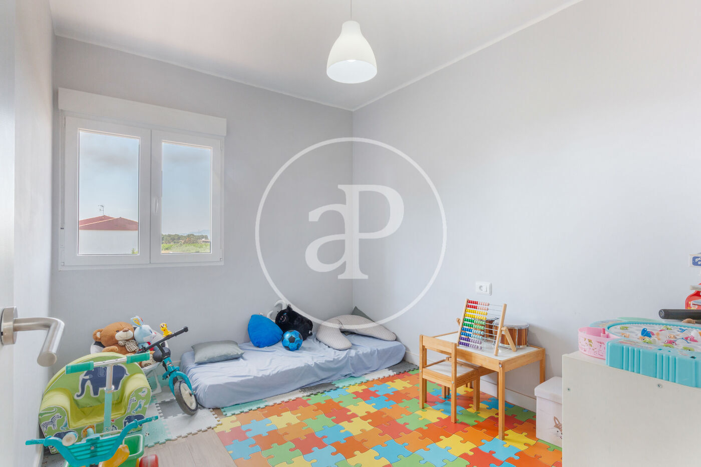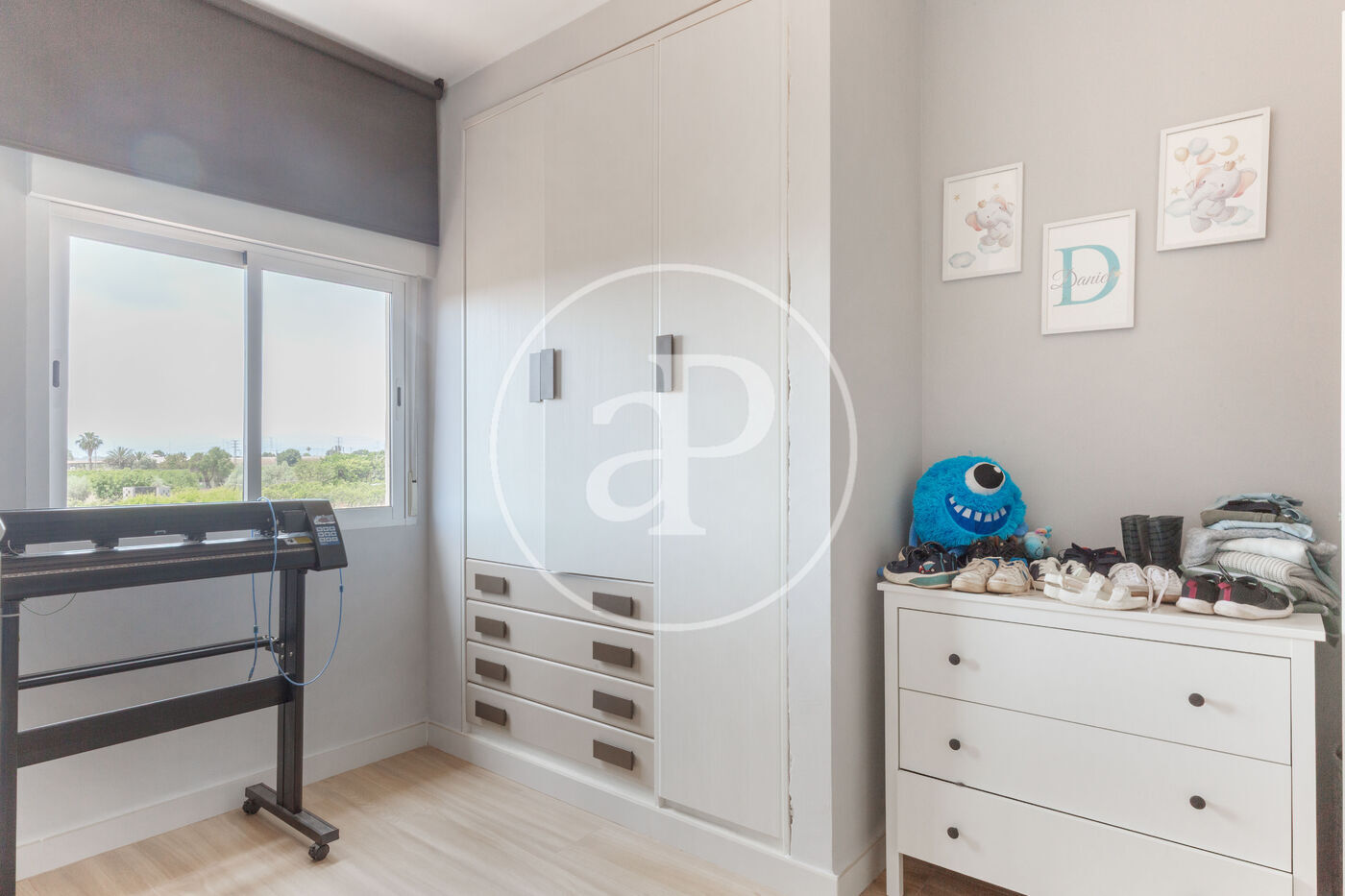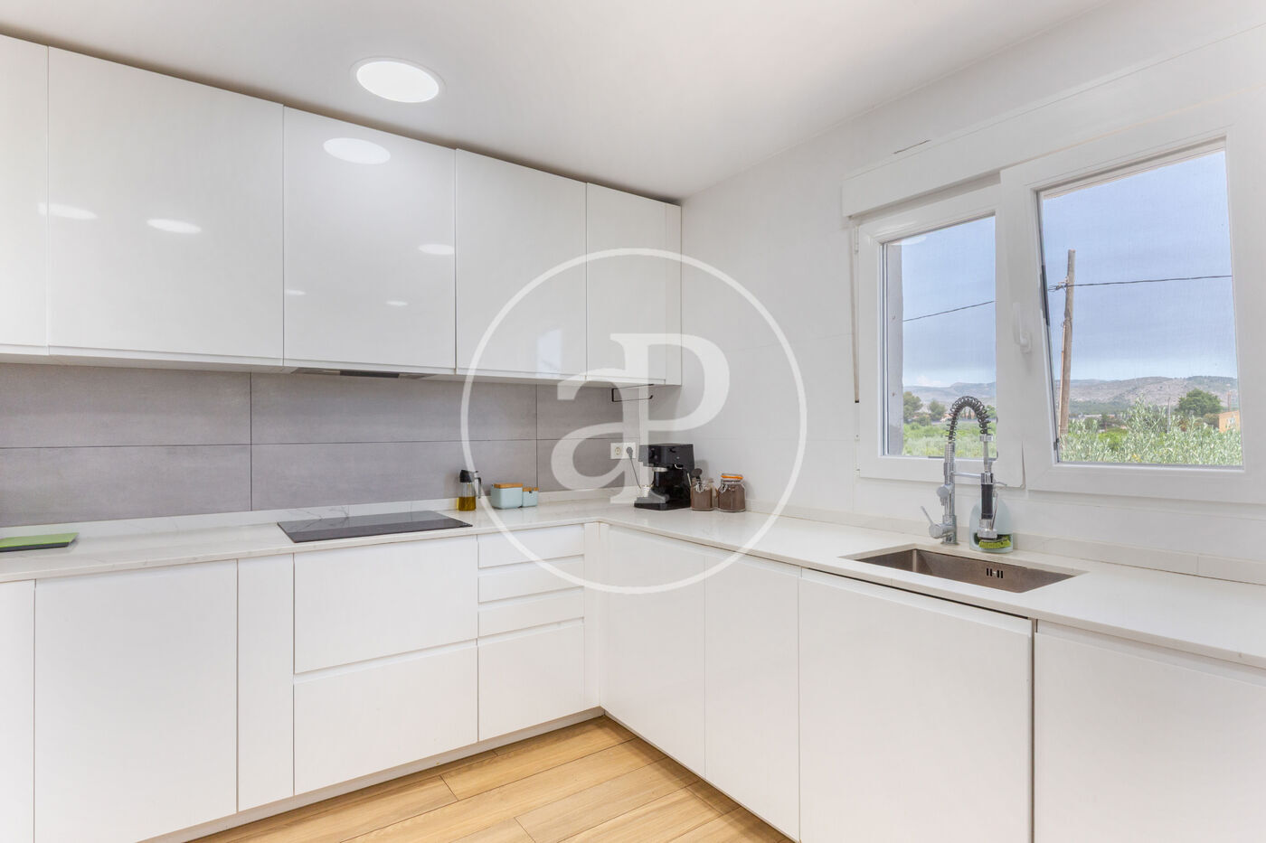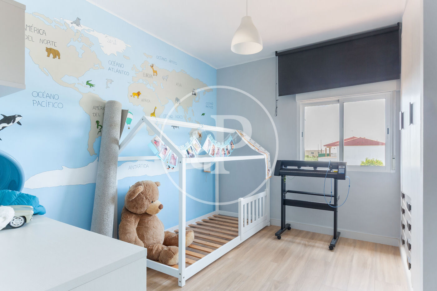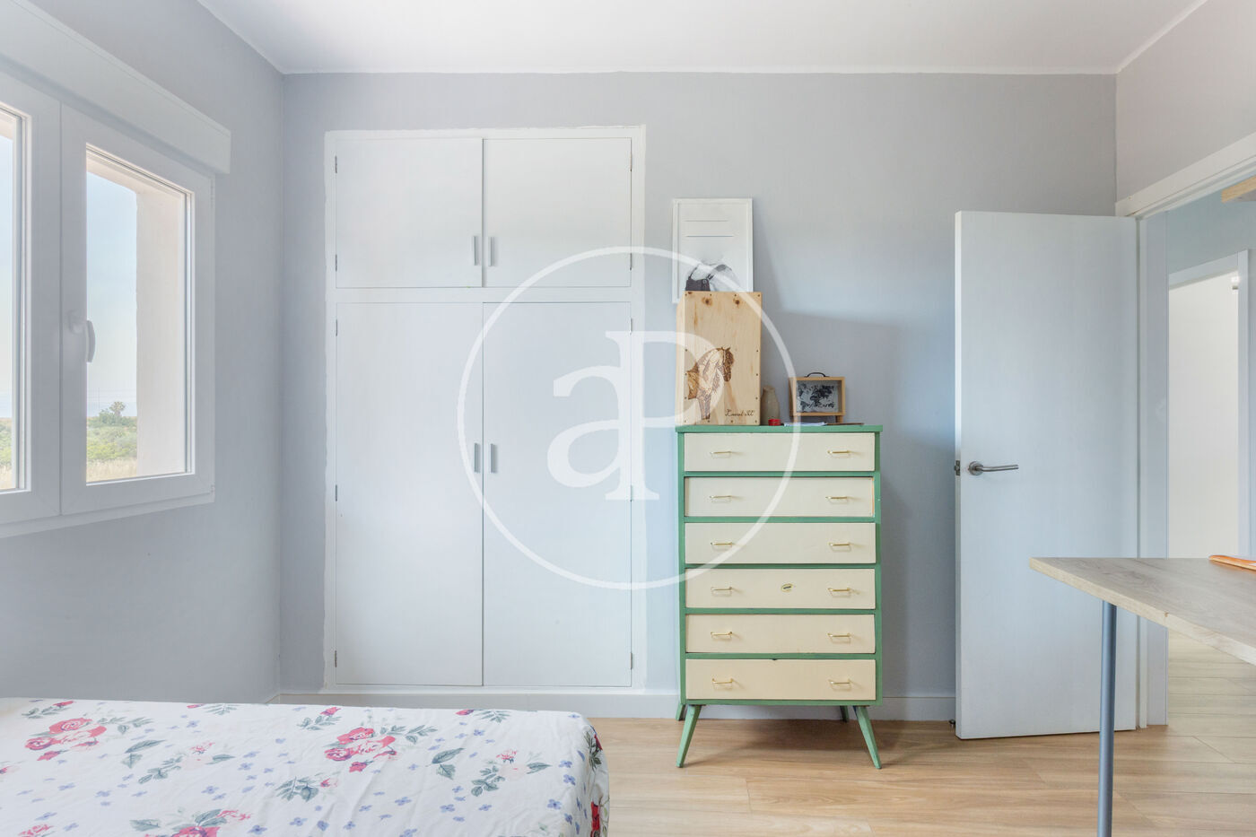 La vivenda, totalment reformada en 2021, compta amb una superfície aproximada de 150 m², més una terrassa de 20 m². En la planta superior, originalment disposava de 5 habitacions, encara que després de la reforma una d'elles s'ha incorporat al dormitori principal com *vestidor. Actualment, la primera planta oferix 4 amplis dormitoris, un *vestidor independent en la suite, un bany complet amb dutxa, una espaiosa cuina amb zona de menjador integrada, moderna i lluminosa, i una gran terrassa ideal per a gaudir del bon clima.