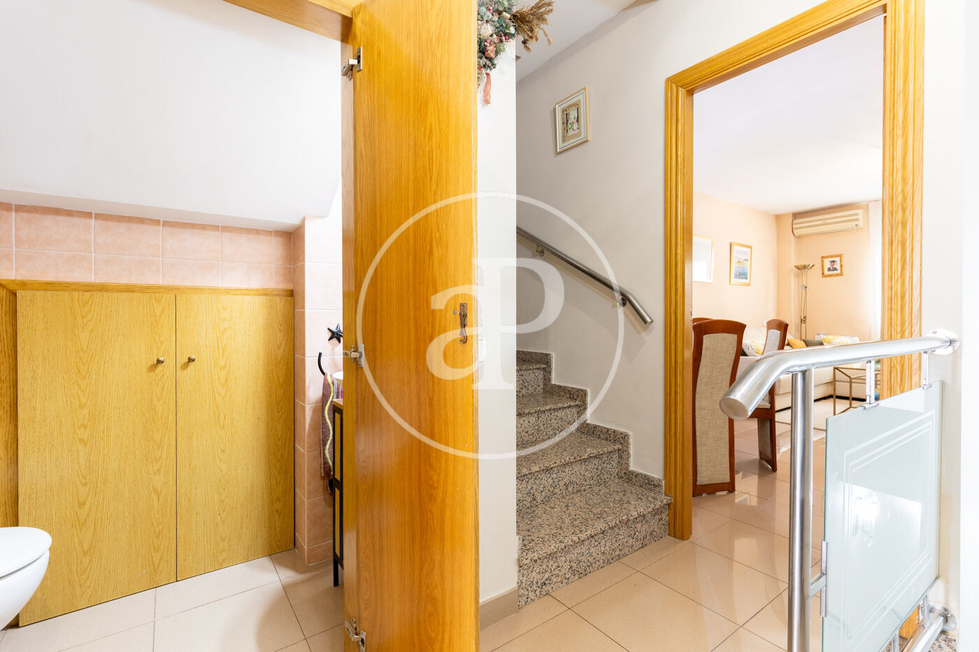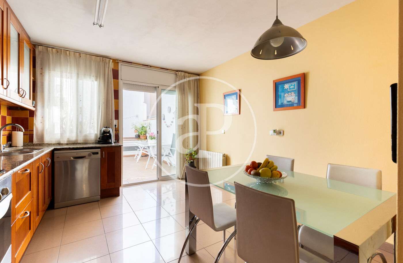 Per accedir a la primera planta cal pujar unes escales que ens porten a la zona de dia. En aquesta planta trobem la cuina, molt àmplia i lluminosa, amb espai per col·locar-hi una taula per esmorzar o menjar en família. Des de la cuina s’accedeix a la terrassa orientada al sud-est, equipada amb tendal. El menjador, molt ben distribuït, disposa d’aire condicionat amb bomba de calor i fred. En aquesta mateixa planta hi ha també un lavabo de cortesia.