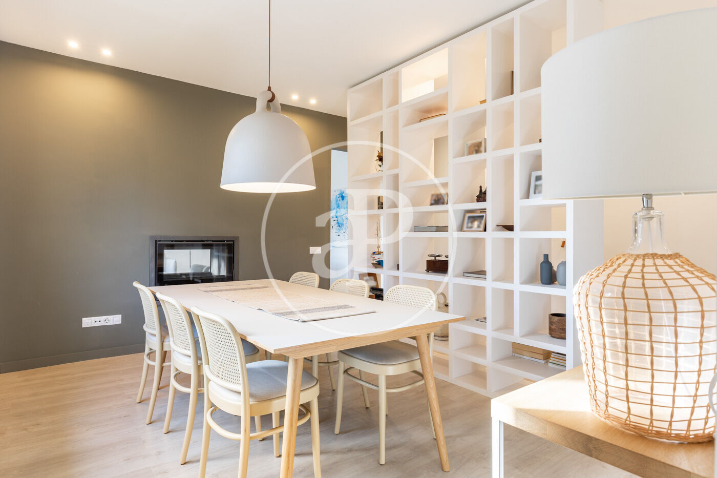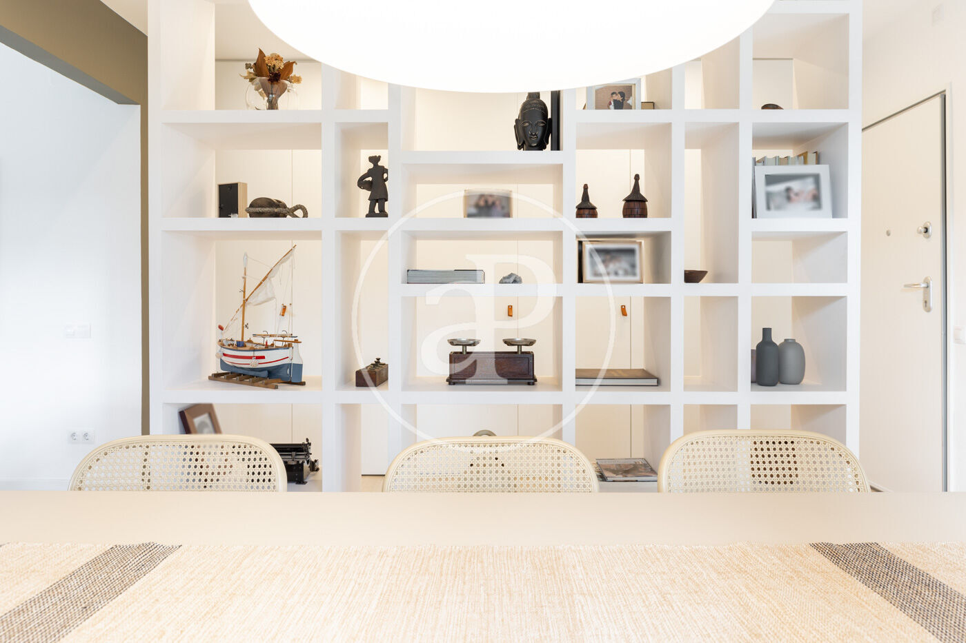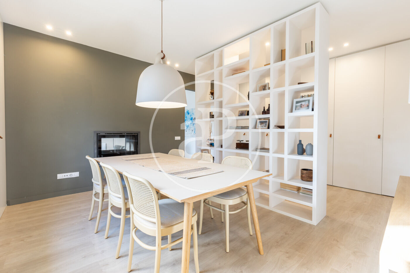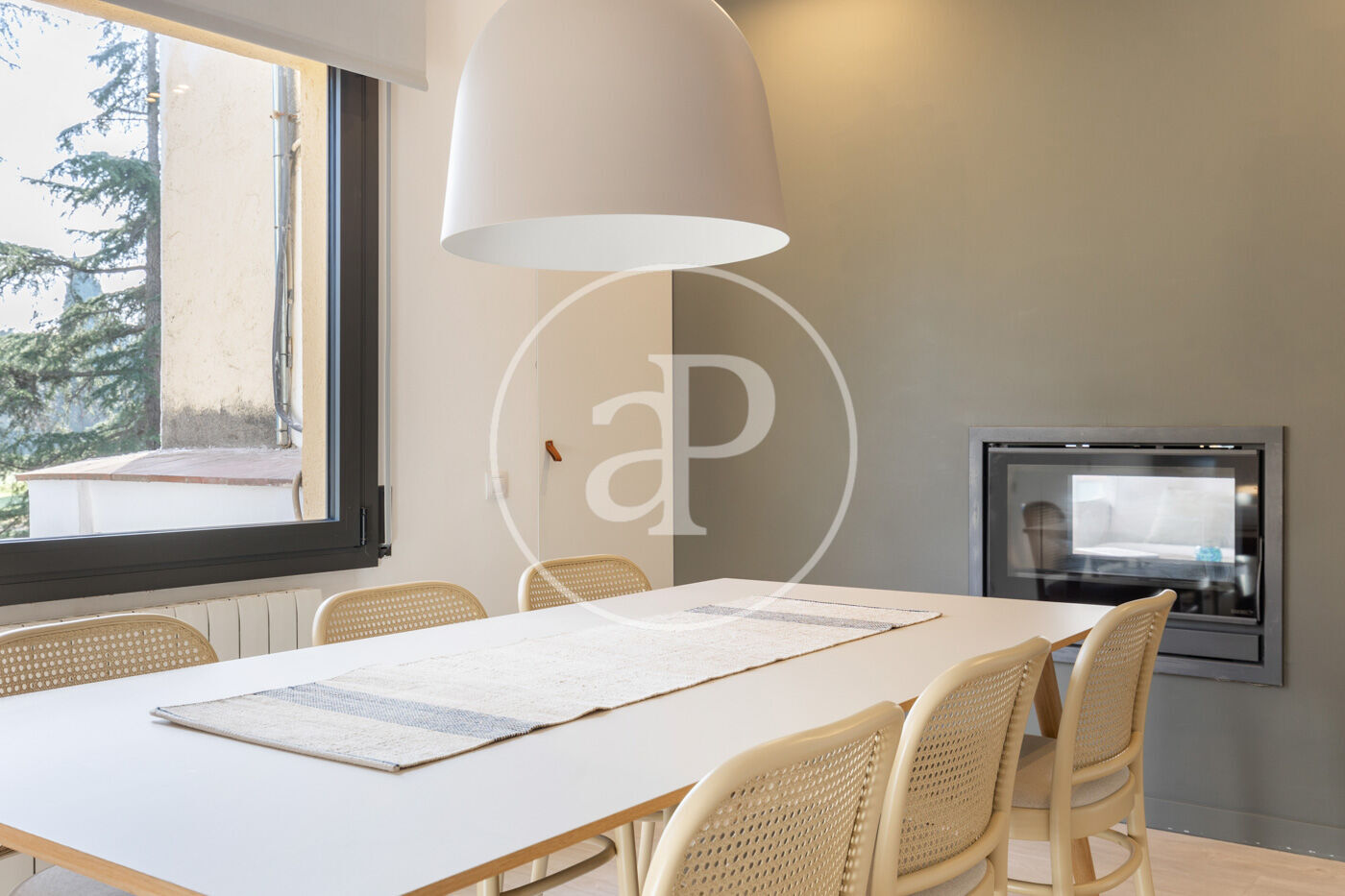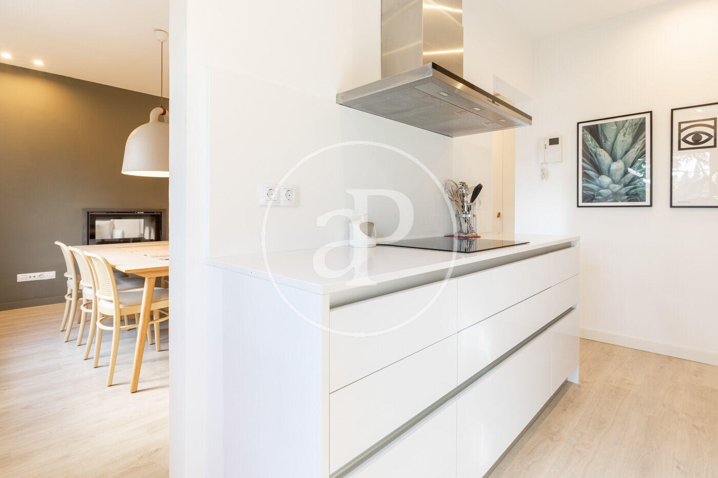 Tot el pis està reformat íntegrament, la cuina totalment equipada, minimalista, amb tots els artefactes apanalados, per a no irrompre en la impol·luta imatge del disseny nòrdic que caracteritza a aquesta reforma. El menjador i el saló estan separats per una petita paret i una xemeneia envidrada que serveix a tots dos ambients.