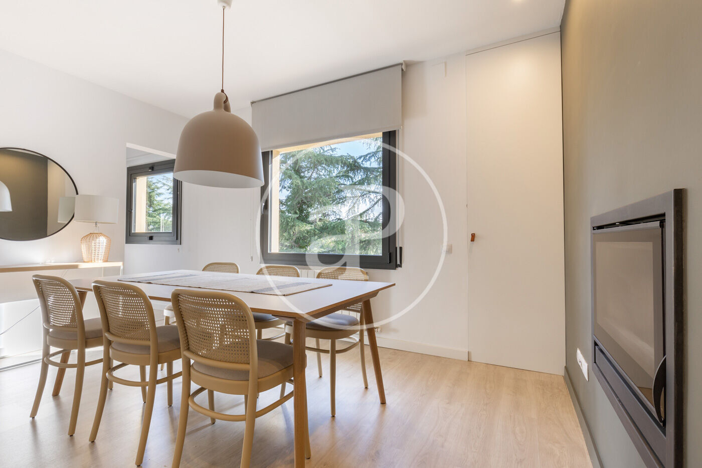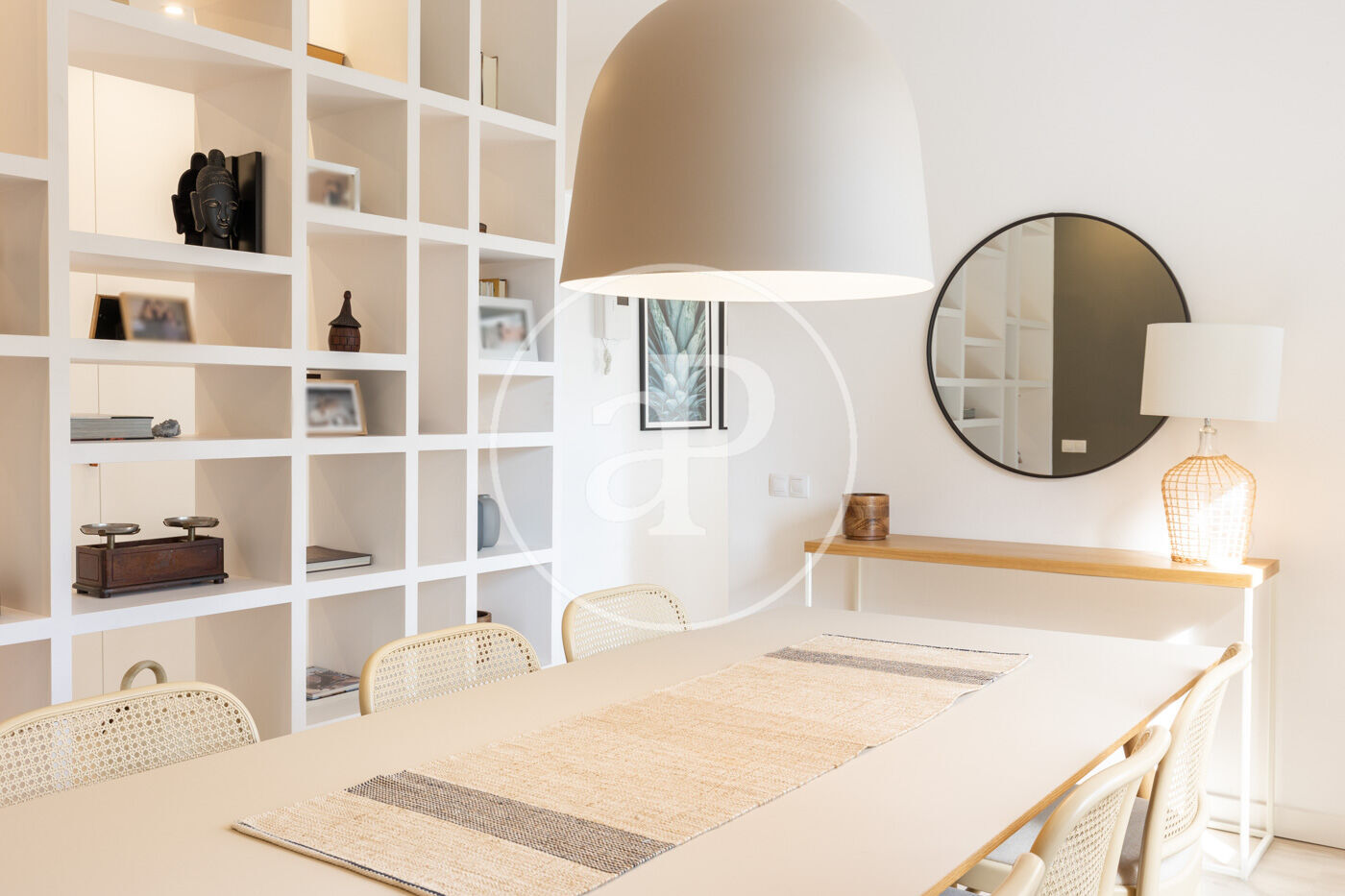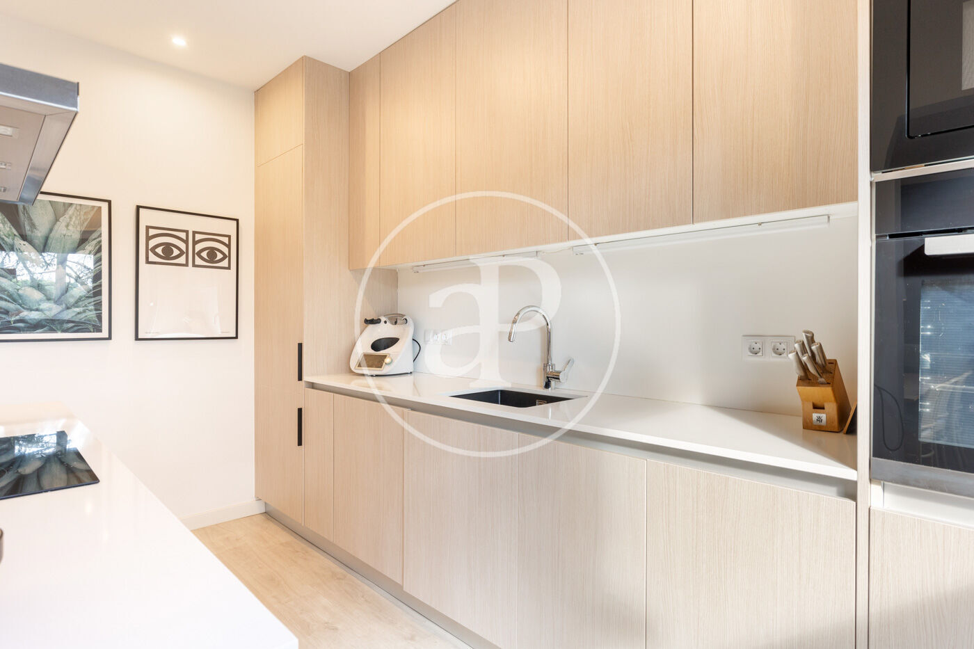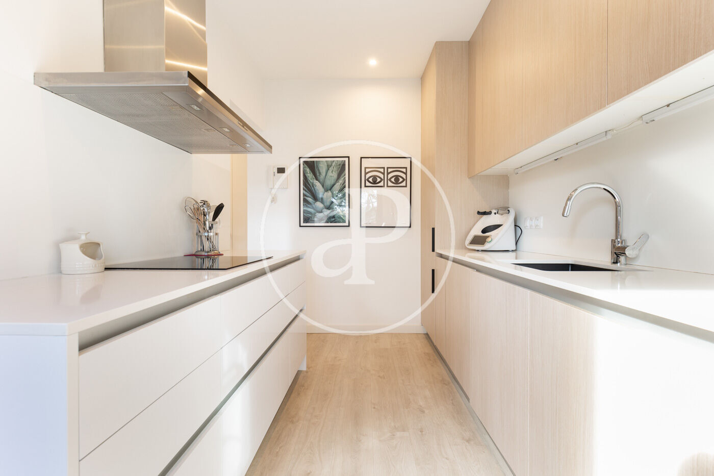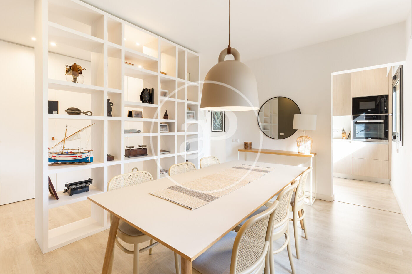 Tot el pis està reformat íntegrament, la cuina totalment equipada, minimalista, amb tots els artefactes apanalados, per a no irrompre en la impol·luta imatge del disseny nòrdic que caracteritza a aquesta reforma. El menjador i el saló estan separats per una petita paret i una xemeneia envidrada que serveix a tots dos ambients.