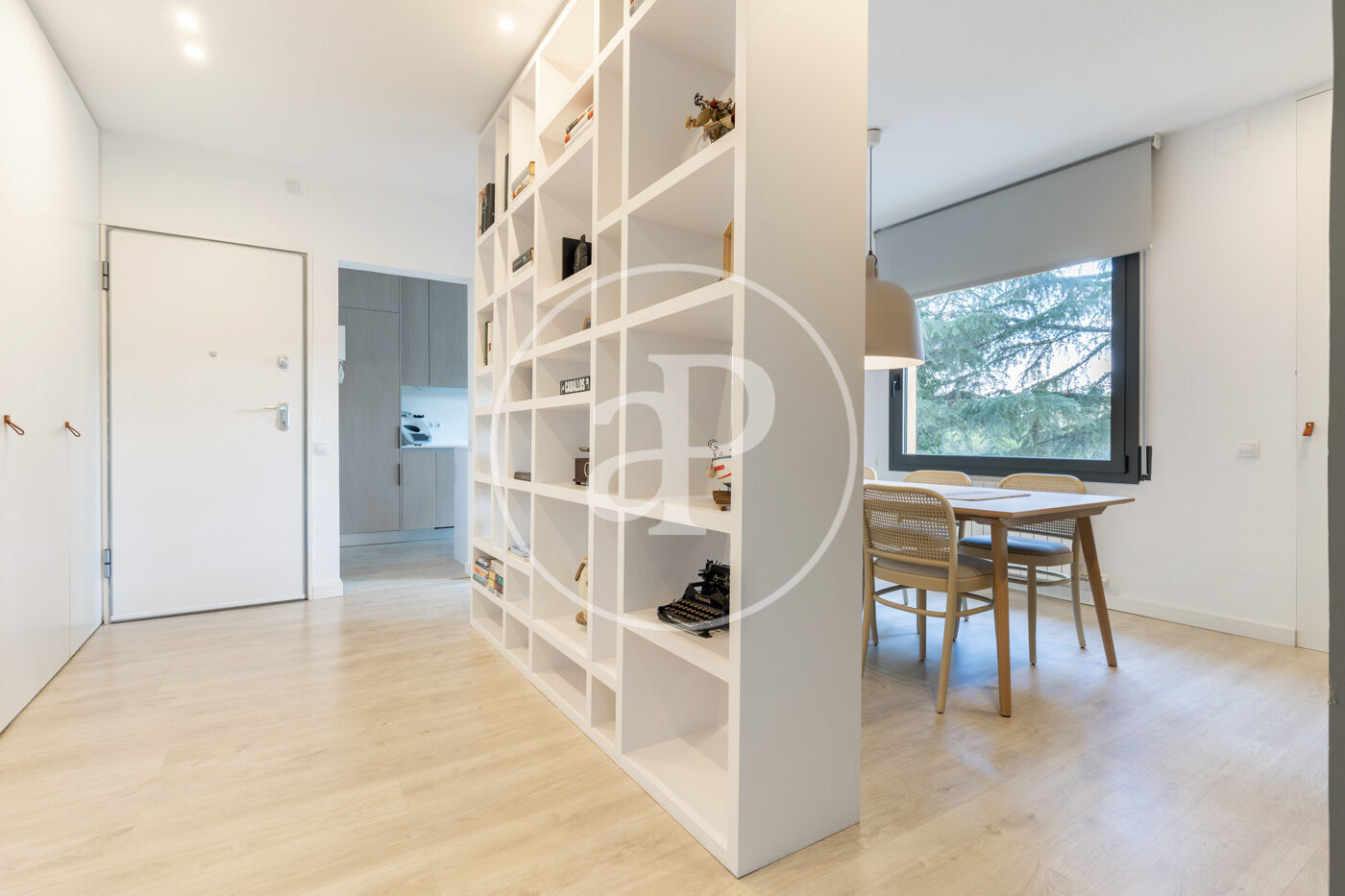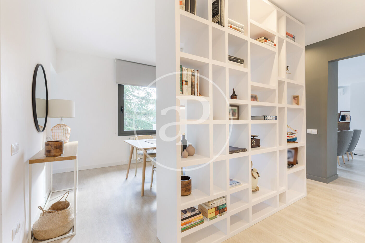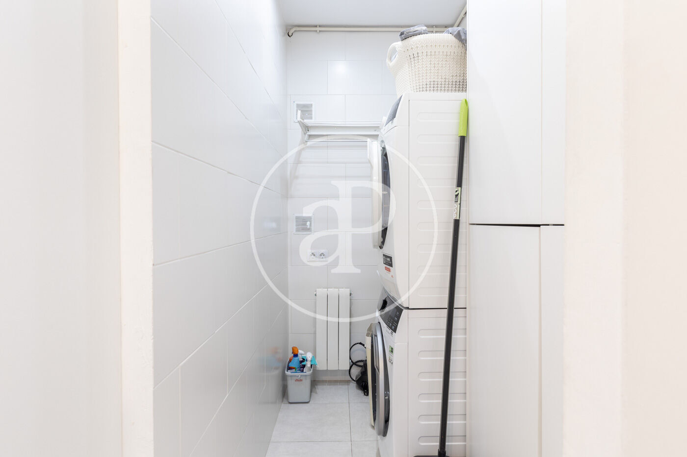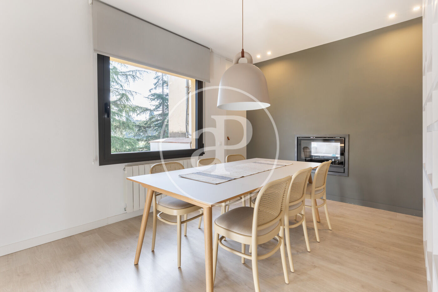 Tot el pis està reformat íntegrament, la cuina totalment equipada, minimalista, amb tots els artefactes apanalados, per a no irrompre en la impol·luta imatge del disseny nòrdic que caracteritza a aquesta reforma. El menjador i el saló estan separats per una petita paret i una xemeneia envidrada que serveix a tots dos ambients.