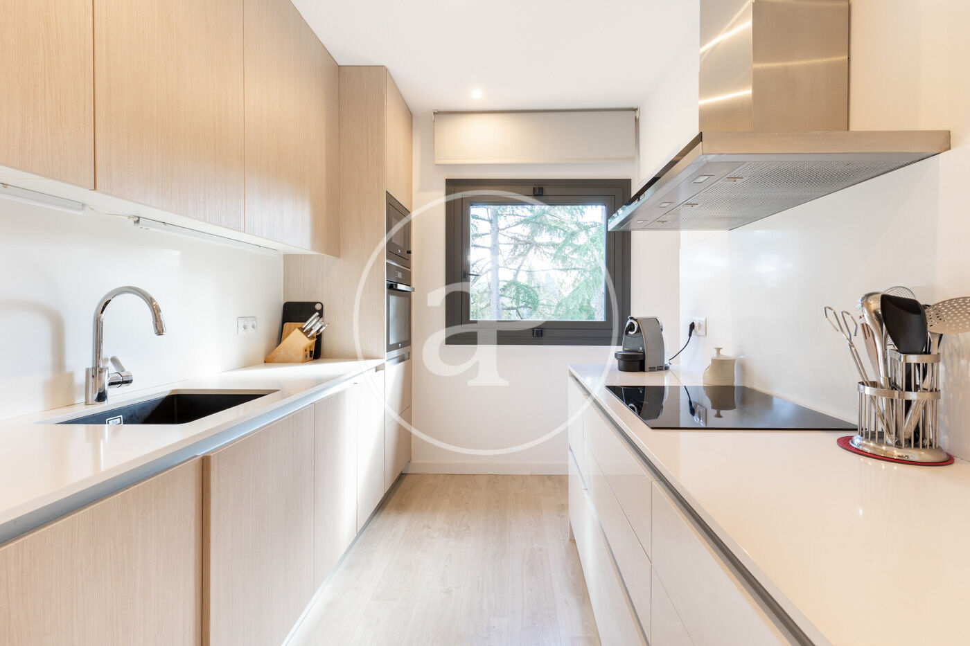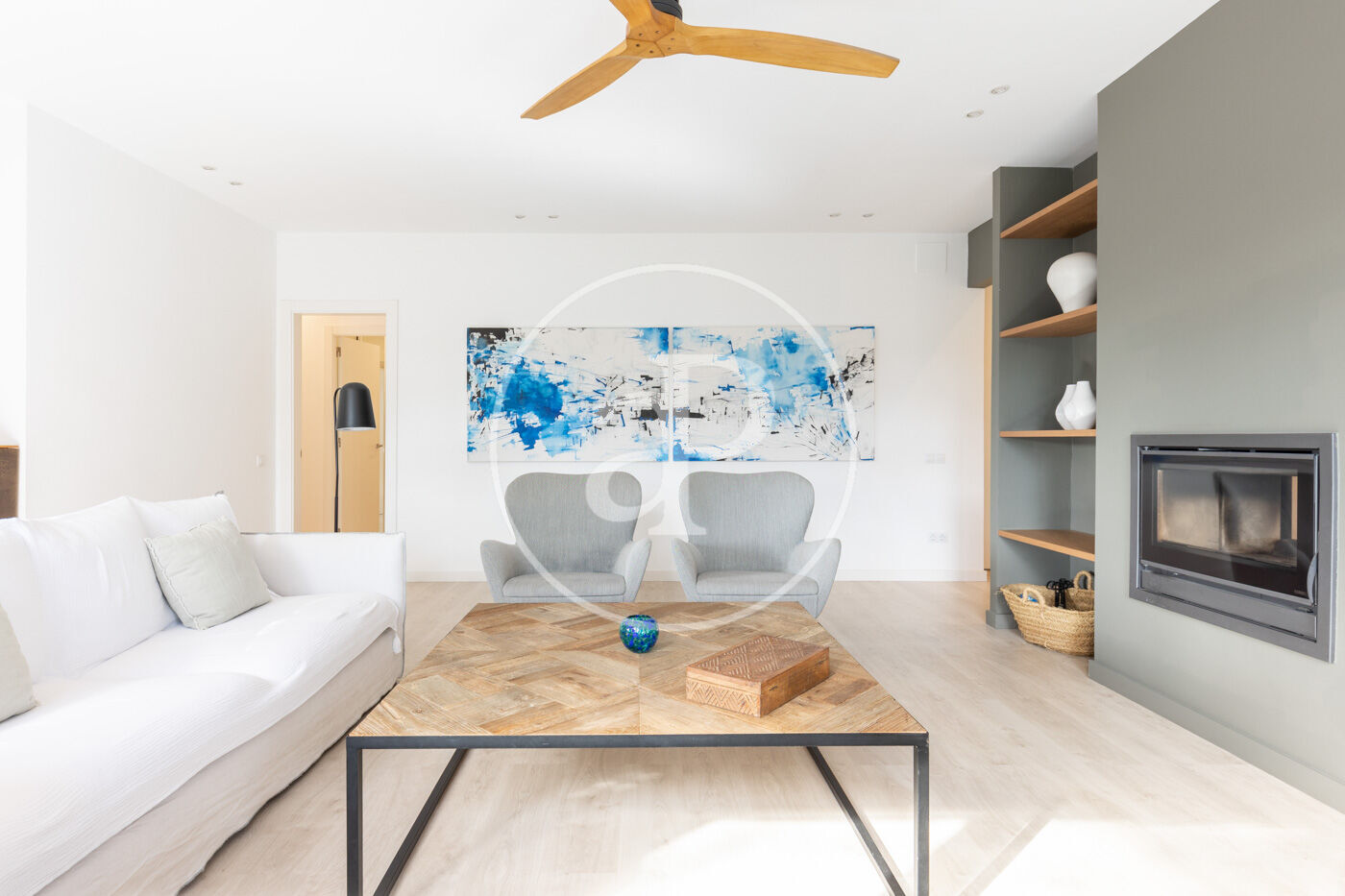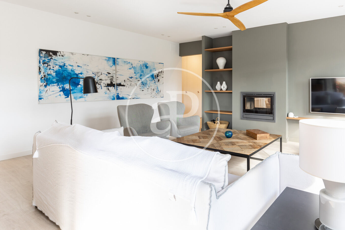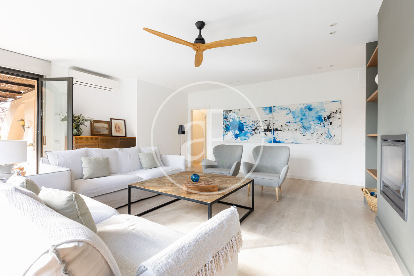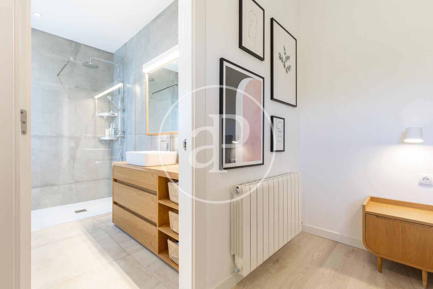 Tot el pis està reformat íntegrament, la cuina totalment equipada, minimalista, amb tots els artefactes apanalados, per a no irrompre en la impol·luta imatge del disseny nòrdic que caracteritza a aquesta reforma. El menjador i el saló estan separats per una petita paret i una xemeneia envidrada que serveix a tots dos ambients.