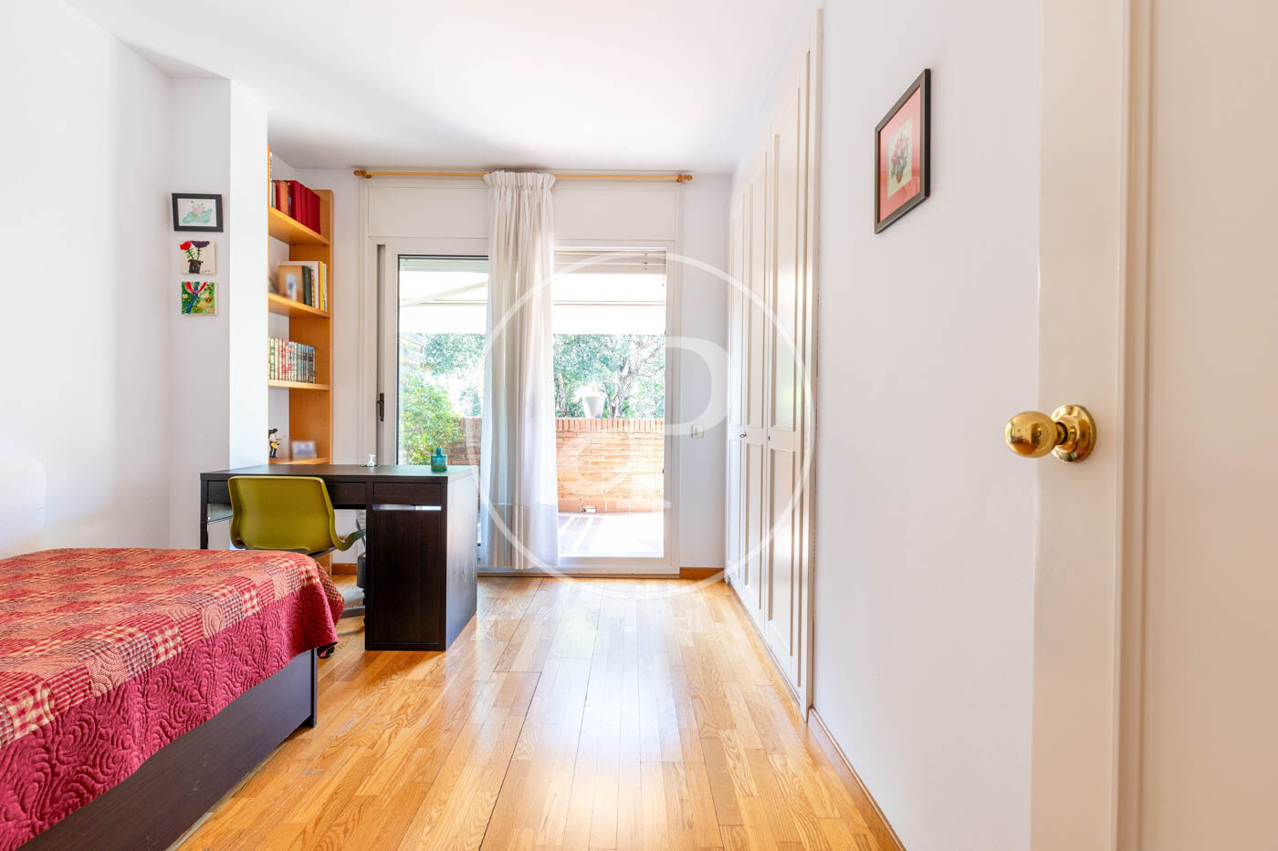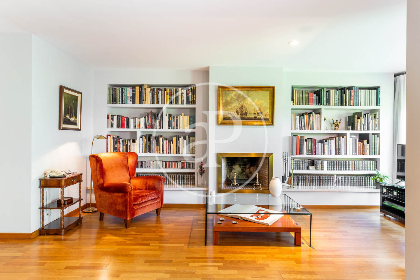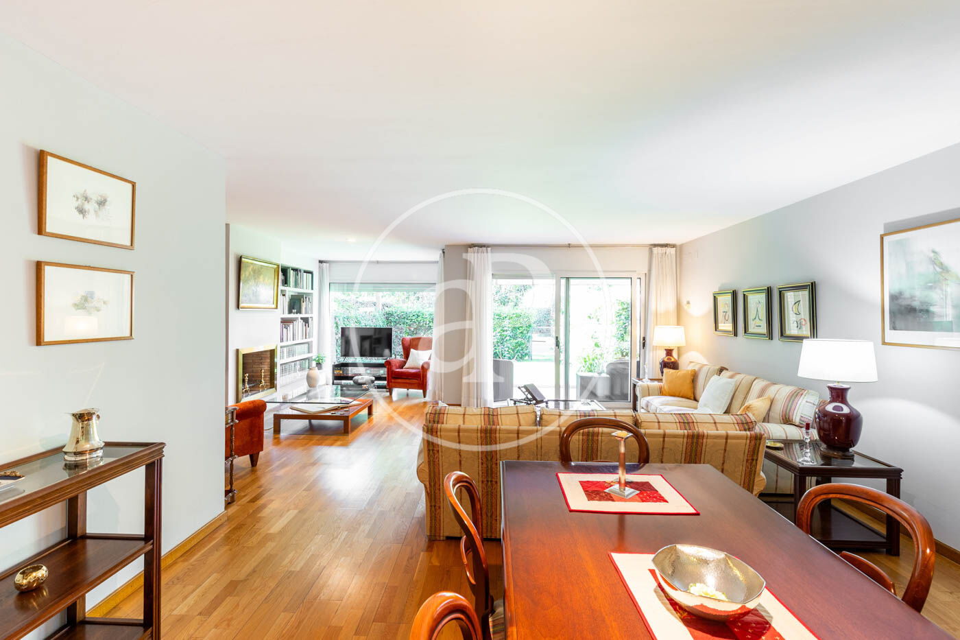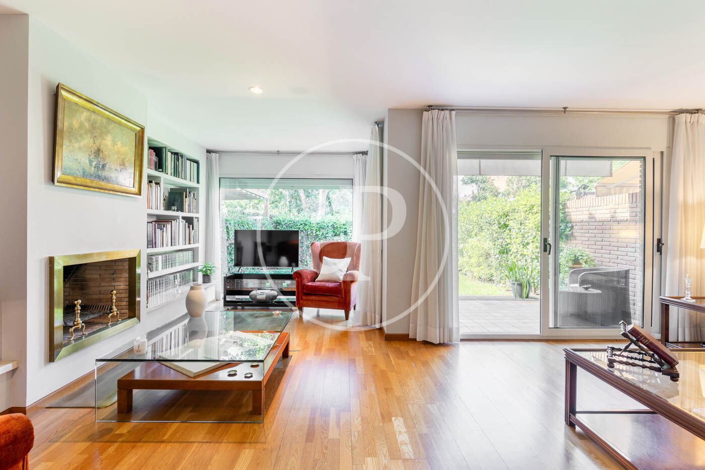 Planta baixa: Rebedor amb armaris de paret, ampli saló menjador de 45m2 amb xemeneia de llenya i accés al jardí privat, cuina-office totalment equipada, lavabo de cortesia i dues terrasses.