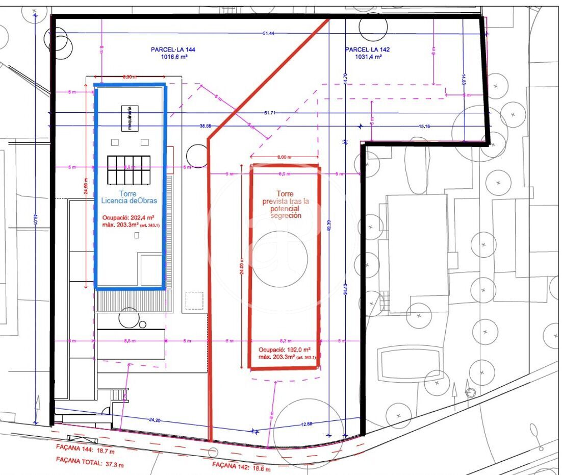Parcel·la plana de 2.048 m², classificació 20A11. Possibilitat de ser segregada. Edificació màxima de 572 m², edificabilitat del 50 %, ocupació en planta del 20 %. Construcció: planta baixa + 2 pisos fins a un màxim de 9,15 m d’alçada. Es pot afegir una construcció auxiliar del 3 %.