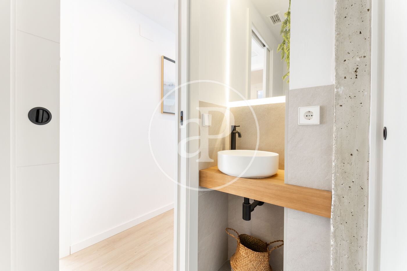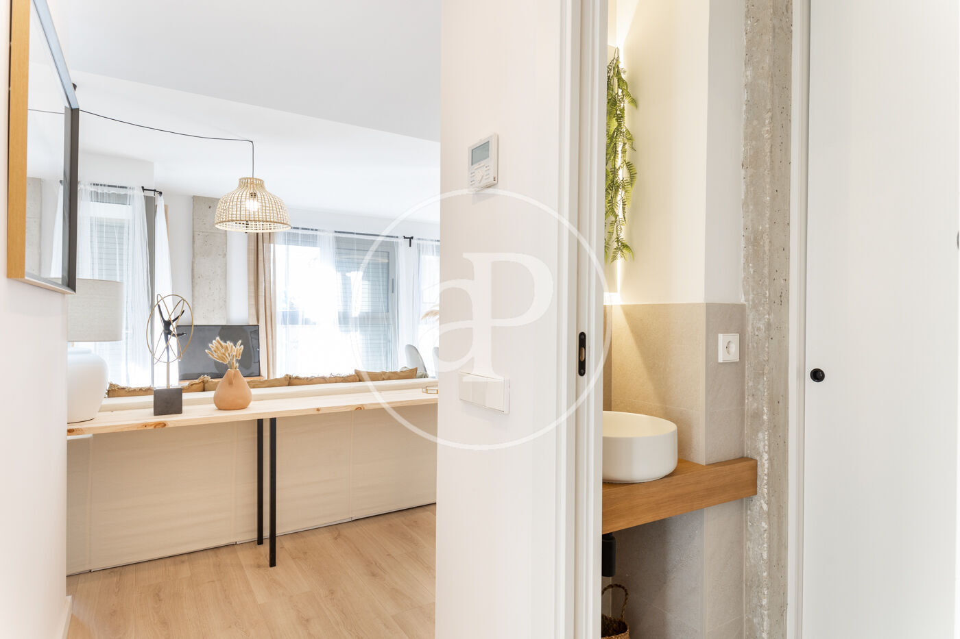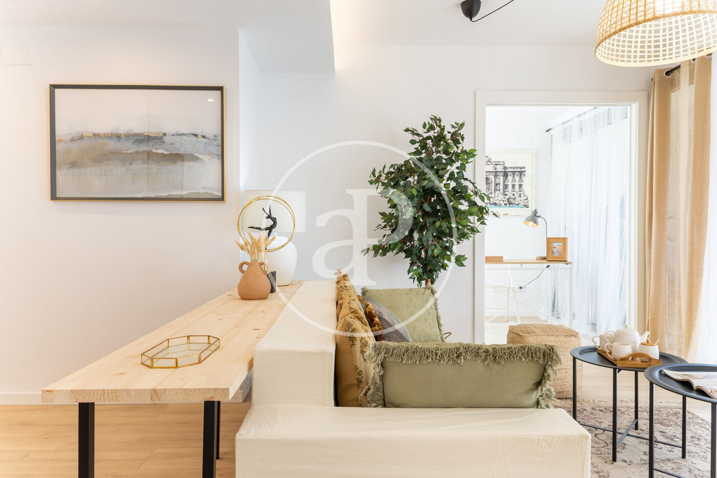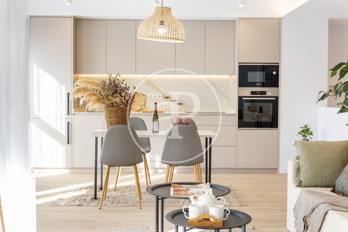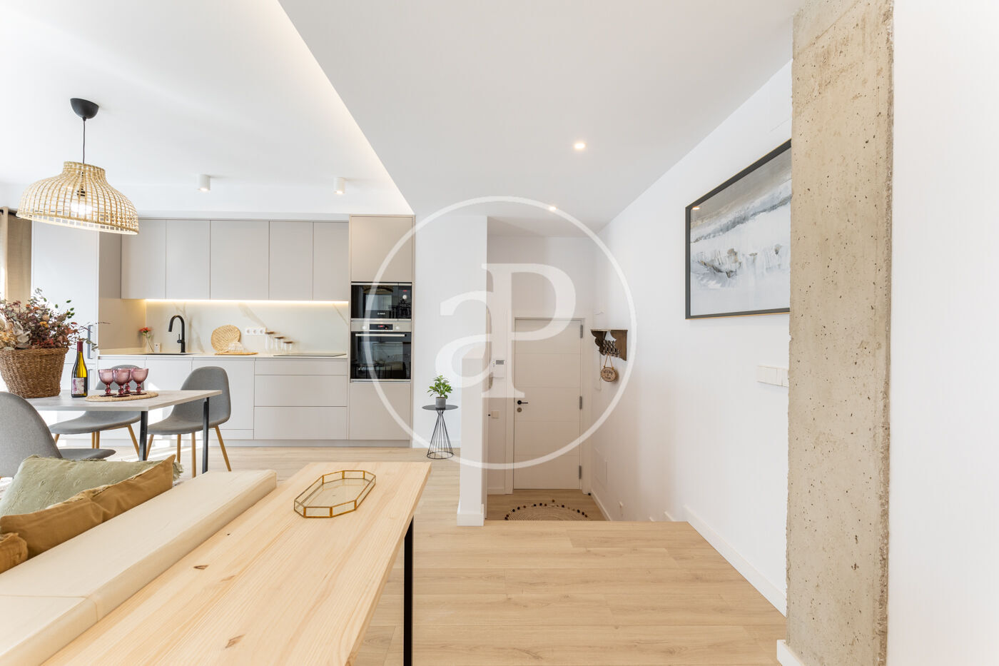 Àtic reformat amb encant. Situat a l'última planta d’una finca típica barcelonina, aquest preciós àtic de lloguer et captivarà per la seva combinació perfecta entre l’encant rústic i el disseny contemporani. Una joia amagada en un carrer tranquil, a pocs passos de les Rambles, ideal per a qui busca comoditat, llum natural i caràcter. En creuar el llindar, ens rep un espai obert i acollidor, on la sala d’estar i el menjador s’integren amb la cuina en un ambient diàfan. Les bigues de fusta vistes i els sostres inclinats amb totxo català aporten autenticitat i calidesa. La paret de maó original, restaurada, emmarca una sala d’estar amb sofà blanc i coixins neutres que potencien la lluminositat. Les grans portes balconeres de fusta aporten llum natural tot el dia. La zona de menjador es presenta com un racó ideal per compartir sopars o treballar des de casa, amb una taula de fusta massissa i cadires de disseny escandinau. Des d’aquí, accedim a una cuina moderna i funcional: completament equipada amb placa vitroceràmica, forn, microones i múltiples armaris. L’acabat blanc dels mobles i l’encimera clara mantenen l’espai fresc i net, mentre que la il·luminació LED n’augmenta la funcionalitat. L’apartament disposa de tres dormitoris. El principal, íntim i serè, segueix l’estil natural de la resta del pis, amb tèxtils clars, terra de fusta i armari encastat. Els altres dormitoris individuals tenen armaris de fusta clara i una finestra que garanteix llum natural. Ideals com a habitació infantil, despatx o per a convidats. Cada racó ha estat curosament renovat i decorat amb gust, mantenint l’essència de l’arquitectura catalana tradicional però amb totes les comoditats actuals. Els terres de parquet, les fusteries en tons càlids i la distribució optimitzada fan d’aquest àtic una opció única per viure al centre sense renunciar al confort. La finalitat del contracte és temporal.  * En compliment de la Llei 12/2023 i la Llei 18/2007 informem que:Índex de R.P.LL: 14,27 € / m2 Preu de referència estatal 955,00 €Lloguer de l'últim contracte d'arrendament: 1.590,00 €Este propietario ostenta la condición de gran tenedor.