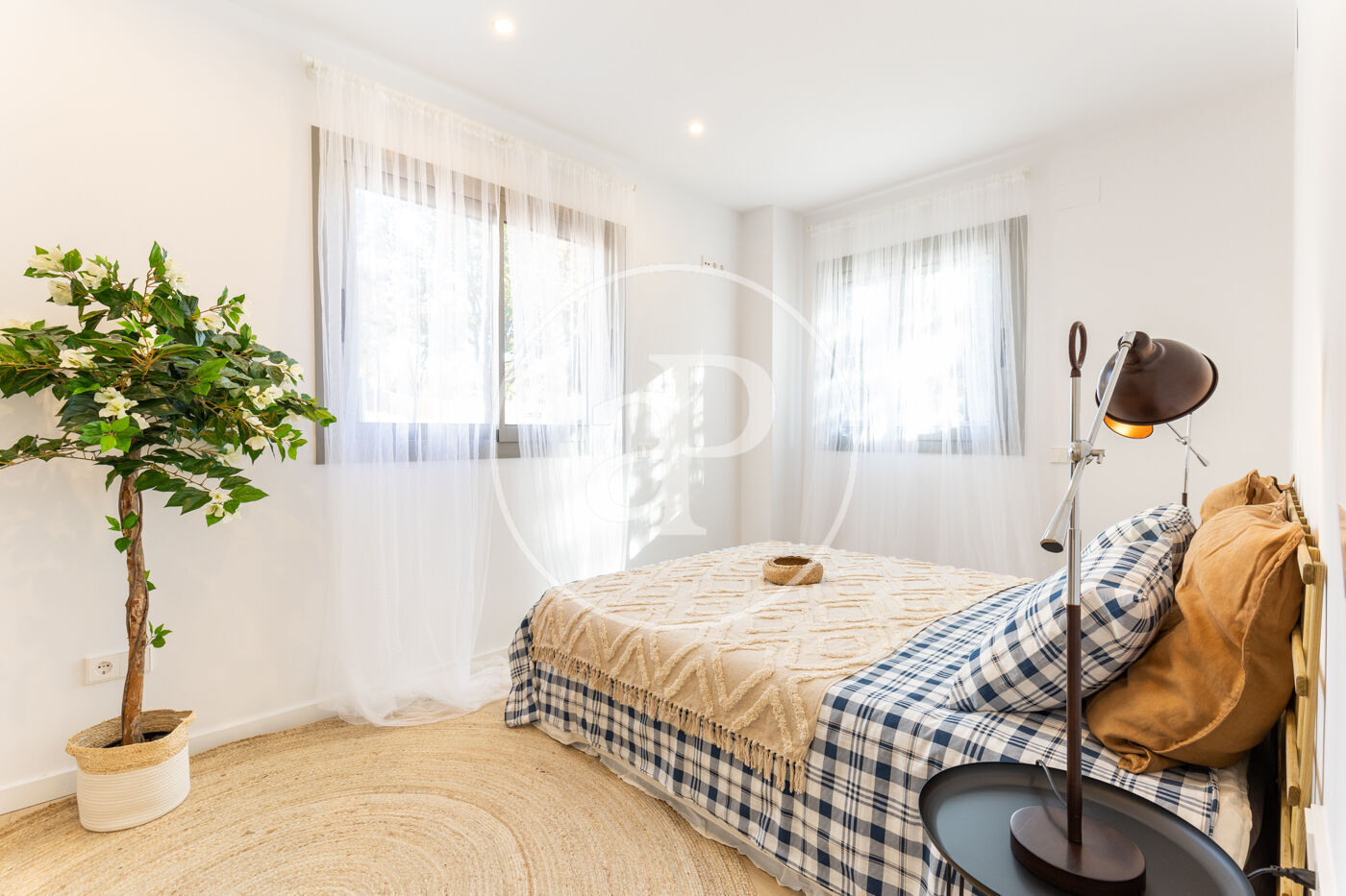 Situada en un entorn natural privilegiat, aquesta espectacular casa mallorquina a Esporles combina l´encant de la pedra tradicional amb un interiorisme modern i funcional. L´habitatge destaca pel seu ampli saló-menjador, un espai de gran volum amb sostres alts amb bigues vista i mobiliari de disseny contemporani. Aquest saló connecta directament amb una gran terrassa coberta des d'on es gaudeix d'unes vistes clares al camp ia la Serra de Tramontana. La cuina, independent però visualment integrada al saló mitjançant una barra moderna amb tamborets, està completament equipada i pensada per gaudir tant del dia a dia com d'ocasions especials. Té una zona de bugaderia independent. A la mateixa zona hi trobem una sala polivalent ideal per utilitzar-la com a sala de televisió, despatx sala d'una quarta habitació. A través d'una moderna escala de fusta i ferro accedim a la zona de nit on trobem tres habitacions dobles, totes amb vestidor i bany en suite, oferint privacitat i confort. A la mateixa zona hi trobem un lavabo per a convidats. A l'exterior, la propietat ofereix una piscina privada envoltada de jardí, ideal per gaudir del clima mediterrani. Compte també amb aparcament per a dos vehicles i diverses places exteriors. Com a valor afegit, la propietat inclou un apartament dúplex independent, perfecte per a convidats o com a zona de treball. Aquest compte amb una habitació doble, un bany complet, un lavabo i una cuina completament moblada i equipada. Mascotes a consultar Una propietat única que combina disseny, funcionalitat i entorn natural. L'IBI, l'aigua i el manteniment de jardí i piscina estan inclosos en el preu del lloguer, la resta de subministraments seran a càrrec de l'arrendatari. T'imagines viure aquí? Esperem la teva trucada.