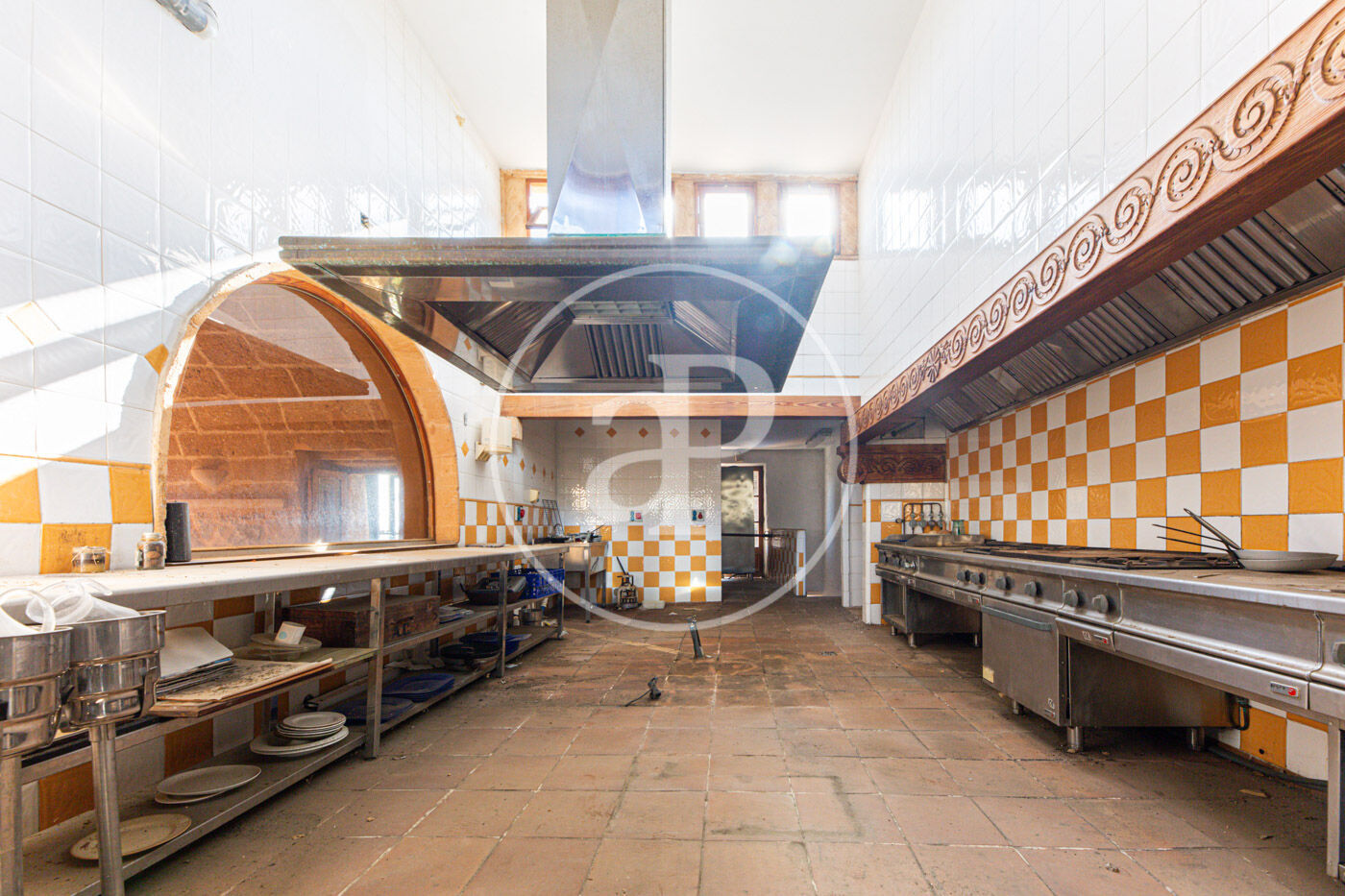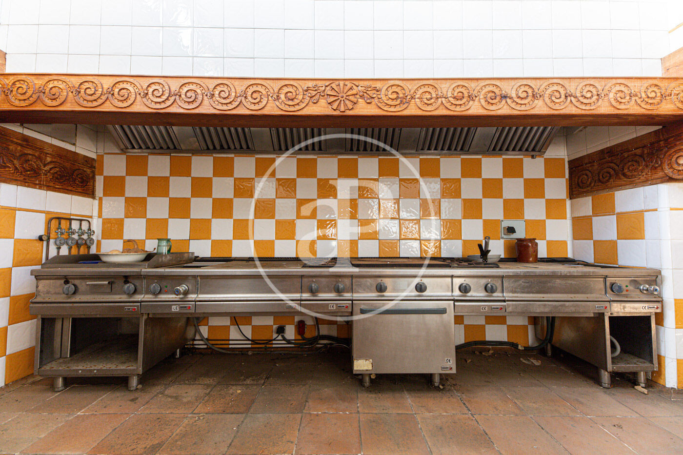Cuina de restaurant amb materials nobles, insercions de fusta i rajoles mallorquines