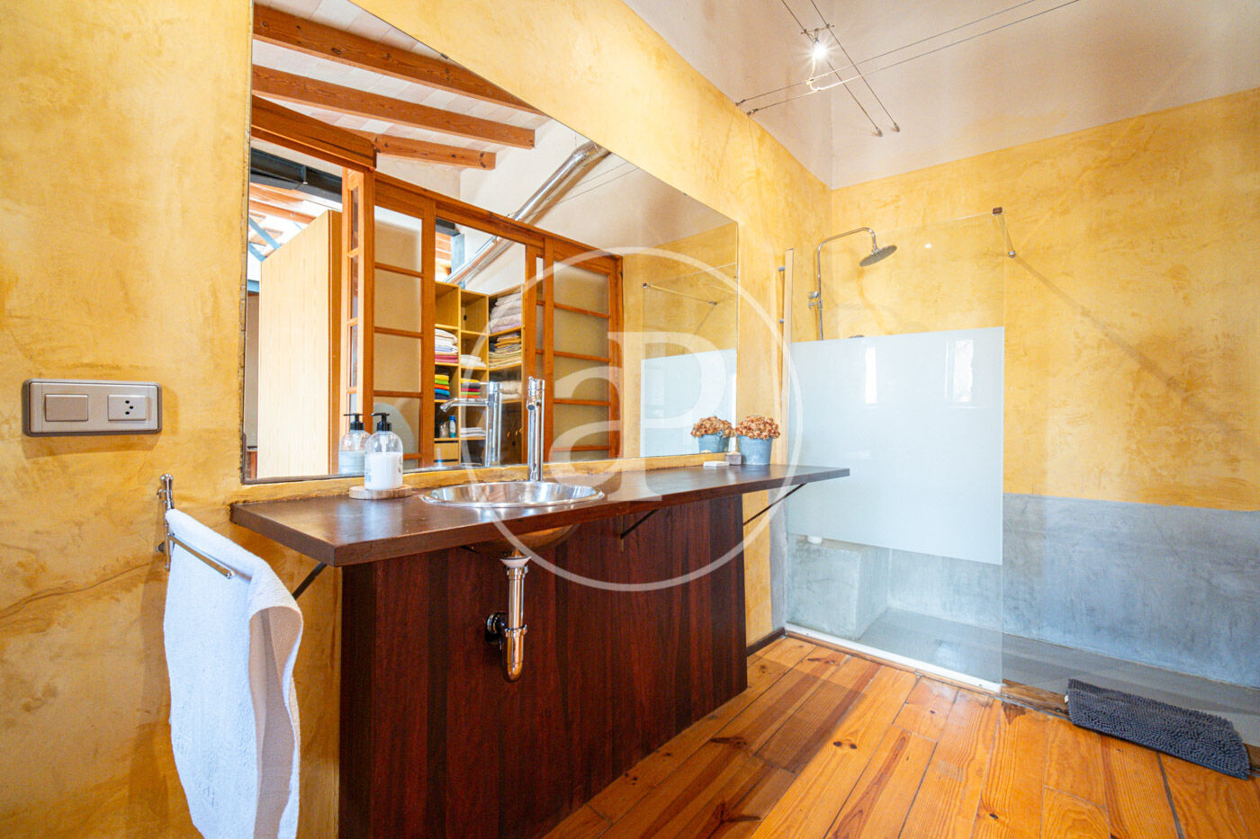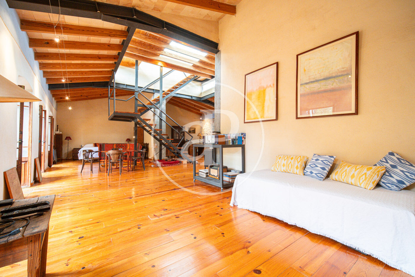 La primera planta compta amb un espai enorme tot obert, amb sostres altíssims, sense més separacions que les del bany. Hi ha una xemeneia i dues habitacions obertes.