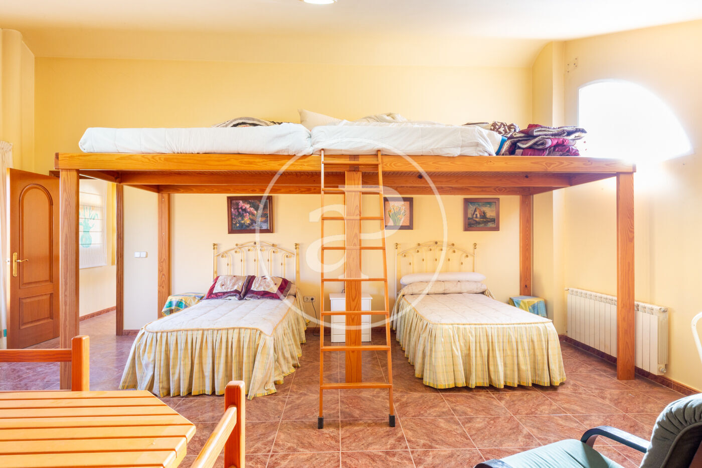 A la planta superior s’ubica una ampla golfes, una estança multifuncional actualment equipada amb quatre llits, ideal com a dormitori, despatx o sala de jocs, i que compta a més amb eixida a una terrassa privada que aporta un espai exterior extra amb excel·lents vistes.