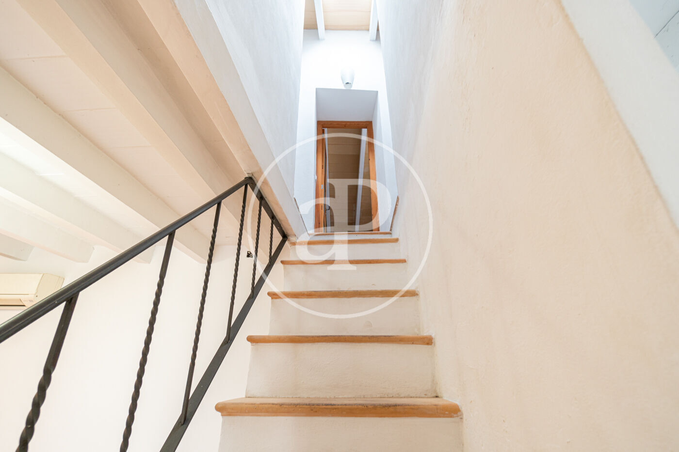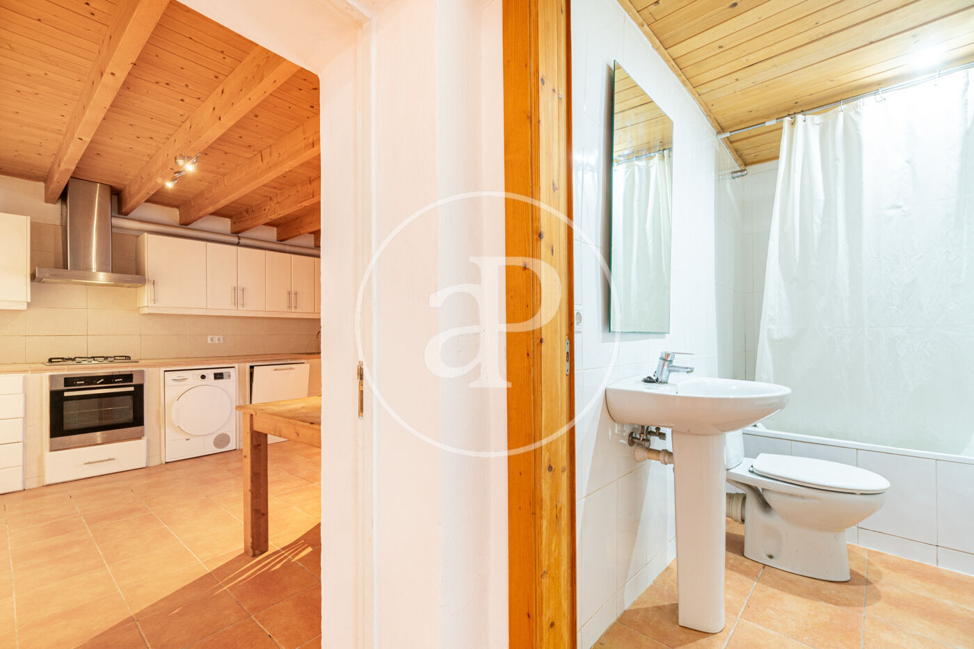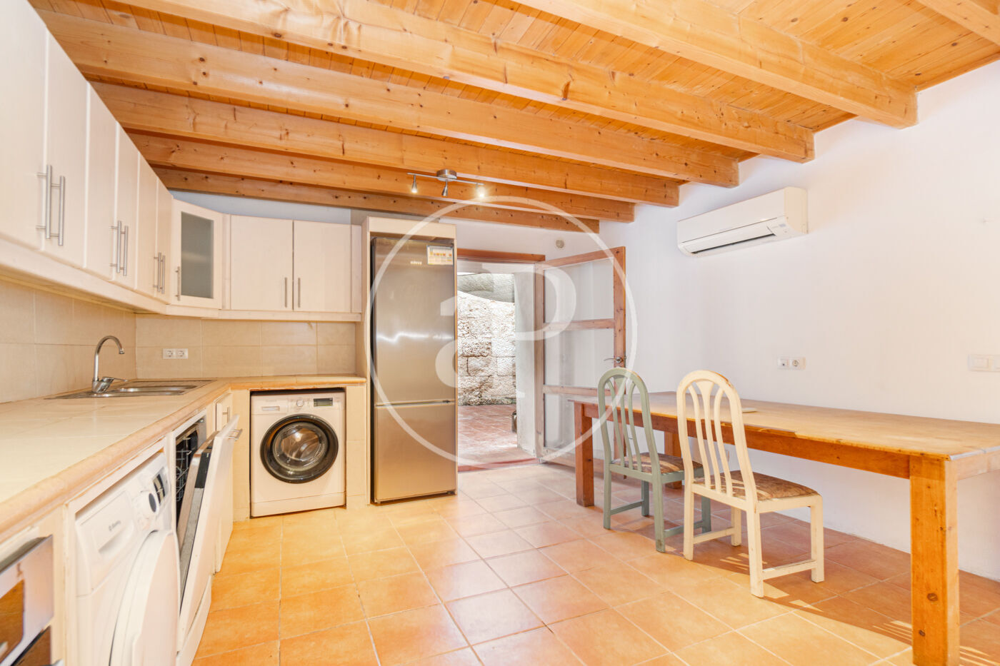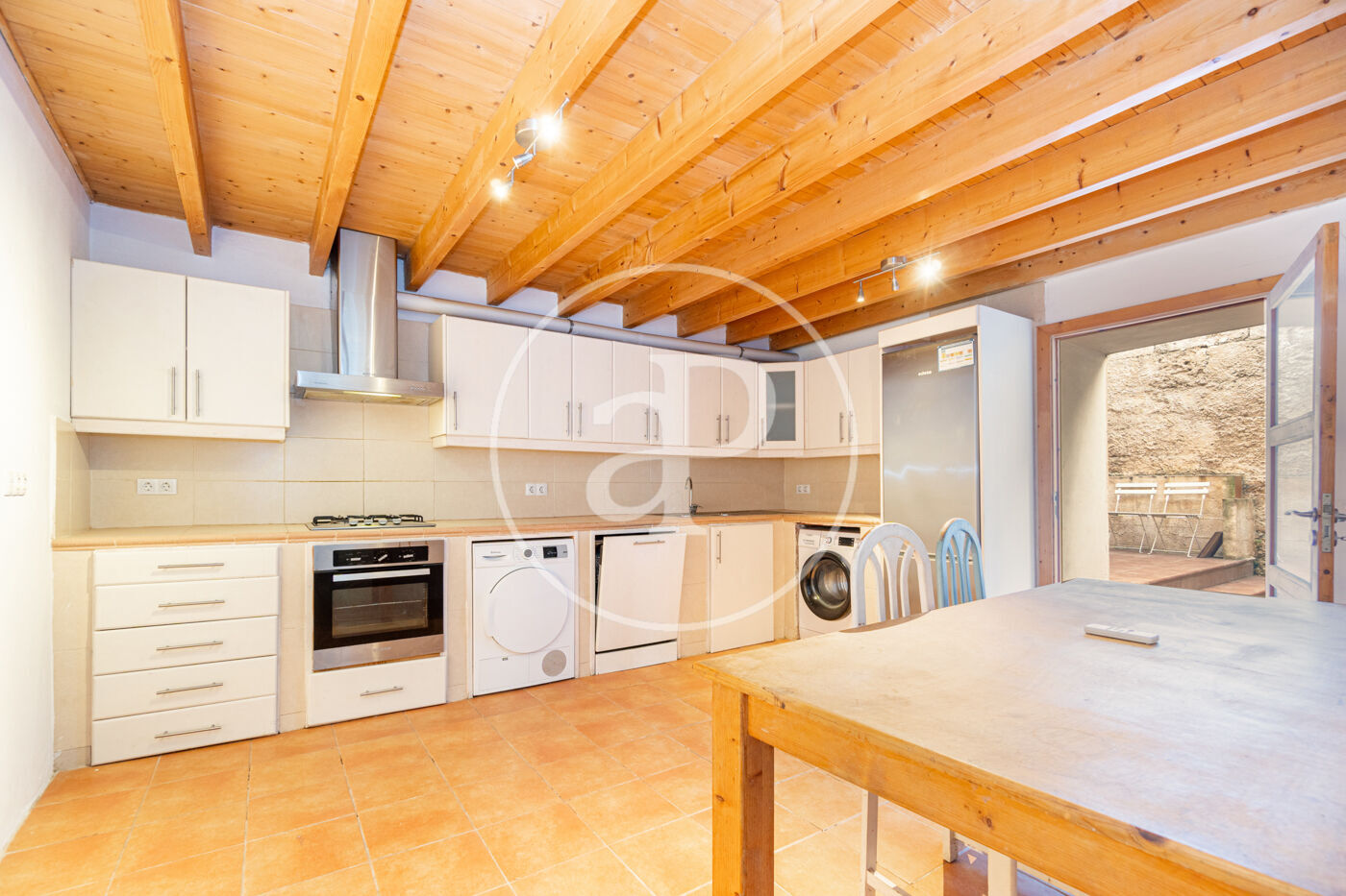 L’escala queda il·luminada amb llum natural per una claraboia. A la planta baixa hi ha la cuina àmplia amb sortida al pati.