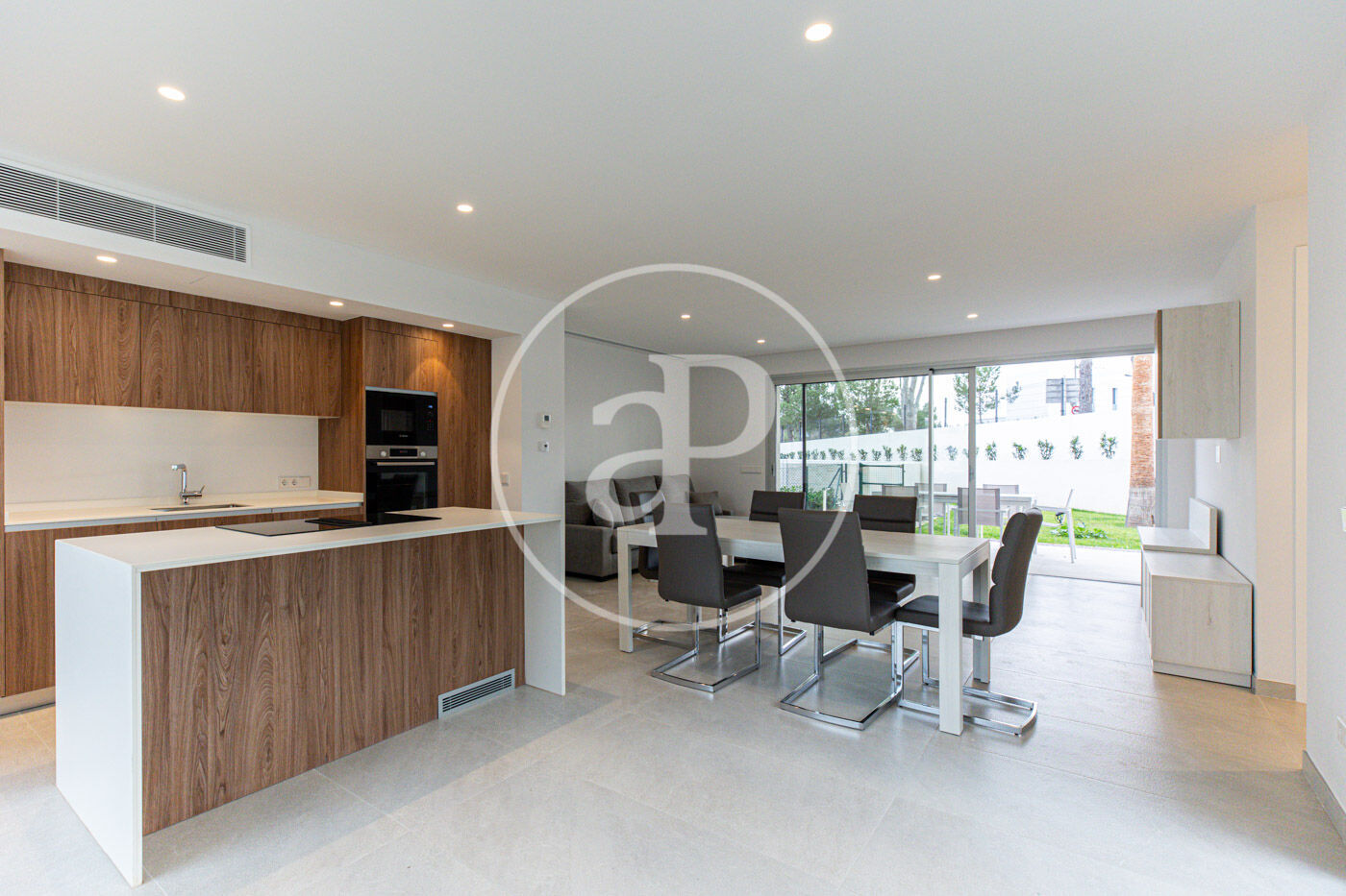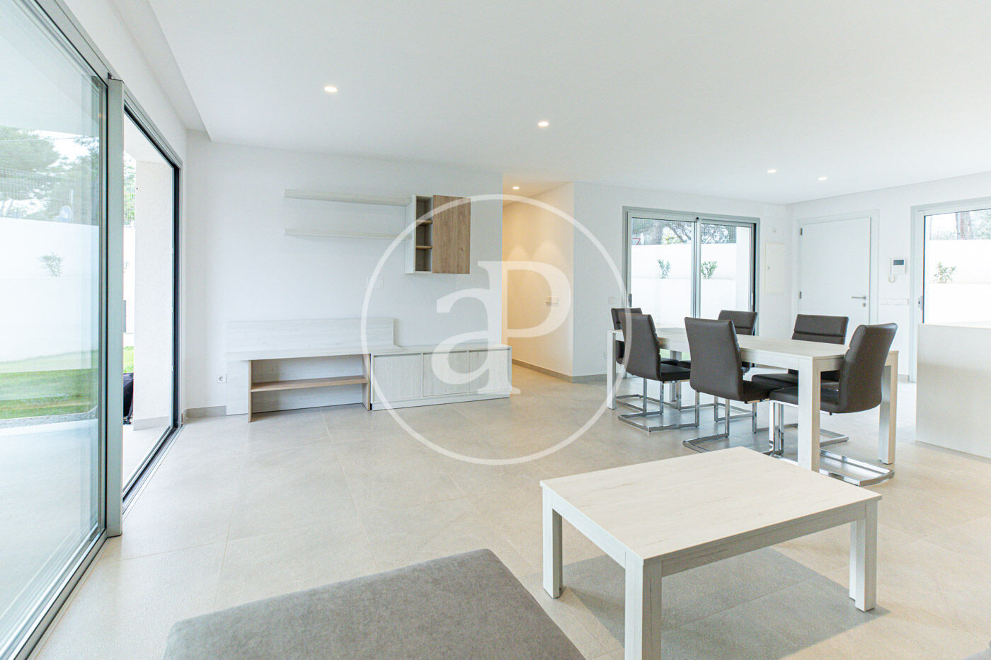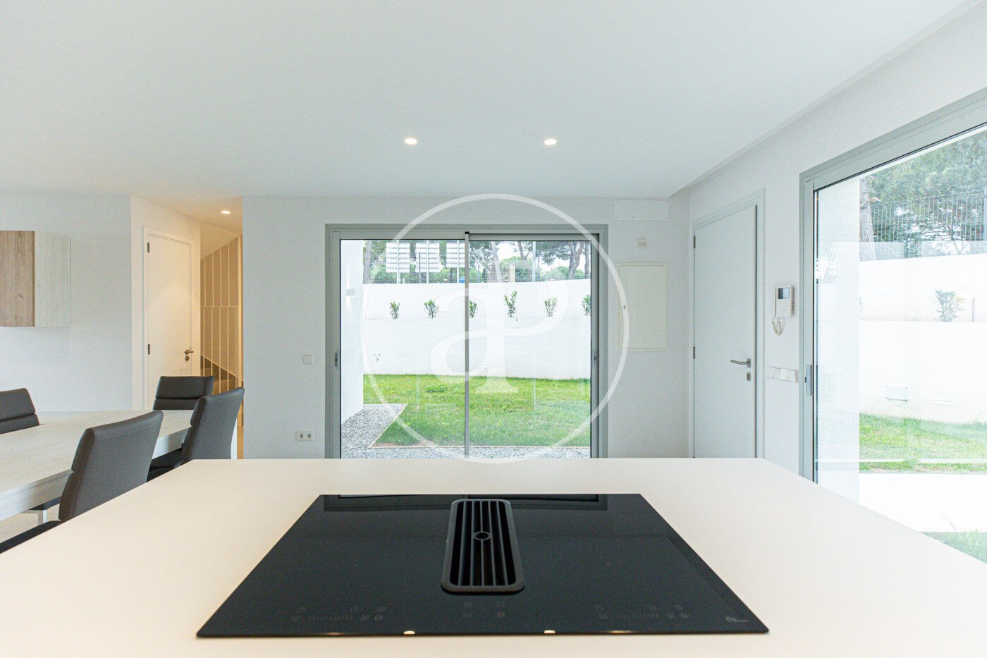 A la planta baixa, l´adossat ofereix accés directe a una àmplia terrassa i jardí, on hi ha una moderna cuina oberta que s´integra harmoniosament amb el saló menjador. A més, en aquesta planta hi ha un lavabo per a més comoditat.