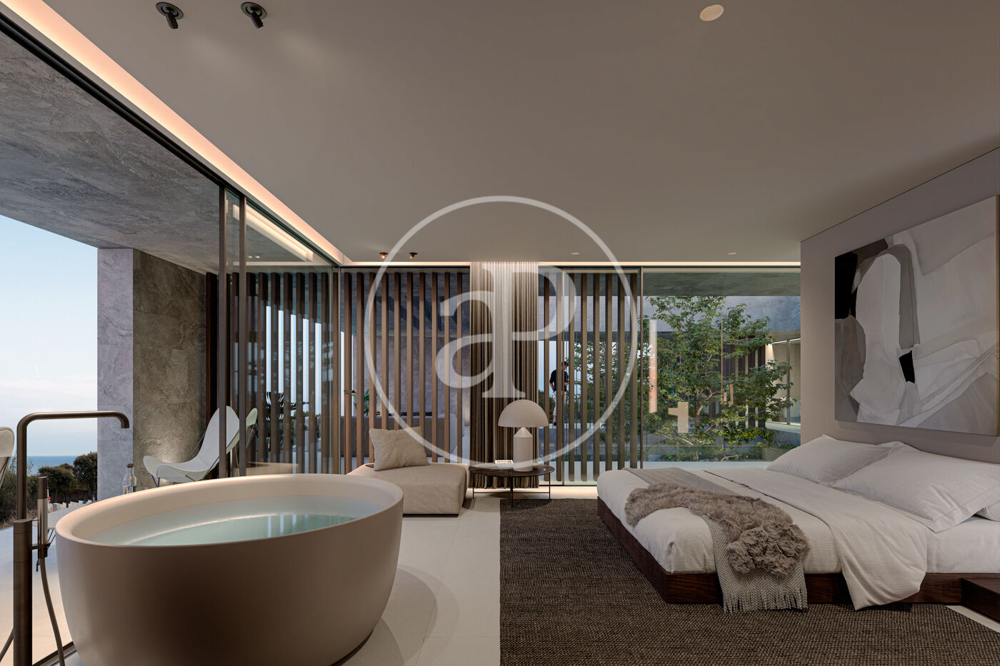 Distribuïda en tres plantes, la casa compta amb cinc habitacions, entre elles una espectacular master suite amb vestidor, bany privat i una banyera ovalada amb vistes al mar. Els espais comuns inclouen un ampli saló-menjador de 44 m², una cuina office de 36 m² equipada amb electrodomèstics d’alta gamma i una rebost, a més d’un pati interior de 35 m², un porxo de 88 m² i un solàrium de 27 m².