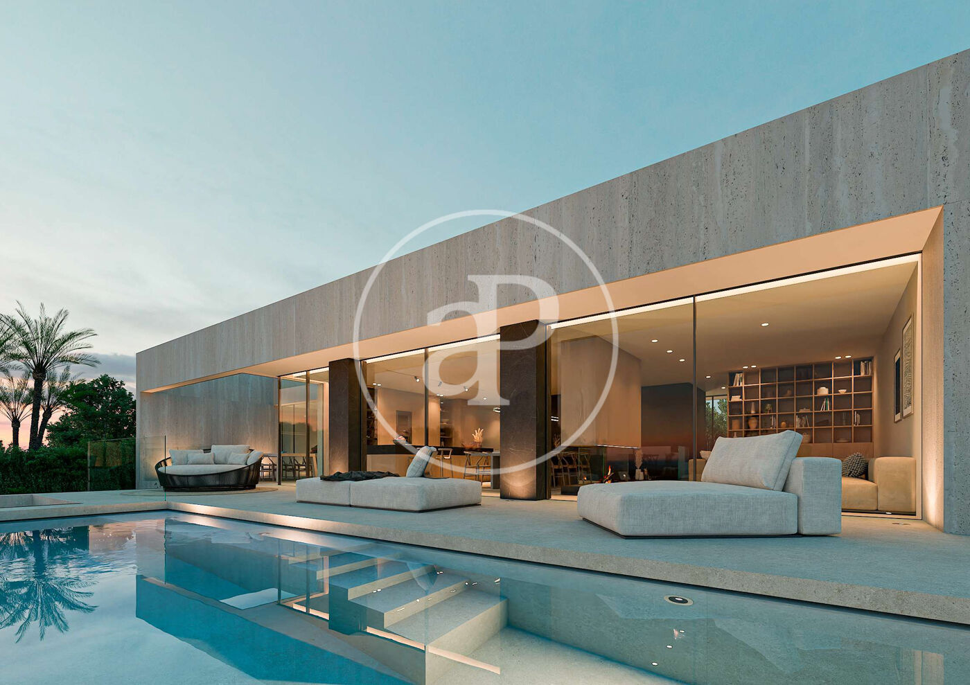 La primera planta destaca per un saló-menjador ampli, connectat a una cuina de disseny oberta, equipada amb electrodomèstics d'alta gamma. Des d’aquí s’accedeix a una gran terrassa amb piscina, un espai idoni per relaxar-se a l’aire lliure mentre es gaudeix de l’harmonia del paisatge. A més, la vila compta amb un despatx privat, perfecte per treballar amb tranquil·litat i envoltat de llum natural.