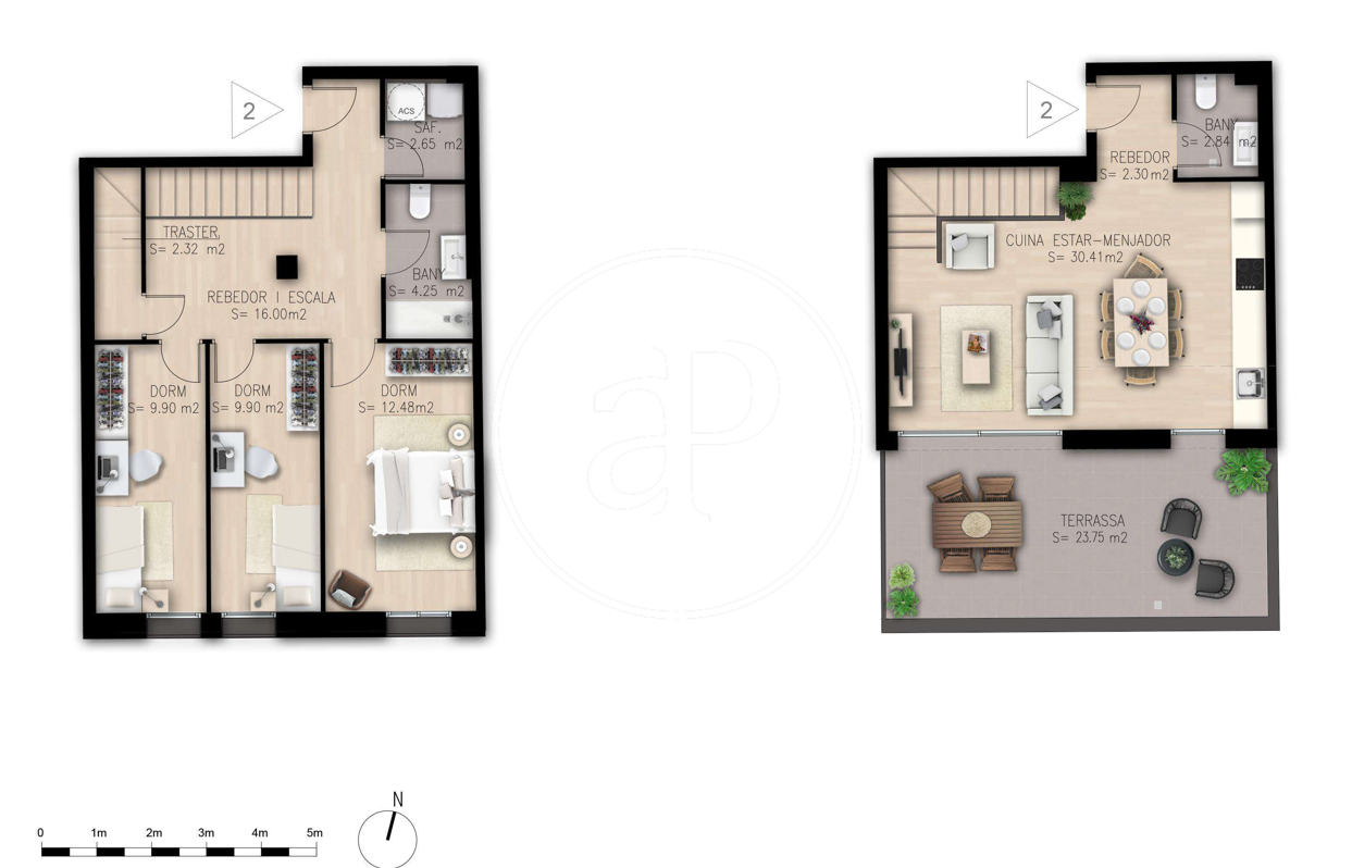 L'habitatge consta en la planta baixa de la zona de 3 habitacions àmplies i lluminoses, una d'elles doble, quarta aigüera, més un elegant i modern bany compartit. En el pis superior, comunicant totes dues plantes per una escala interior i amb ascensor per l'exterior, trobem un espai diàfan que alberga la cuina, saló i menjador en un ambient únic amb molta llum gràcies a la gran terrassa privada cara sud. Un lavabo complementa aquesta planta.