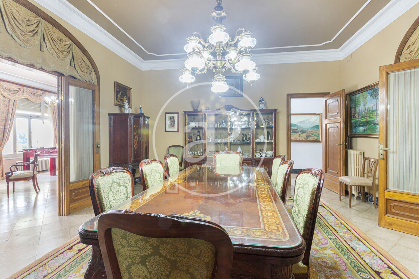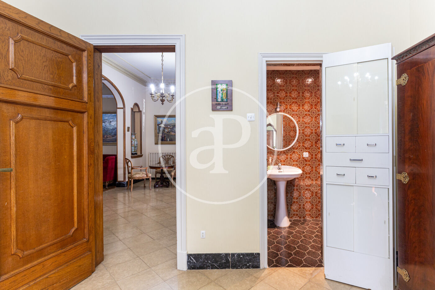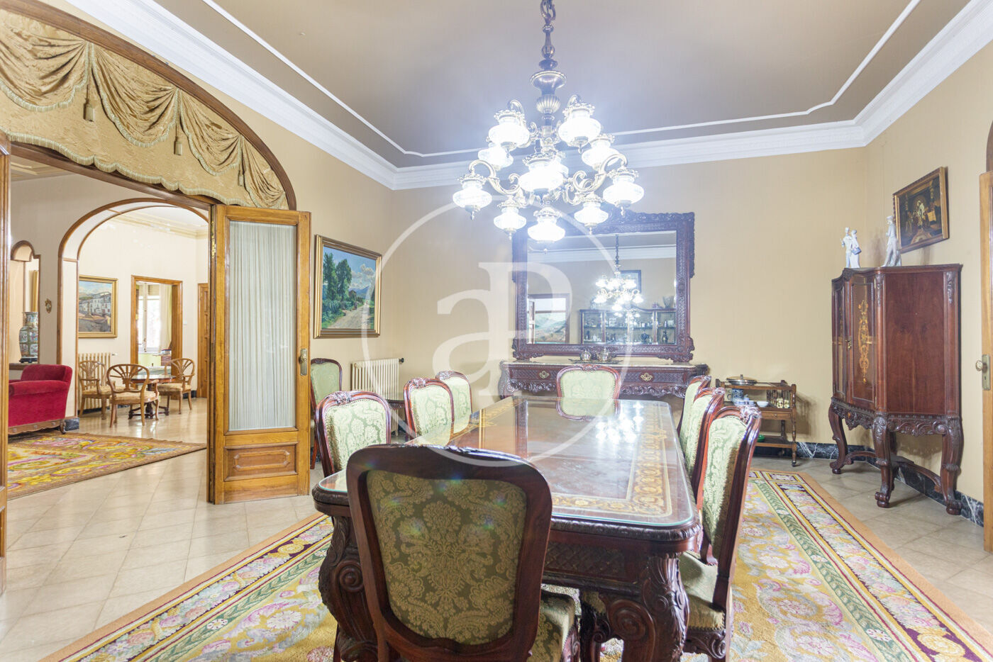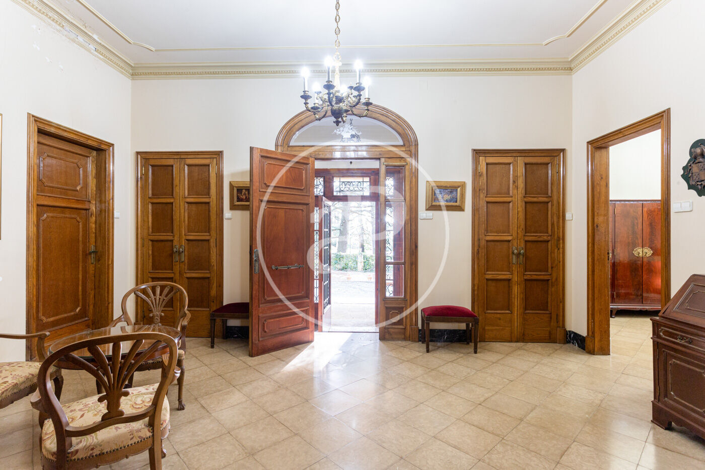 L’habitatge destaca per una harmoniosa i elegant disposició de les seves estances, organitzades al voltant d’una majestuosa sala central amb escala: