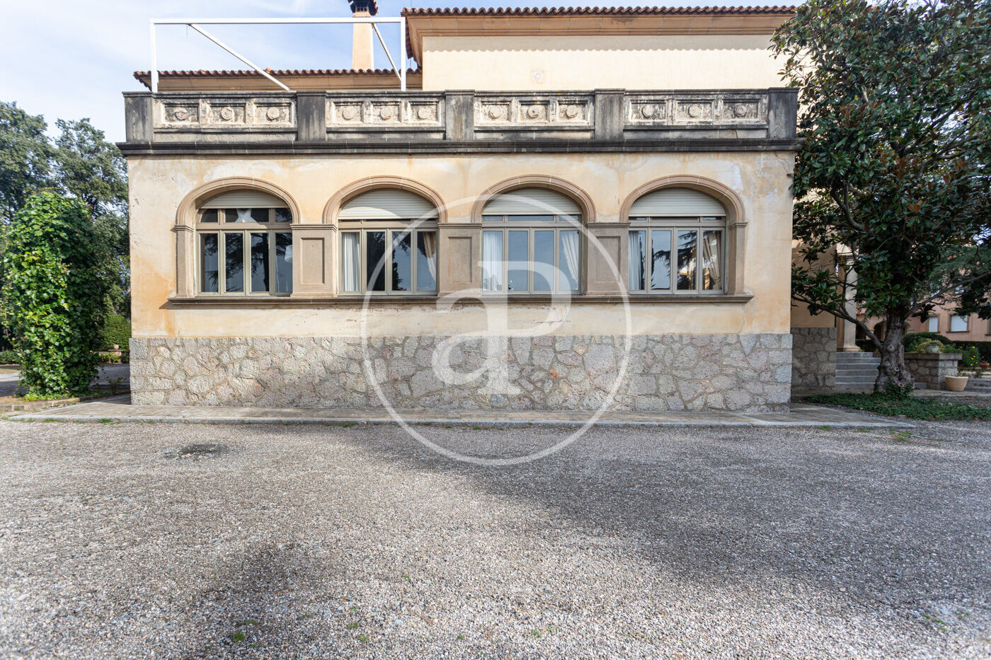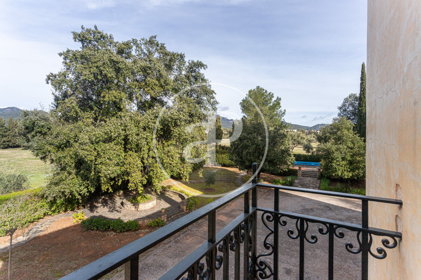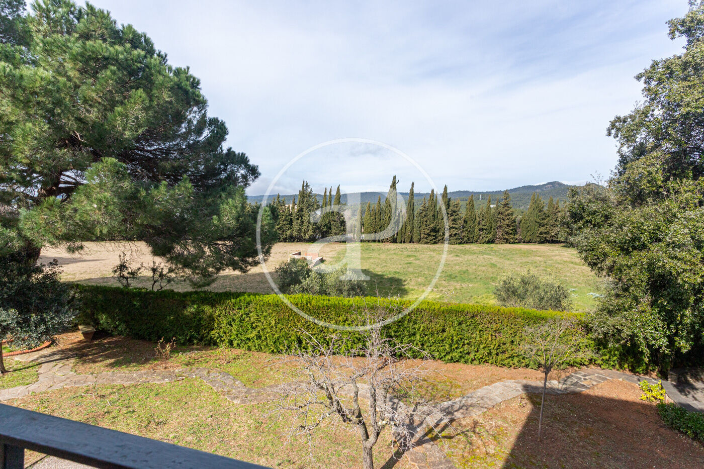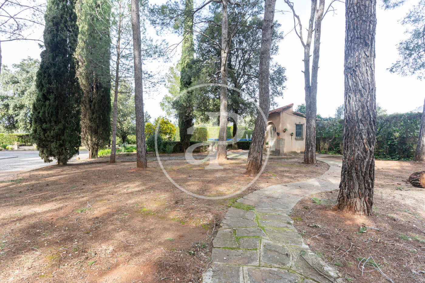 El jardí, perfectament consolidat, envolta l’habitatge creant una atmosfera d’absoluta pau, privacitat i exclusivitat, amb accés mitjançant un llarg camí privat que reforça la sensació de finca senyorial aïllada.