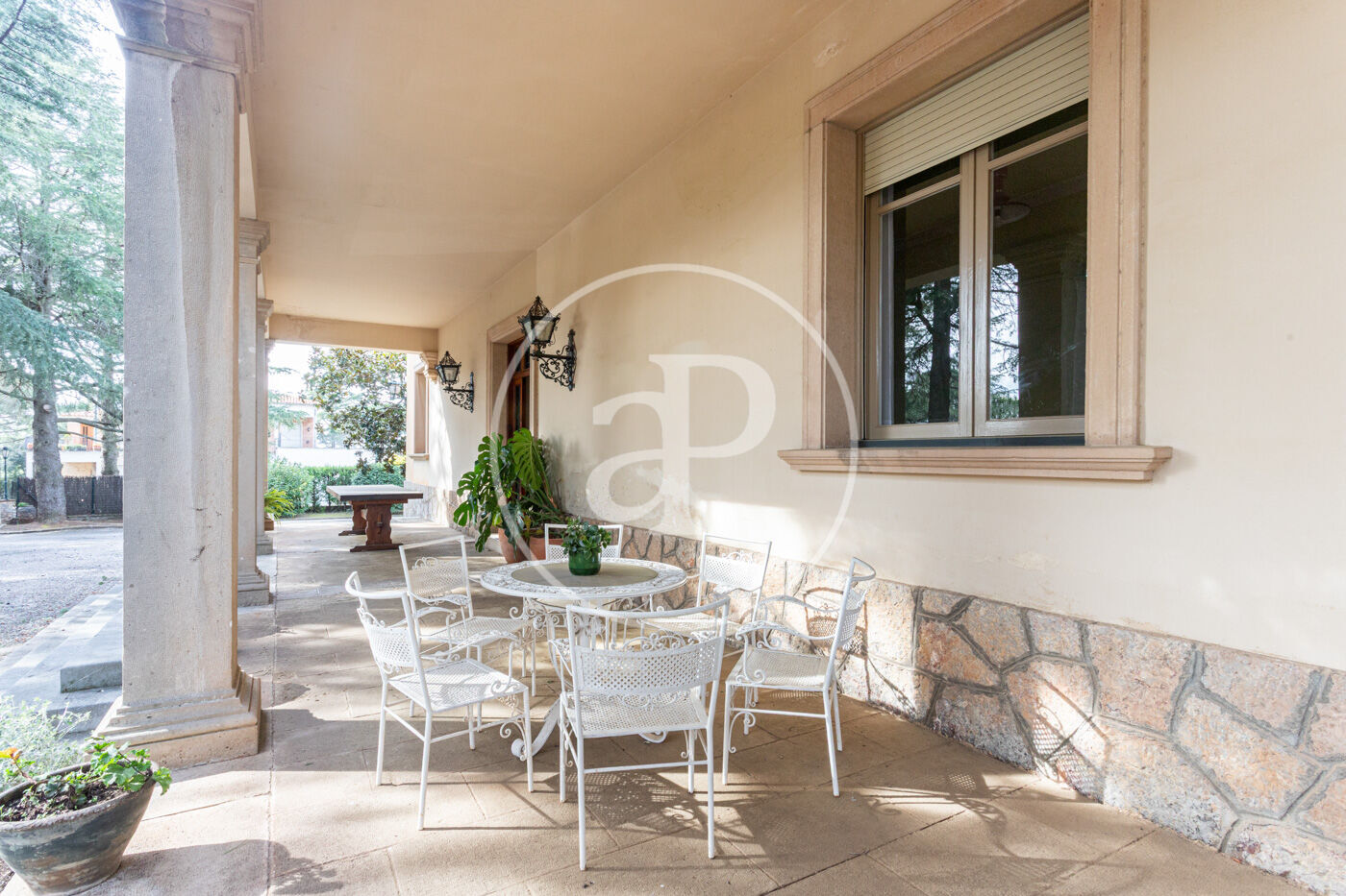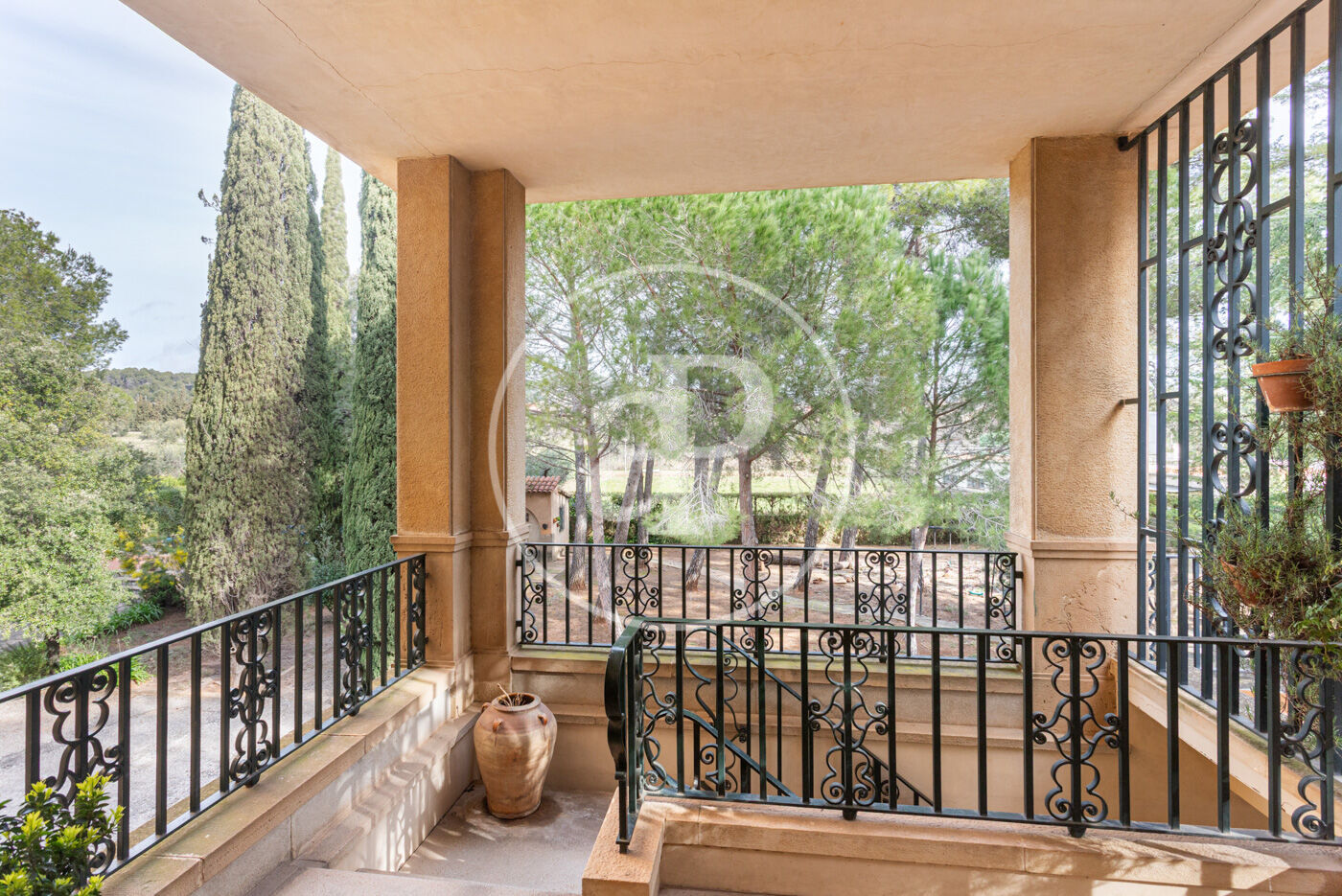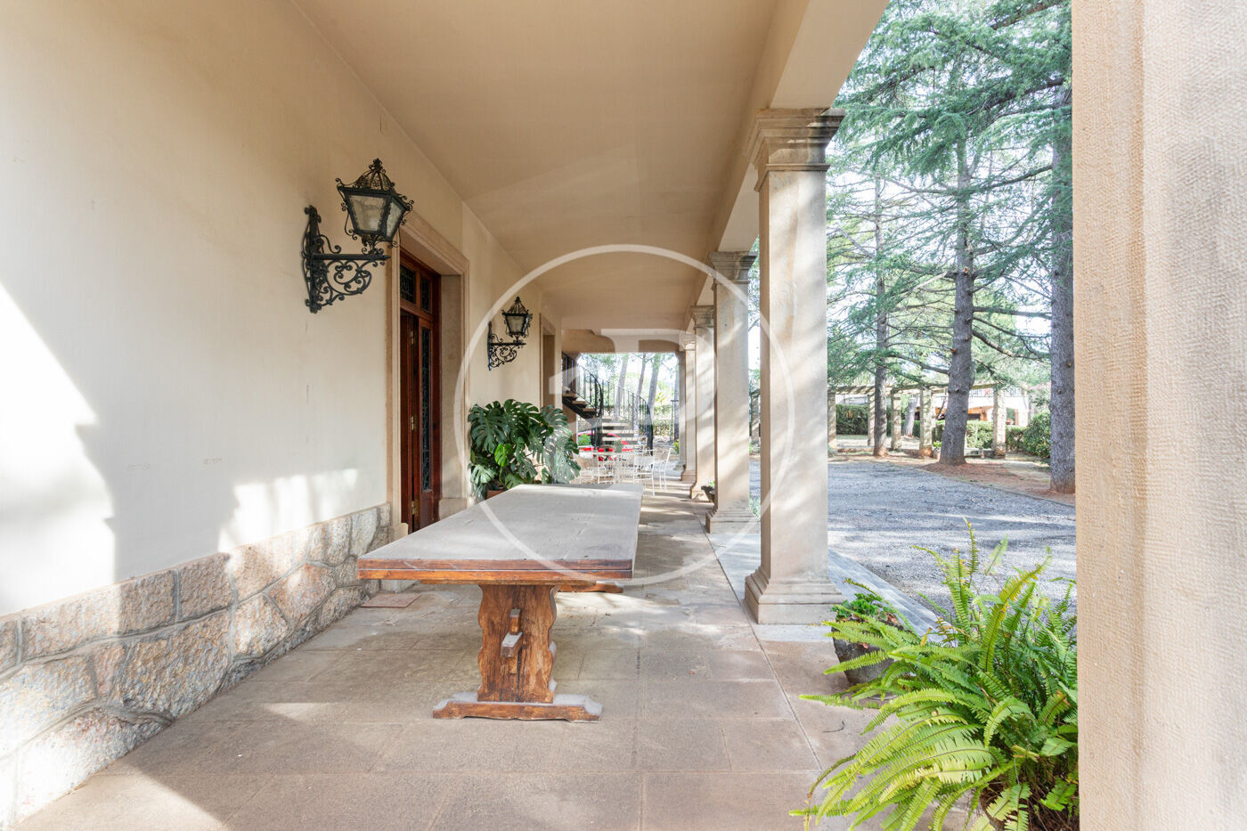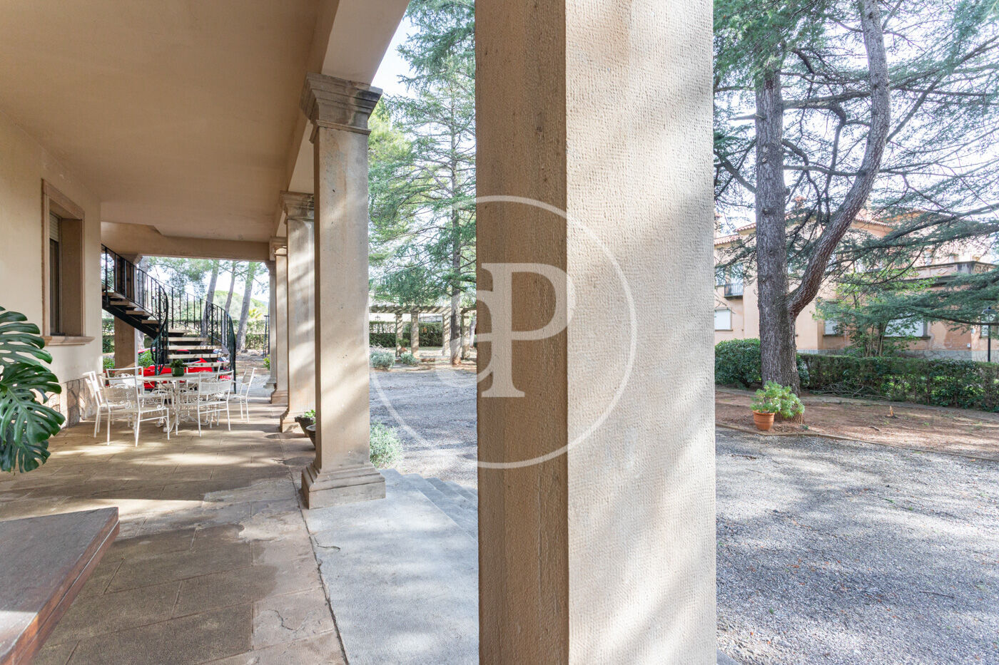 El jardí, perfectament consolidat, envolta l’habitatge creant una atmosfera d’absoluta pau, privacitat i exclusivitat, amb accés mitjançant un llarg camí privat que reforça la sensació de finca senyorial aïllada.
