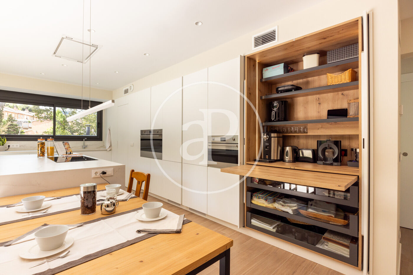 La cuina, de 30 m², es converteix en el cor de la casa gràcies a la seva illa central i els electrodomèstics SMEG d’alta gamma. Cada estança està pensada per oferir comoditat i funcionalitat: calefacció per terra radiant, aerotèrmia i sistemes amb qualificació energètica A garanteixen benestar i eficiència energètica, reflex d’un compromís clar amb la sostenibilitat.