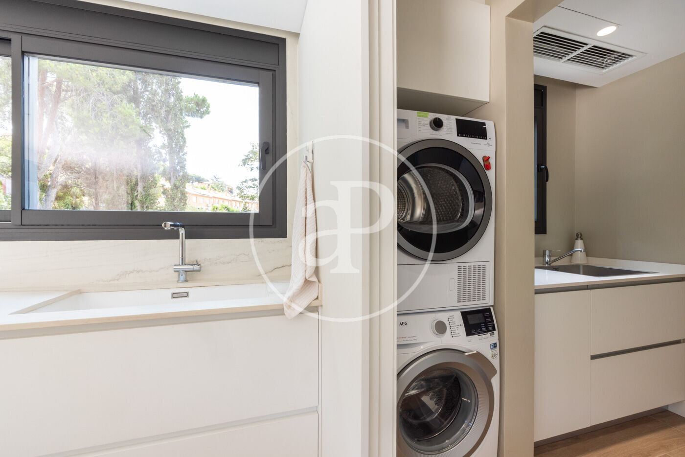 L’exterior és igualment captivador: un jardí de baix manteniment ofereix un oasi natural sense esforços, i una piscina desbordant amb aigua salada i sistema d’autoneteja Pool Vallet és la protagonista de moments inoblidables a l’aire lliure. Per completar la proposta, l’habitatge inclou sala de jocs, ampli traster, sala de màquines i un garatge amb preinstal·lació per a carregadors de vehicle elèctric, pensant en el teu futur.