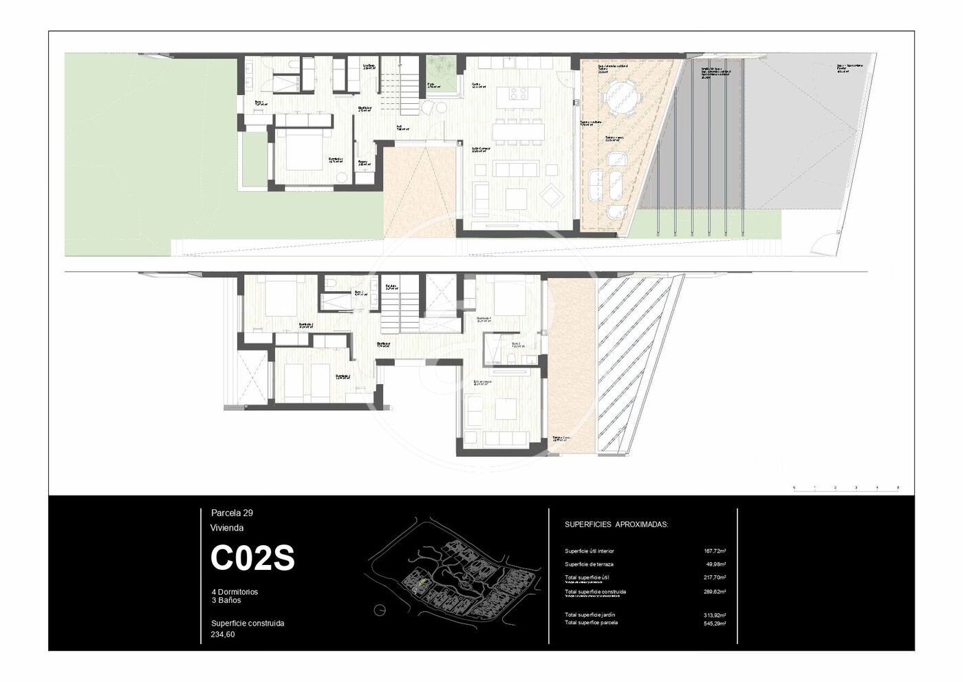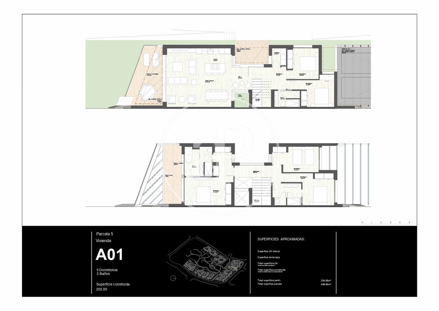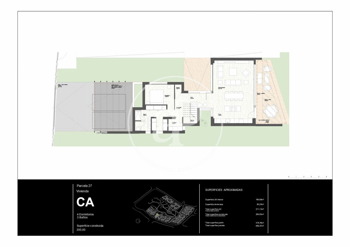 Exclusiva residència unifamiliar situada en una parcel·la de somni de 790 m² de naturalesa pura i privacitat. Amb una superfície construïda de 256 m². La casa està dissenyada per a la comoditat absoluta amb vida en una sola planta, amb accés directe des de totes les àrees a un bellíssim jardí pla, amb els seus porxos amb orientació òptima, sense piscina, però amb terreny on poder situar-la.  Comencem el nostre recorregut, travessem el distribuïdor, que ens condueix directament al saló menjador, amb xemeneia. A la dreta, una gran cuina que pot ser amb una mínima obra, integrada al saló. La cuina, amb entrada de servei, independent, sala d'aigües o rebost i accés gairebé directe al pàrquing per a dos cotxes, amb doble altura.  En la mateixa planta baixa, es troben ni més ni menys que 5 habitacions, una la màster suite, una segona suite i tres habitacions espaioses, totes amb armaris de paret.  La planta alta ofereix una àmplia sala polivalent amb accés a una terrassa panoràmica. A més, s'inclouen dos espais addicionals en aquesta planta per a adaptar-los segons les preferències individuals de cada família.  Aquesta propietat actualment es troba segregada i també s'embeni per 1.375.000€, incloent-hi el solar contigu de 635m² de la part corresponent a la piscina, en les fotos, hi ha una imatge que mostra aquesta situació tan privilegiada.  Per aquesta raó, existeix la possibilitat de construir una segona propietat enfront de la piscina, completament independent. Això ofereix l'oportunitat, tant ara com en el futur pròxim, de vendre el terreny confrontant.  La visitarem?