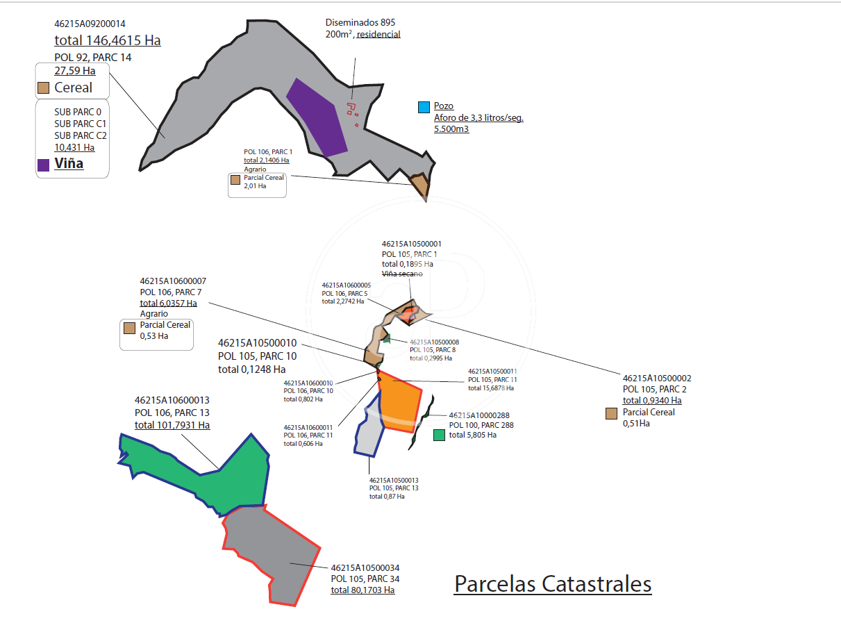 En cuanto a la explotación agrícola, actualmente se cultivan 10,41 hectáreas de viñedo con Denominación de Origen Cava, plantadas con variedades Chardonnay y Macabeo. Próximamente se iniciará un nuevo proyecto para la plantación de 4,7 hectáreas adicionales. Además, la finca cuenta con 83,27 hectáreas destinadas al cultivo de cebada, lo que refuerza su potencial como inversión agraria.