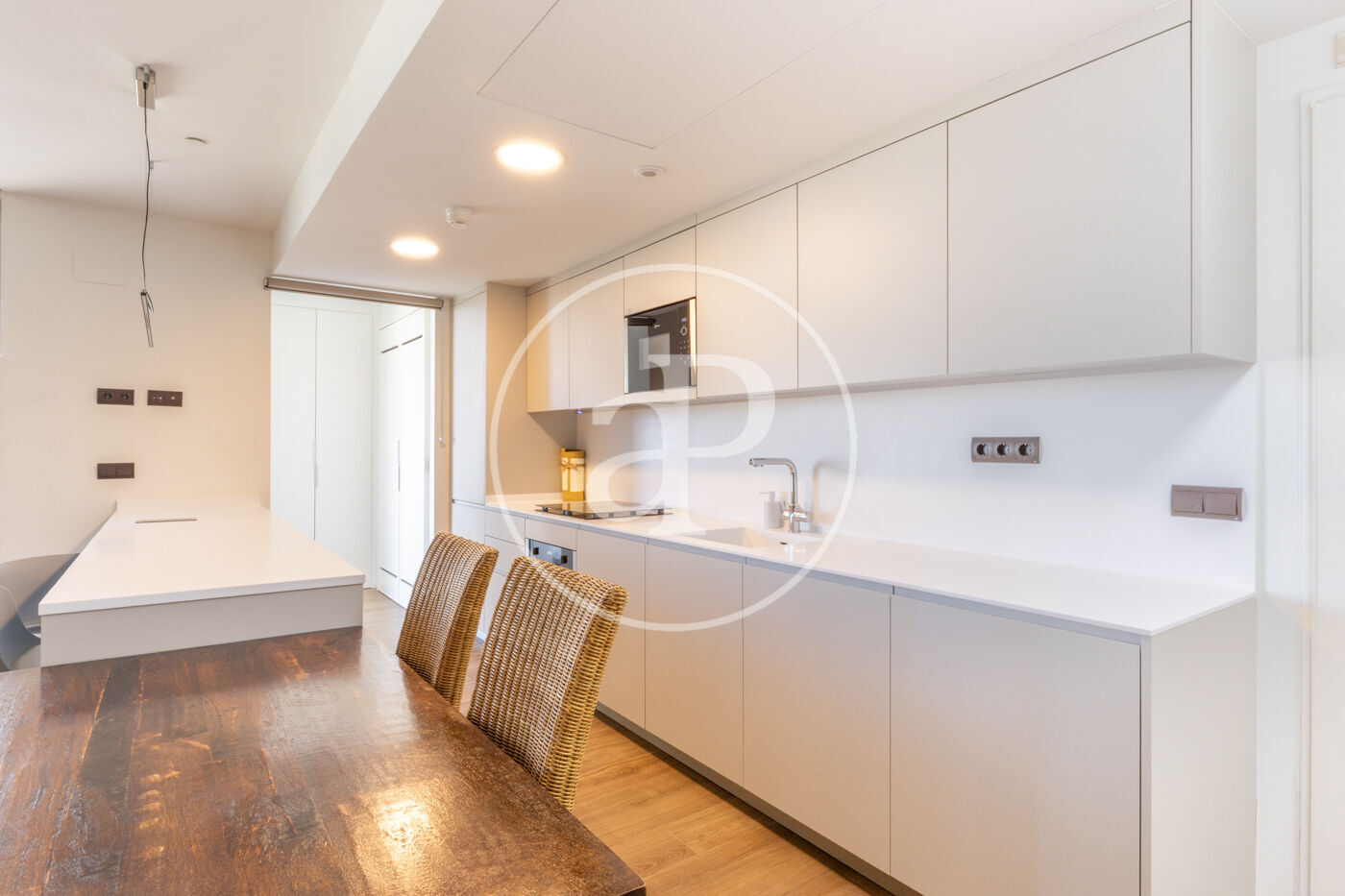 En entrar, s’accedeix a un ampli espai obert on la cuina de línies modernes s’integra amb el saló, creant una zona social espaiosa i elegant amb vistes espectaculars sobre la ciutat.
