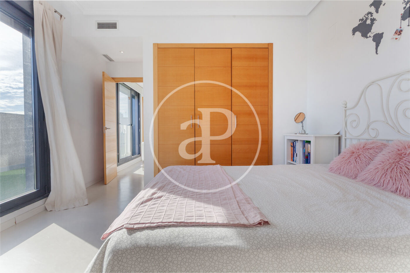 La propietat es distribueix en dues altures dissenyades amb cura. En la planta principal, un elegant espai diàfan integra el saló-menjador amb una cuina oberta de línies modernes, creant un ambient perfecte per a la convivència i el gaudi diari. En esta mateixa planta hi ha una àmplia habitació per a convidats, un bany complet i una generosa habitació doble amb bany en suite. Totes estes estances tenen accés directe a la gran protagonista de l’habitatge: una espectacular terrassa envoltant, des de la qual es despleguen impressionants vistes a la mar, a l’horta valenciana i a les muntanyes. Un escenari idíl·lic per contemplar eixides i postes de sol de somni o per celebrar reunions inoblidables amb familiars i amics al voltant de la seua magnífica taula a l’aire lliure.