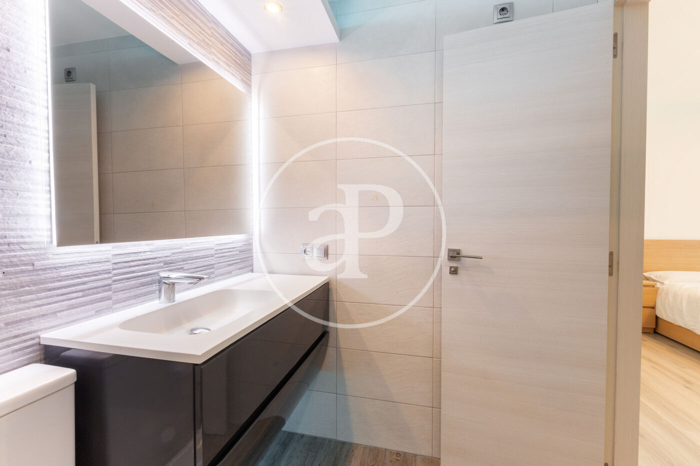 Amb una superfície de 108 m², l’habitatge ha sigut reformat amb gust i materials de qualitat, cuidant tant la funcionalitat com l’estètica. El cor de la llar és un ampli saló-menjador amb cuina americana integrada, un espai obert i lluminós, ideal per a gaudir en família o amb amics. Les tres habitacions, totes àmplies i amb armaris encastats, inclouen una suite amb bany privat. Ambdós banys complets segueixen una línia de disseny contemporani i elegant.