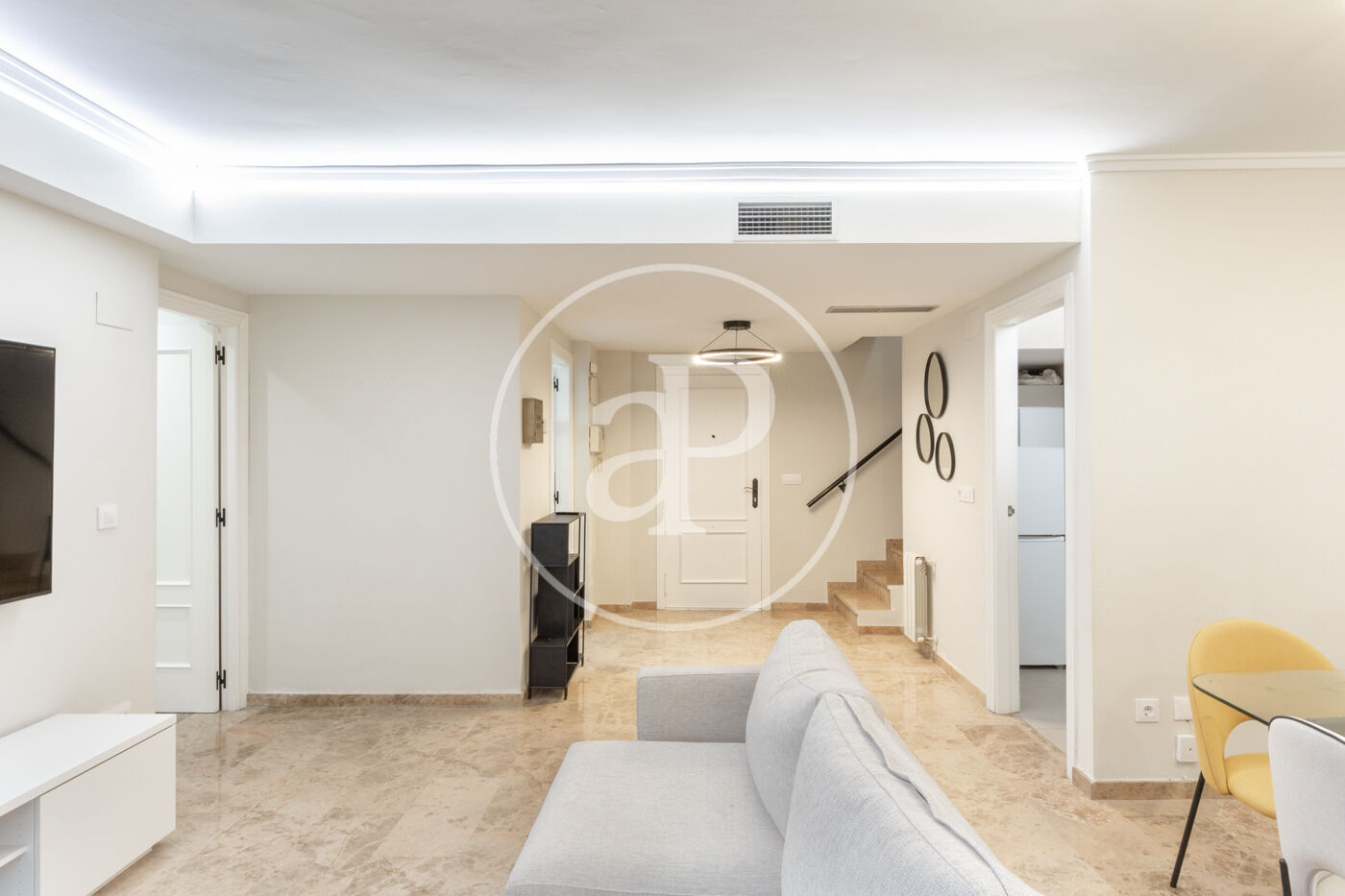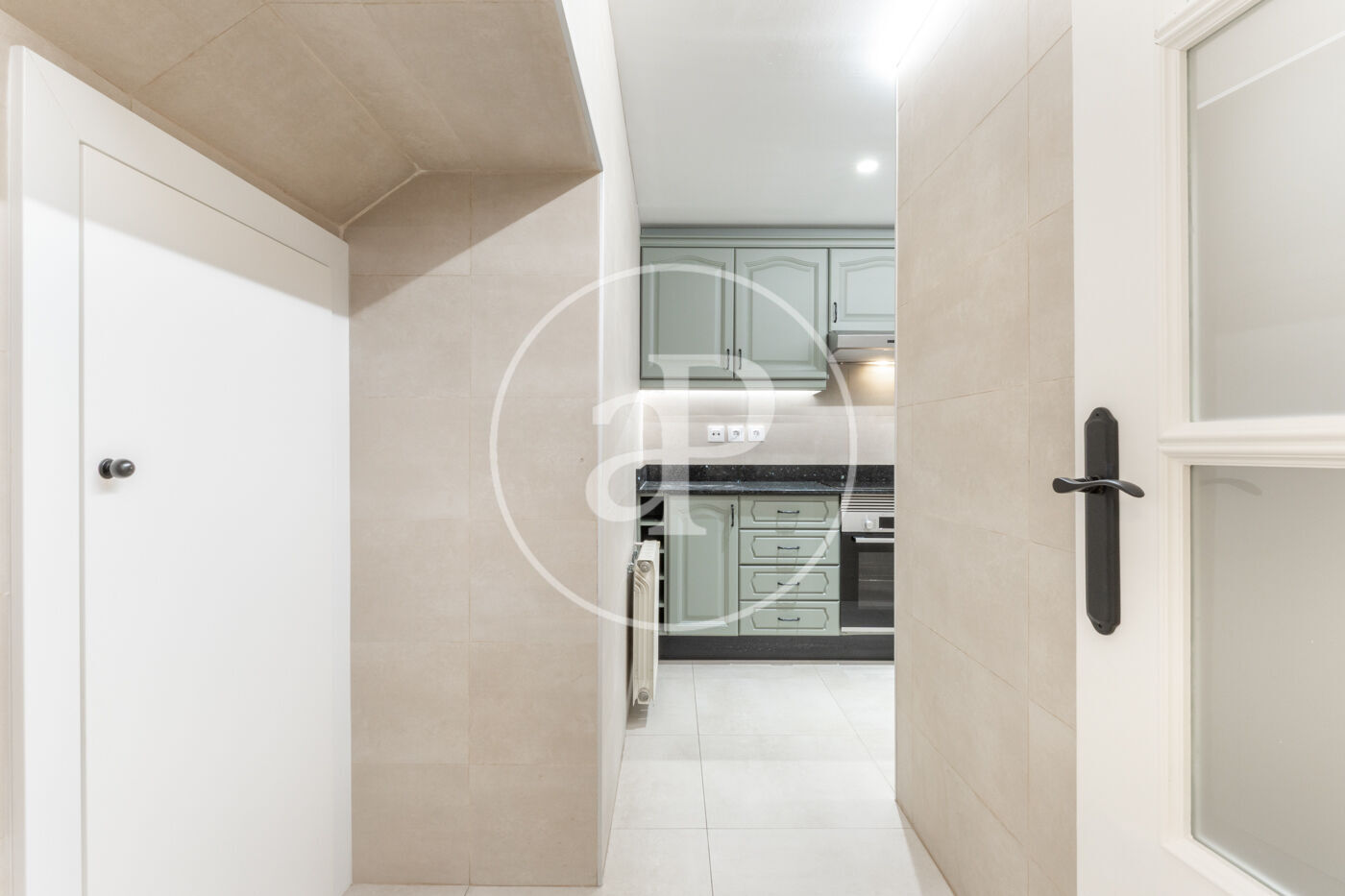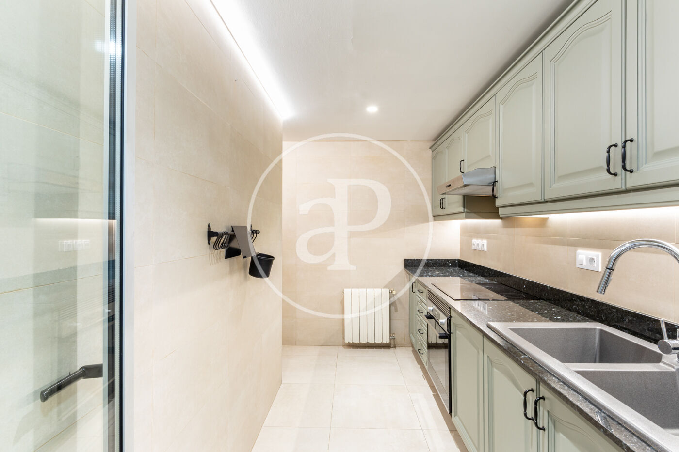 El gran saló-menjador, també completament moblat, ofereix vistes al carrer. La cuina, independent i equipada amb electrodomèstics d'alta gamma, destaca pel seu disseny elegant i funcional, creant un ambient acollidor.