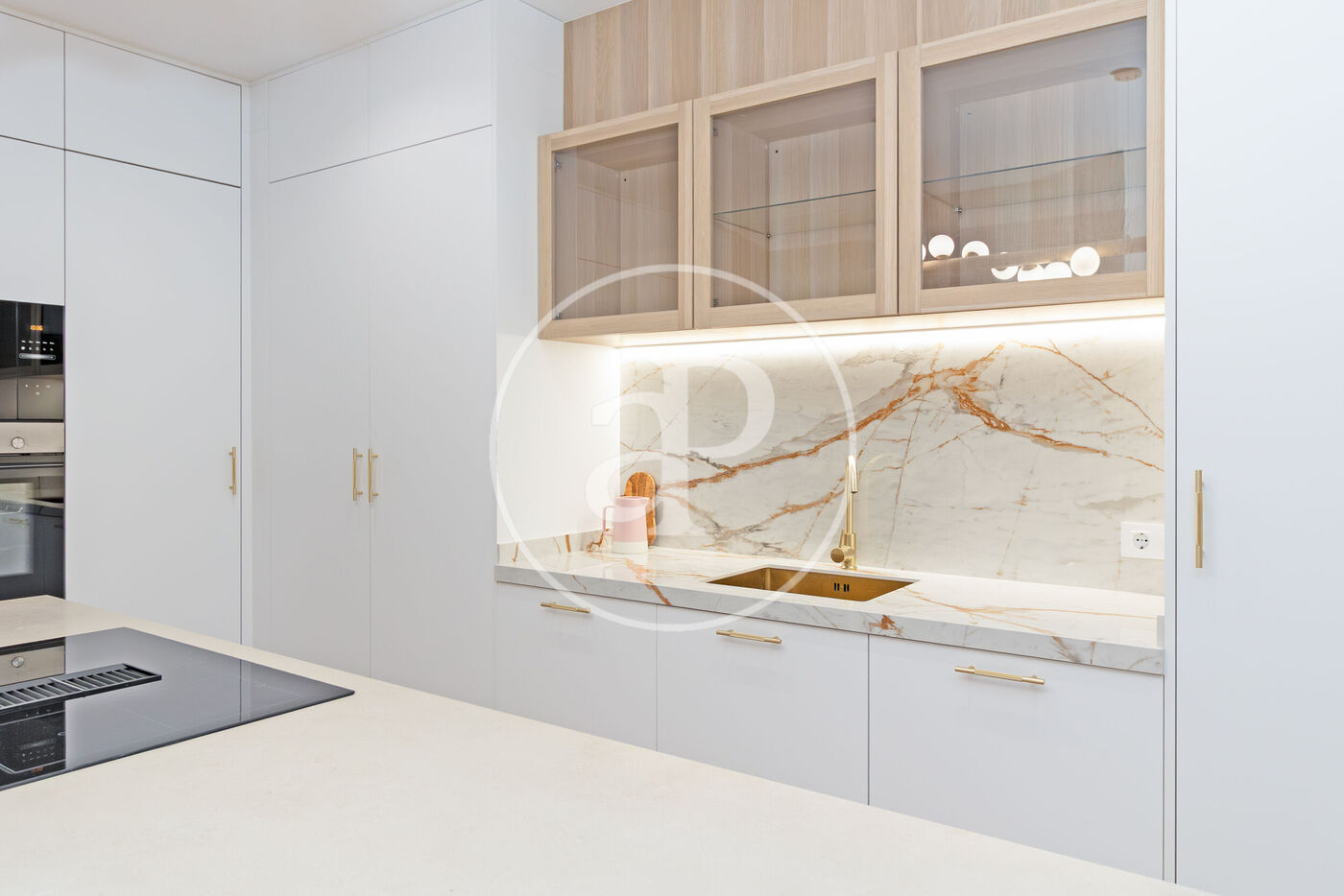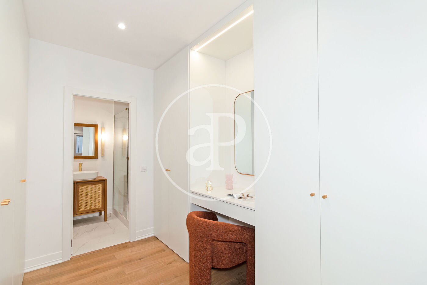 Ubicada en un edifici de 1940, l’immoble compta amb una superfície total de 144 metres quadrats. La distribució inclou quatre dormitoris, dos banys (un d’ells en suite), un ampli saló-menjador amb cuina integrada, zona de rentat i traster dins de l’habitatge. Els acabats d’alta qualitat, com els sòls laminats de to clar, electrodomèstics de cuina d’última generació i armaris encastats, aporten funcionalitat i elegància.