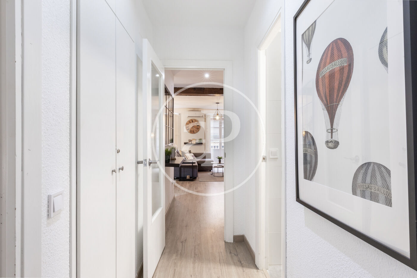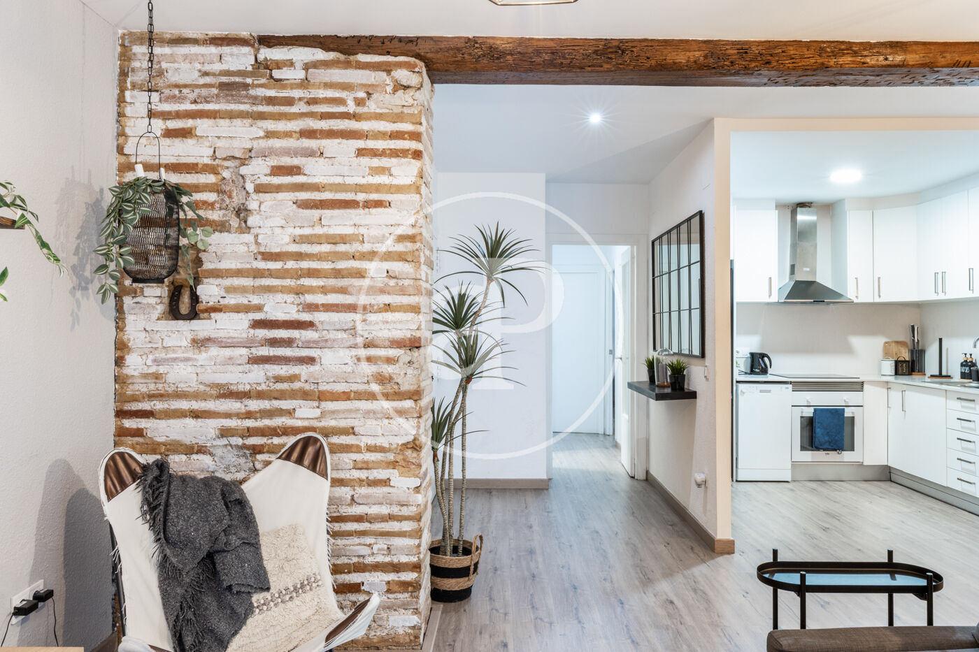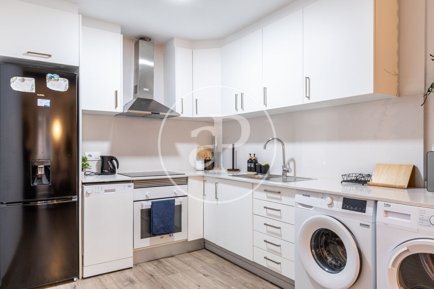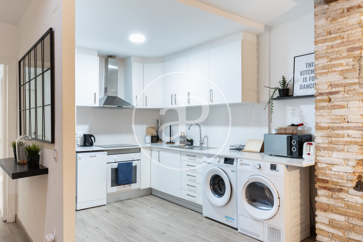 El saló-menjador és ampli i molt lluminós, amb dos ambients clarament diferenciats —zona d’estar i zona de menjador— i una cuina oberta, espaiosa i perfectament integrada en el conjunt, ideal tant per al dia a dia com per a rebre convidats. Des del saló s’accedeix a dos balcons exteriors al carrer, que aporten abundant llum natural i un agradable caràcter urbà a l’habitatge.