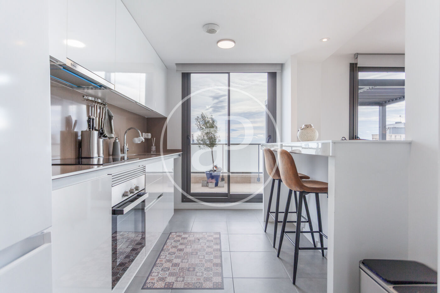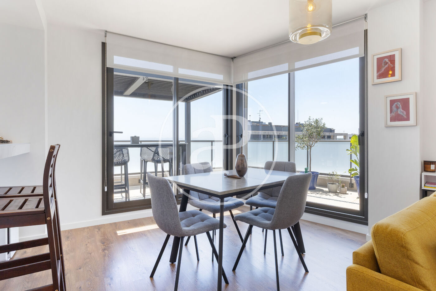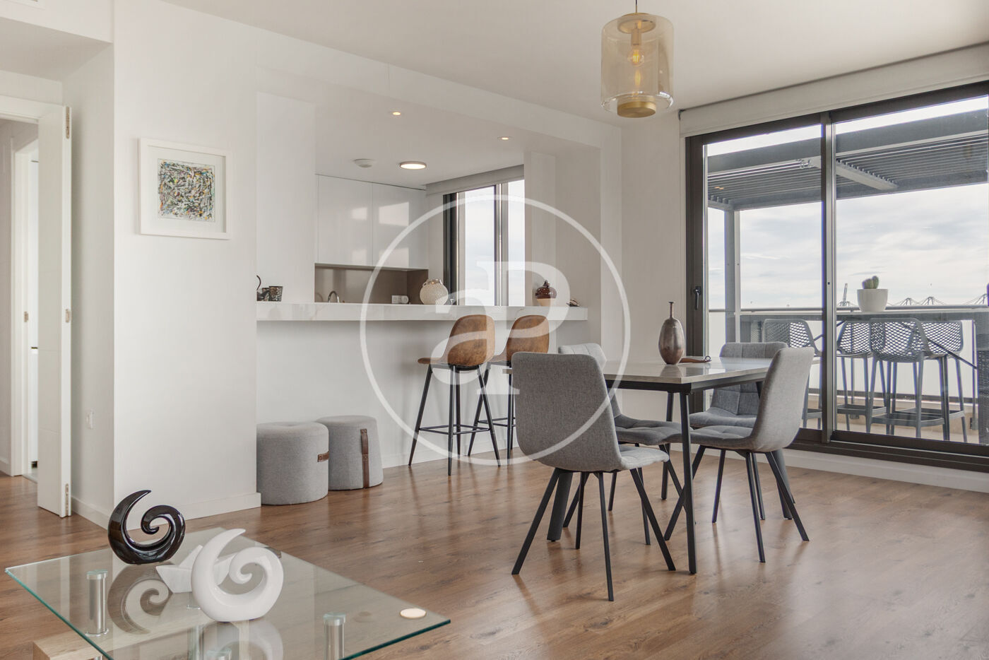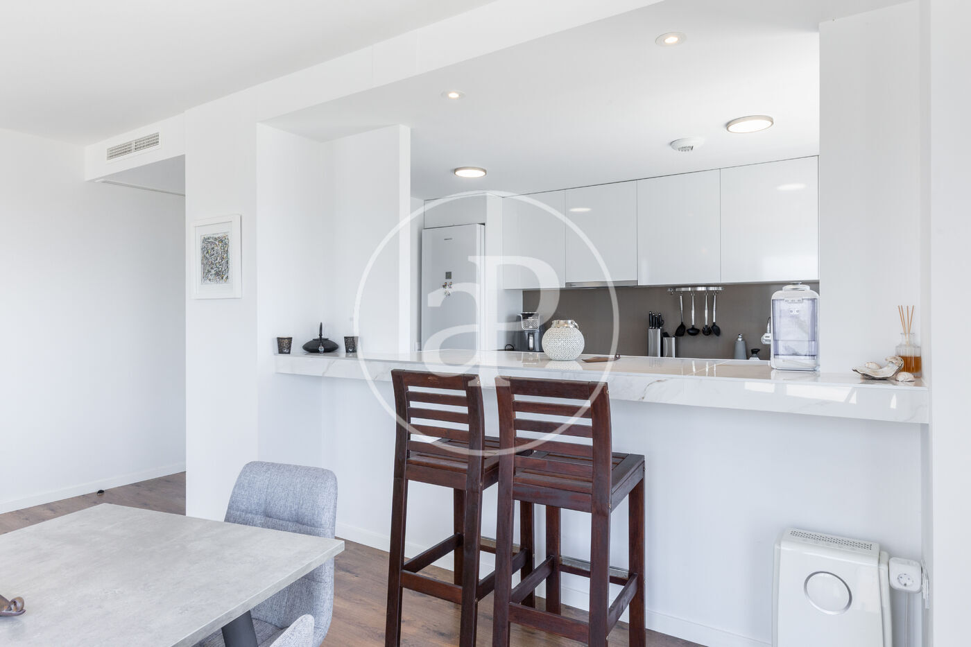 Aquest àtic de luxe es distingeix pel seu disseny minimalista i elegant, que combina funcionalitat i estètica en perfecta harmonia. En entrar a la propietat, ens trobem amb una cuina oberta, equipada amb electrodomèstics d’alta gamma, que s’integra amb una magnífica illa central. Aquest espai comunica fluidament amb un ampli saló menjador, tots dos amb accés directe a la terrassa, creant un ambient ideal per al gaudi i la convivència.