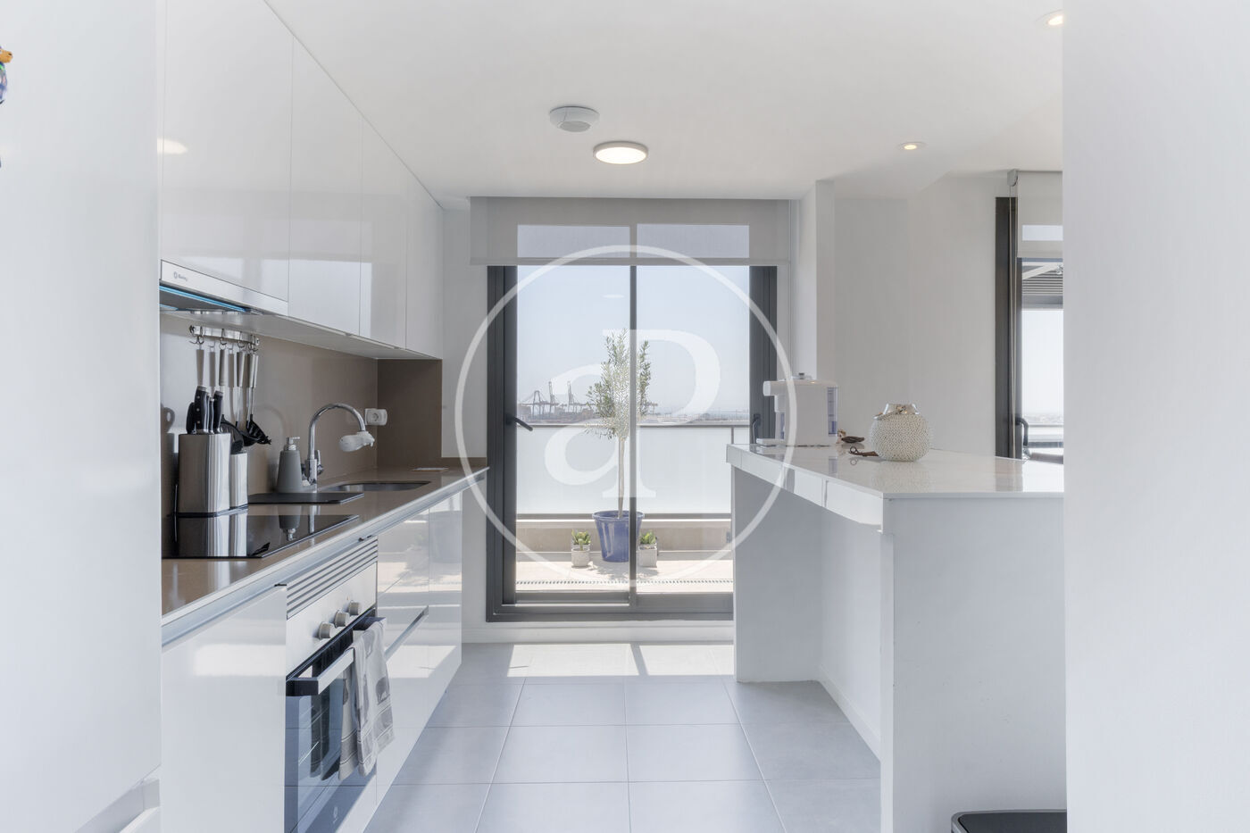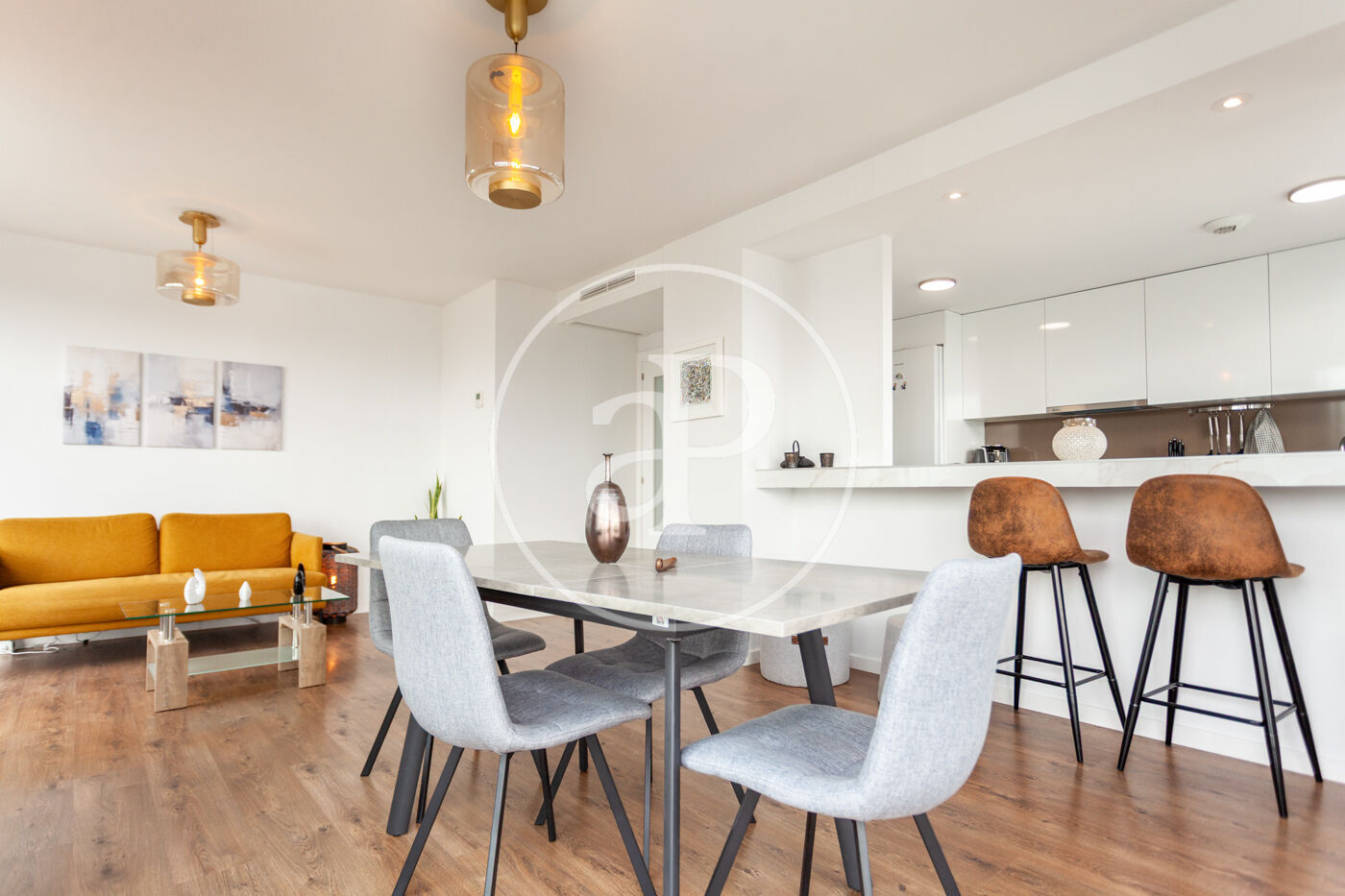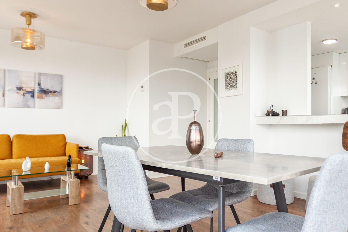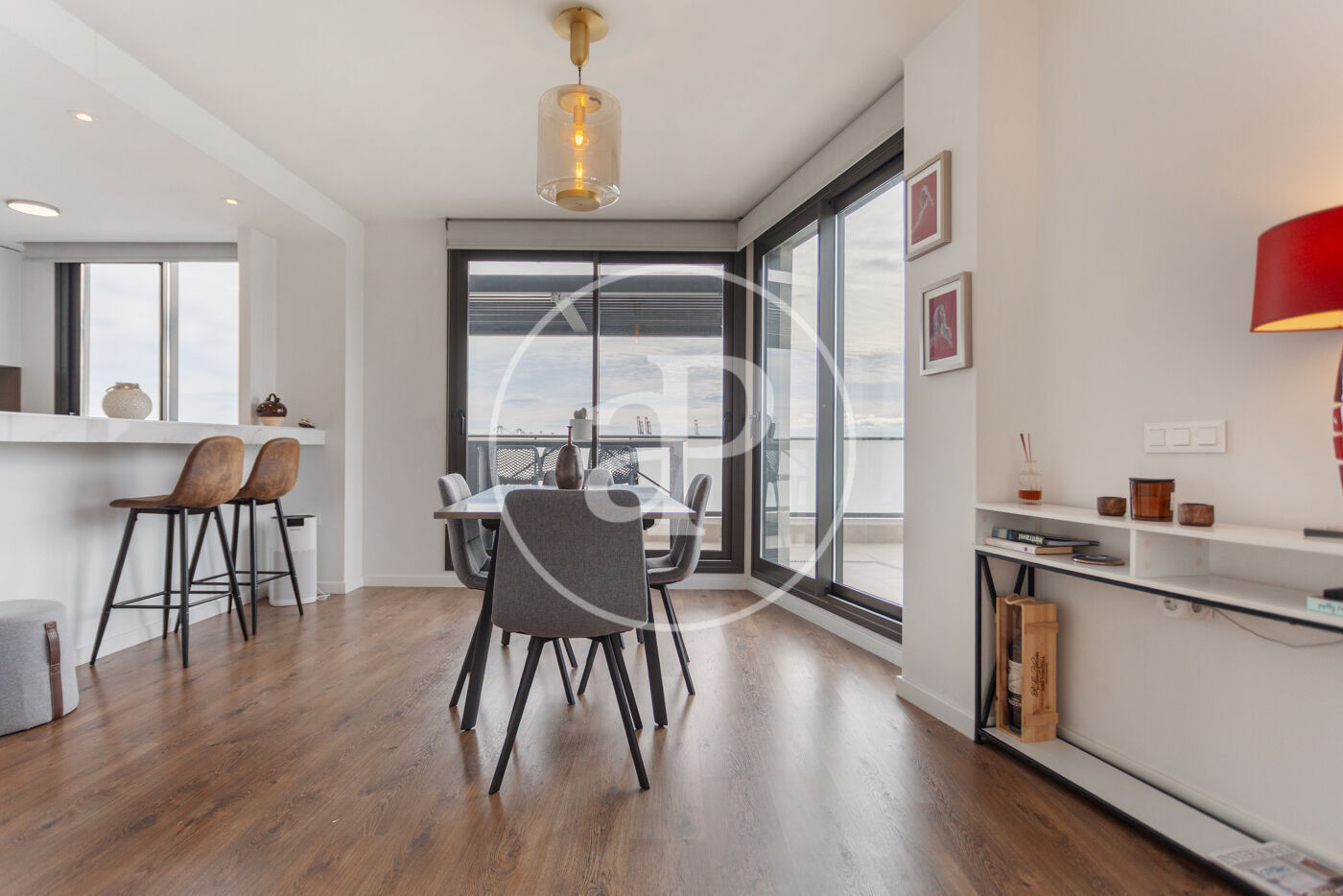 Aquest àtic de luxe es distingeix pel seu disseny minimalista i elegant, que combina funcionalitat i estètica en perfecta harmonia. En entrar a la propietat, ens trobem amb una cuina oberta, equipada amb electrodomèstics d’alta gamma, que s’integra amb una magnífica illa central. Aquest espai comunica fluidament amb un ampli saló menjador, tots dos amb accés directe a la terrassa, creant un ambient ideal per al gaudi i la convivència.
