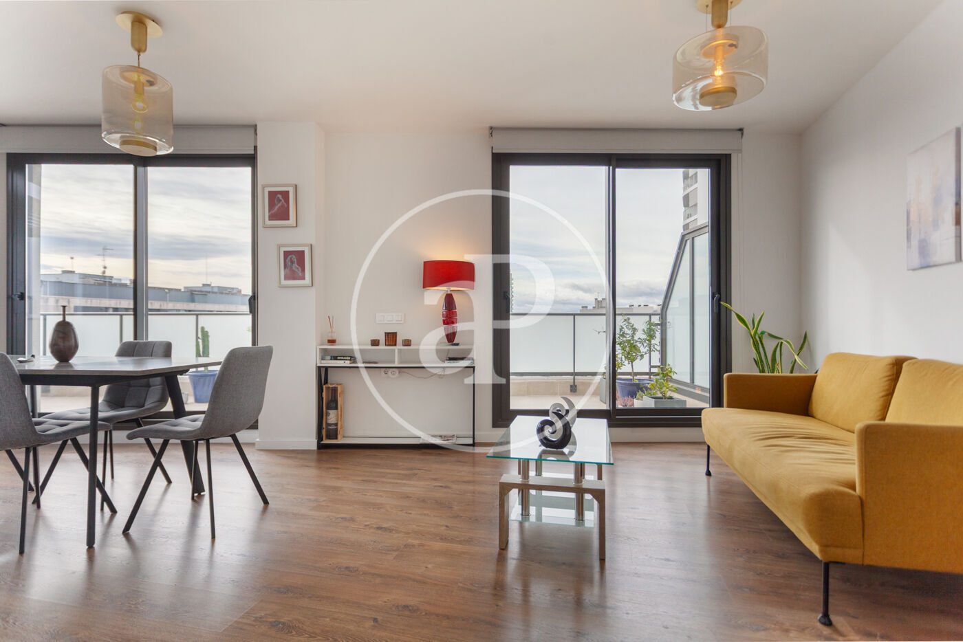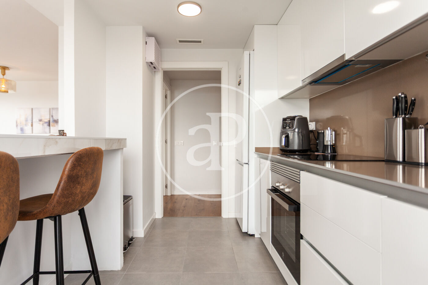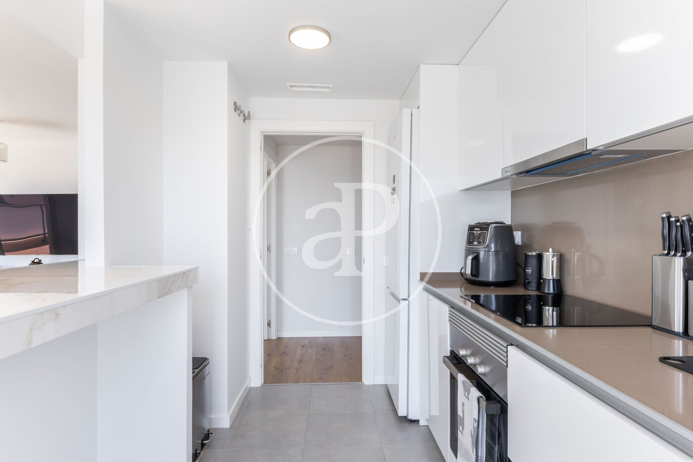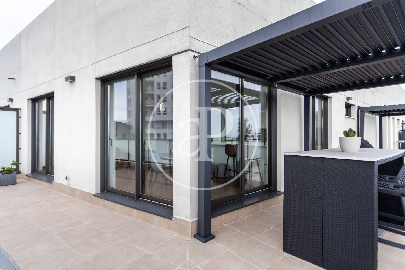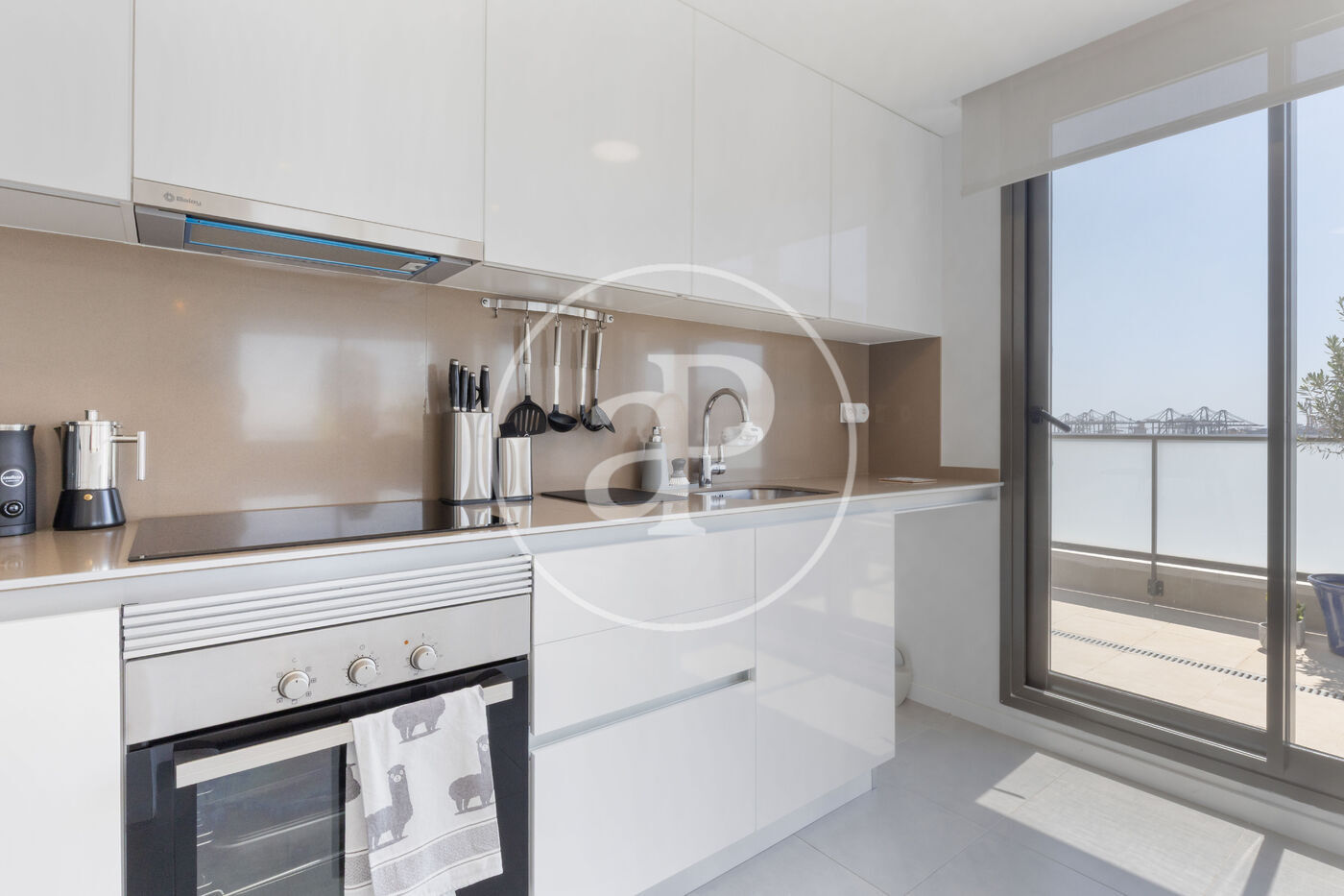 Aquest àtic de luxe es distingeix pel seu disseny minimalista i elegant, que combina funcionalitat i estètica en perfecta harmonia. En entrar a la propietat, ens trobem amb una cuina oberta, equipada amb electrodomèstics d’alta gamma, que s’integra amb una magnífica illa central. Aquest espai comunica fluidament amb un ampli saló menjador, tots dos amb accés directe a la terrassa, creant un ambient ideal per al gaudi i la convivència.